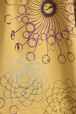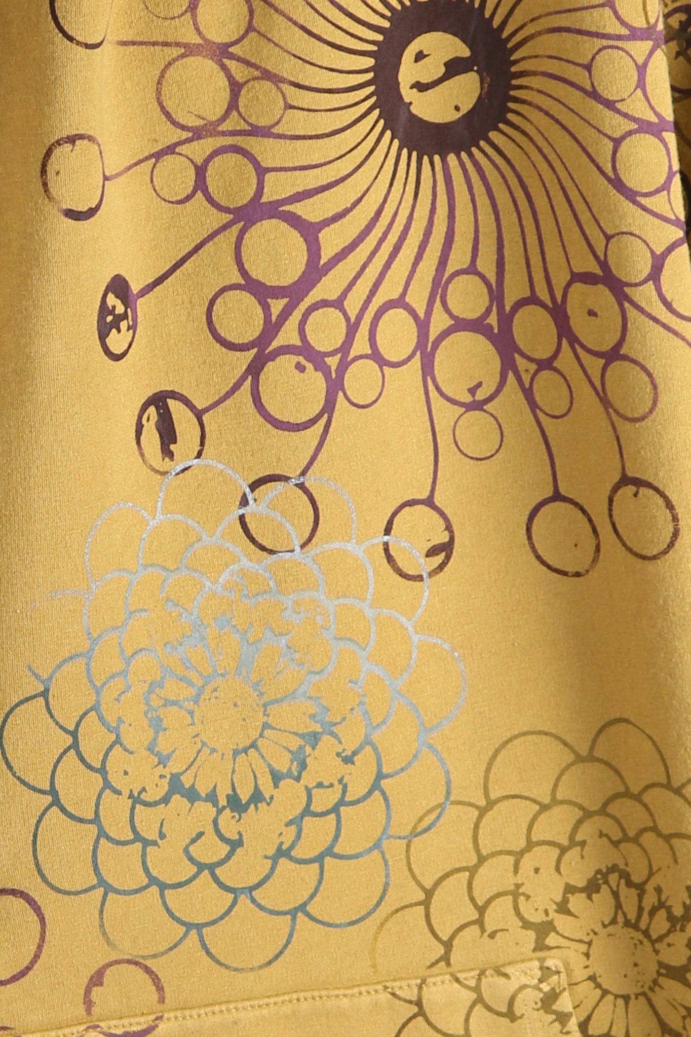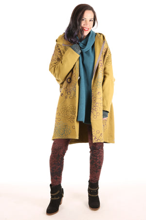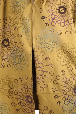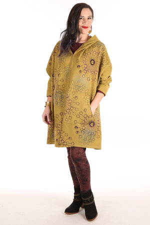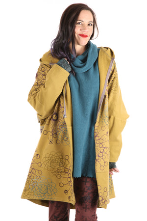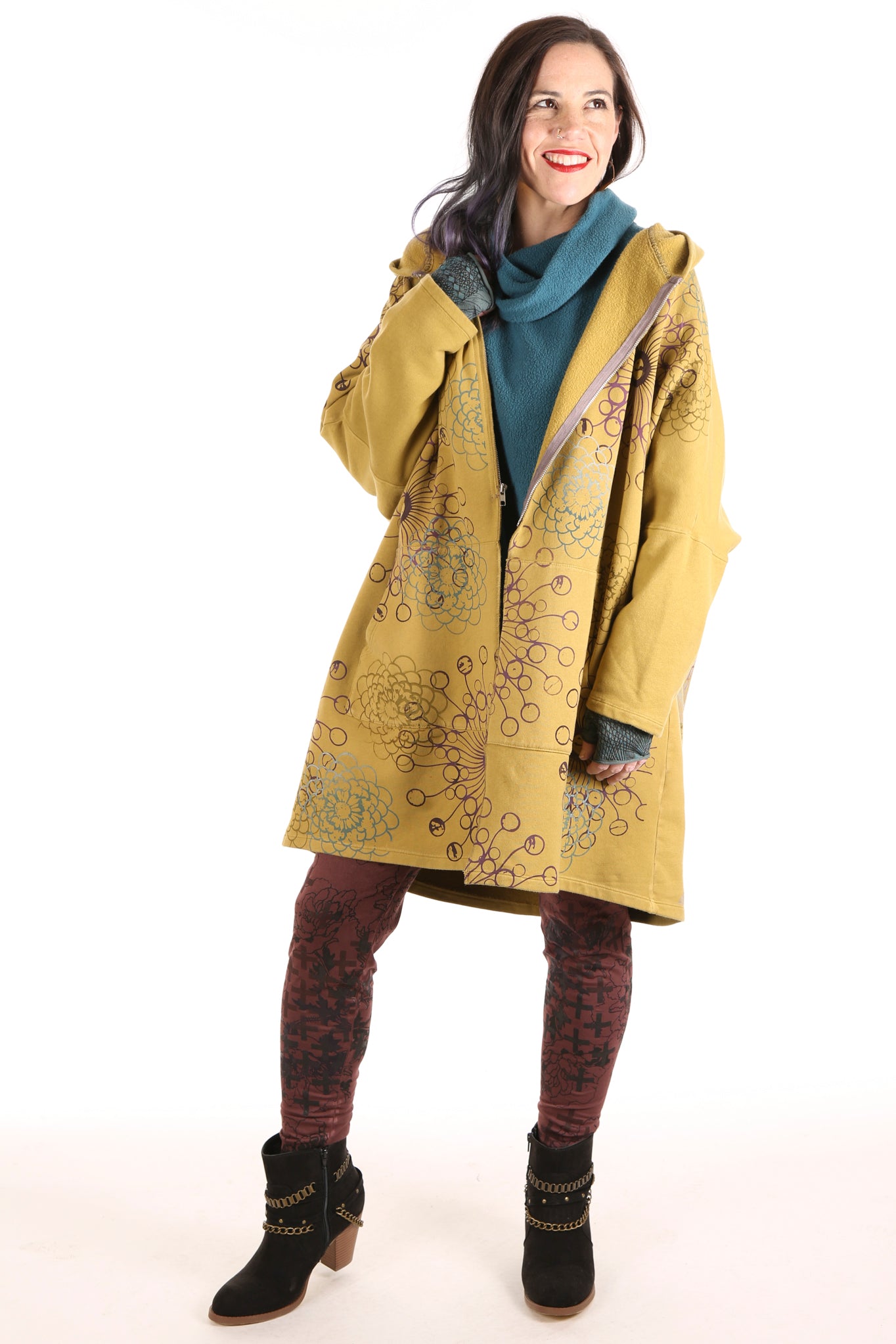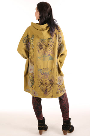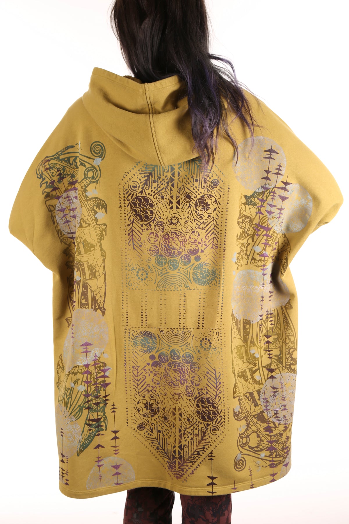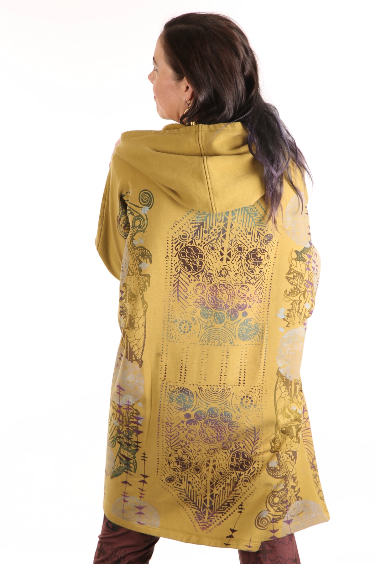 A colorful & artfully hand printed art piece printed on the front and the back which is a cozy and warm hoodie, made from our thick, organic heavy stretch fleece.