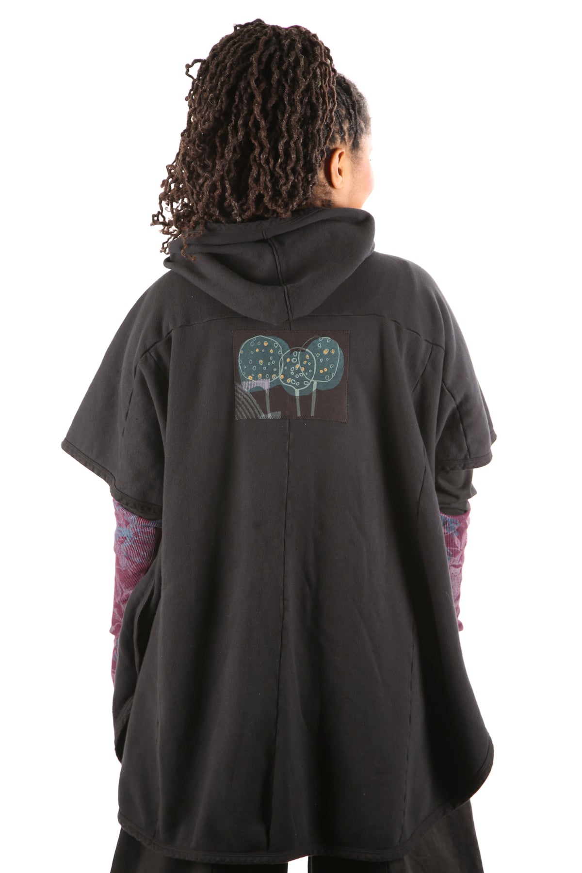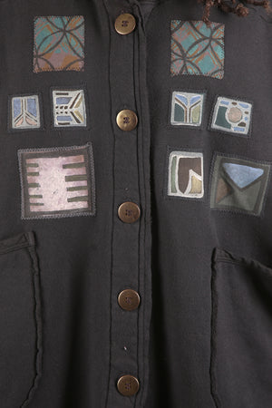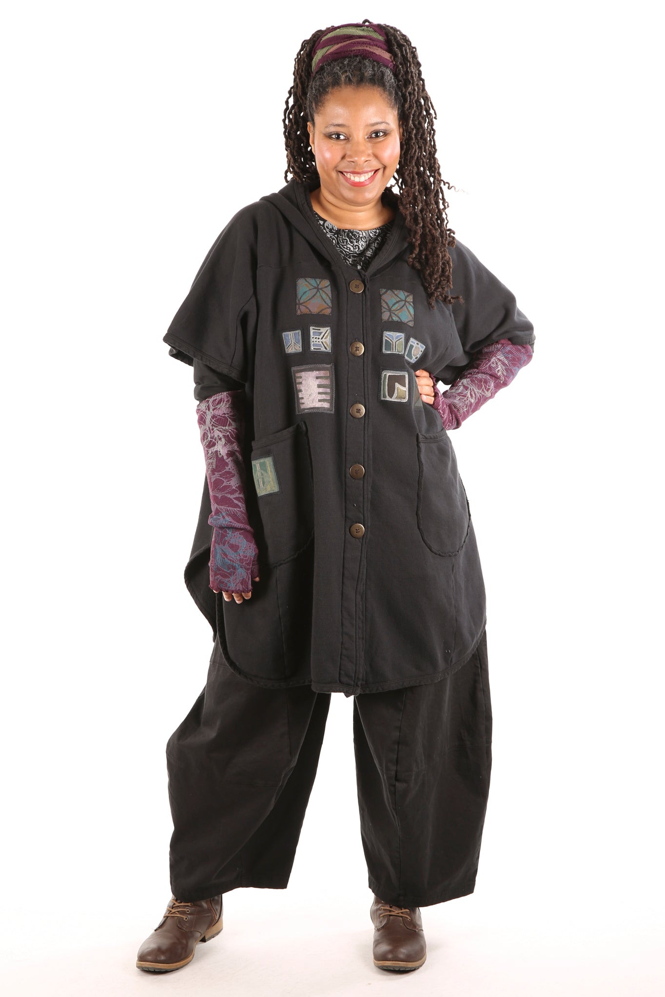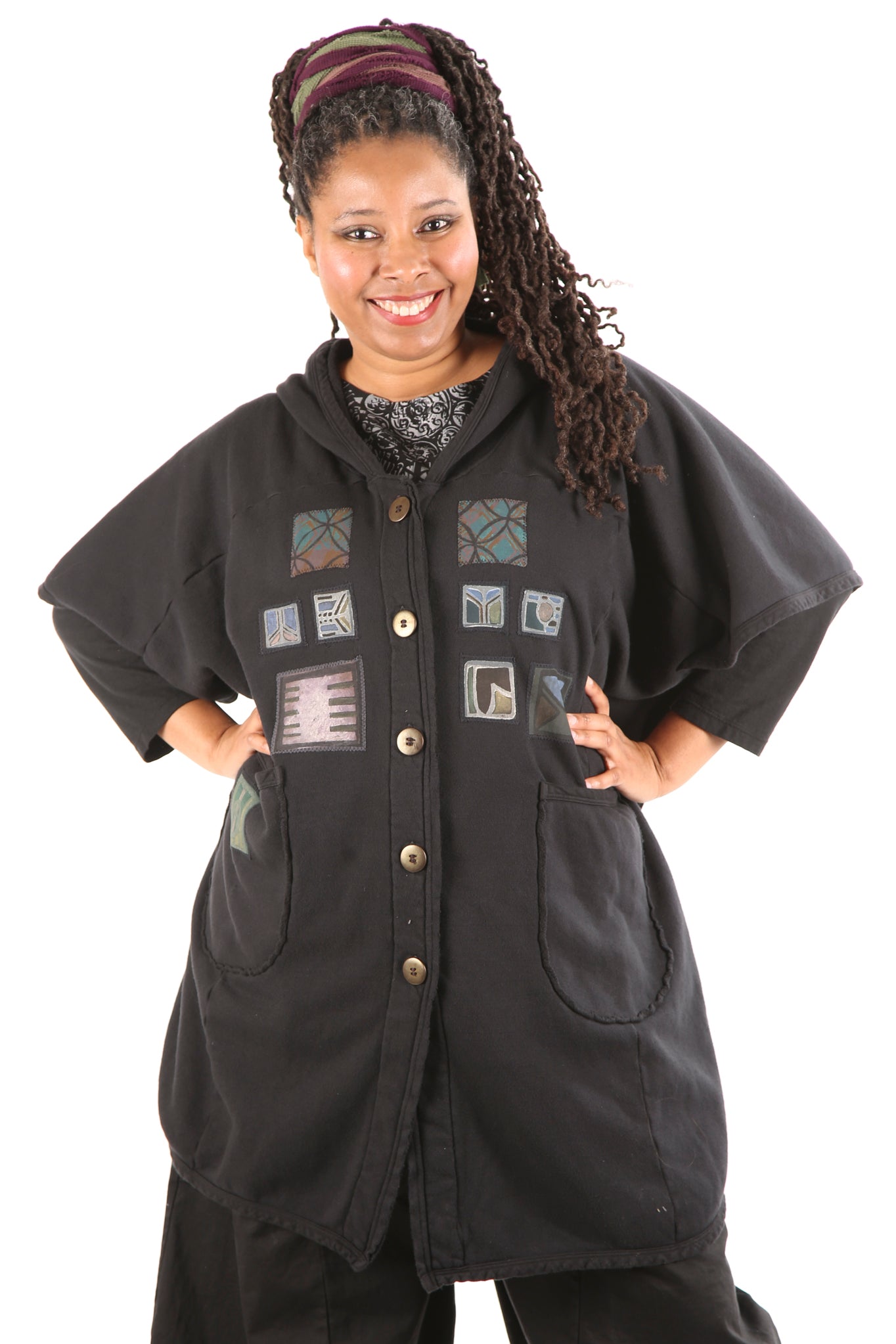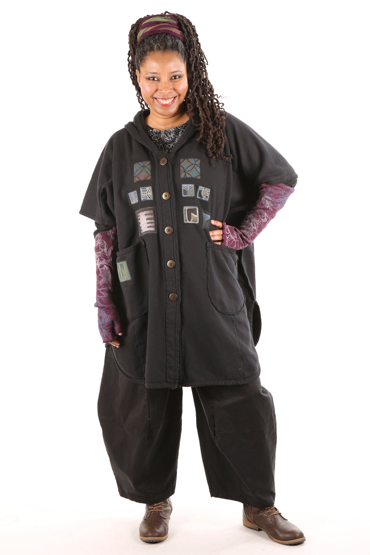 Yes. Don't wait! Limited edition, thick, not heavy, cozy warm organic sherpa knit just for us- a NEW fabric with sherpa softness on the inside, Red tones, flower, bird patches vintage style blue fish block printed, artful designs on the outside. Generous fit, POCKETS, button front, hemline scoops. You can even turn it inside-out for a different look and texture. Whatever you call it vest/ poncho-cape...keep it close, you will want to live in it.