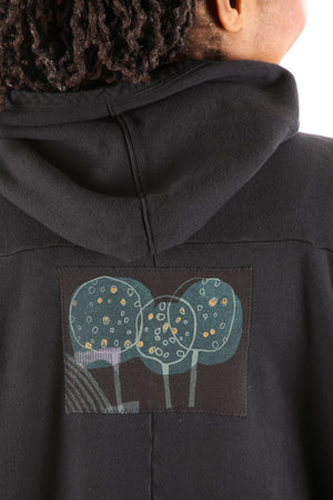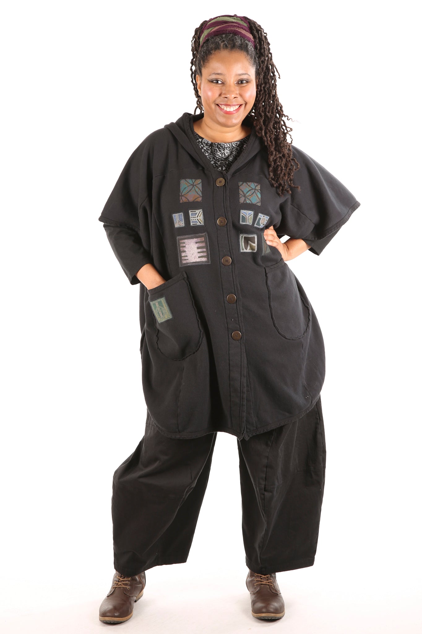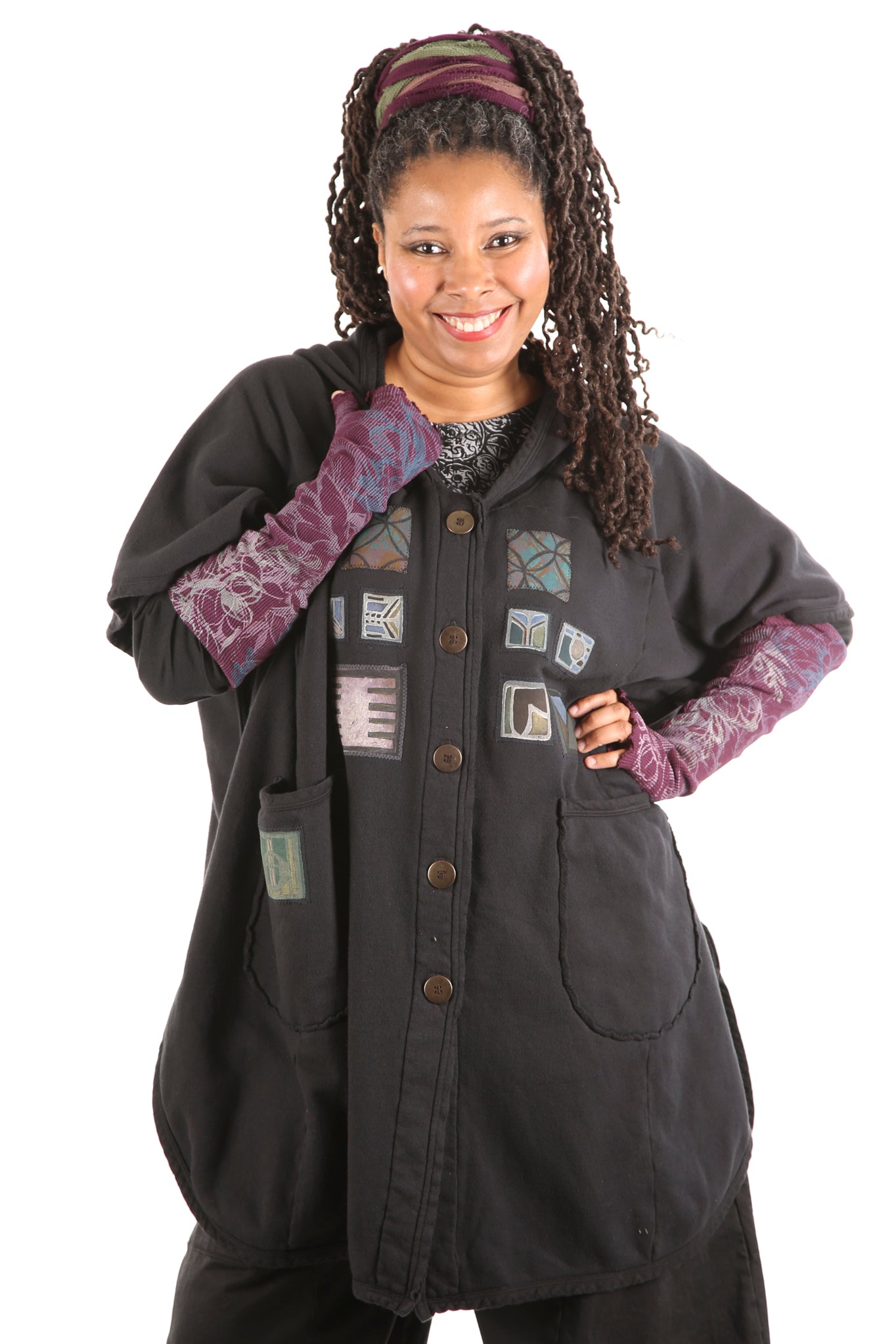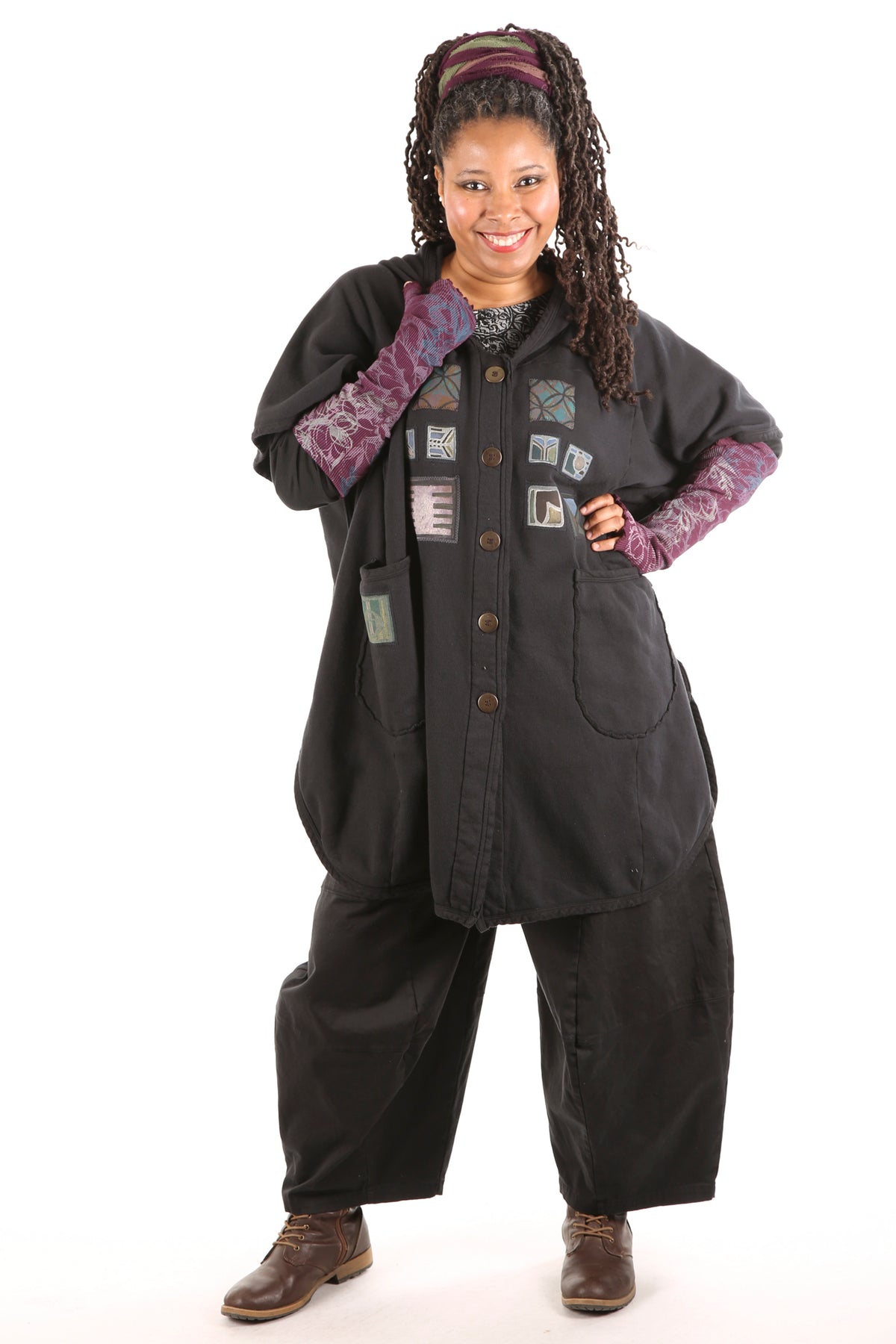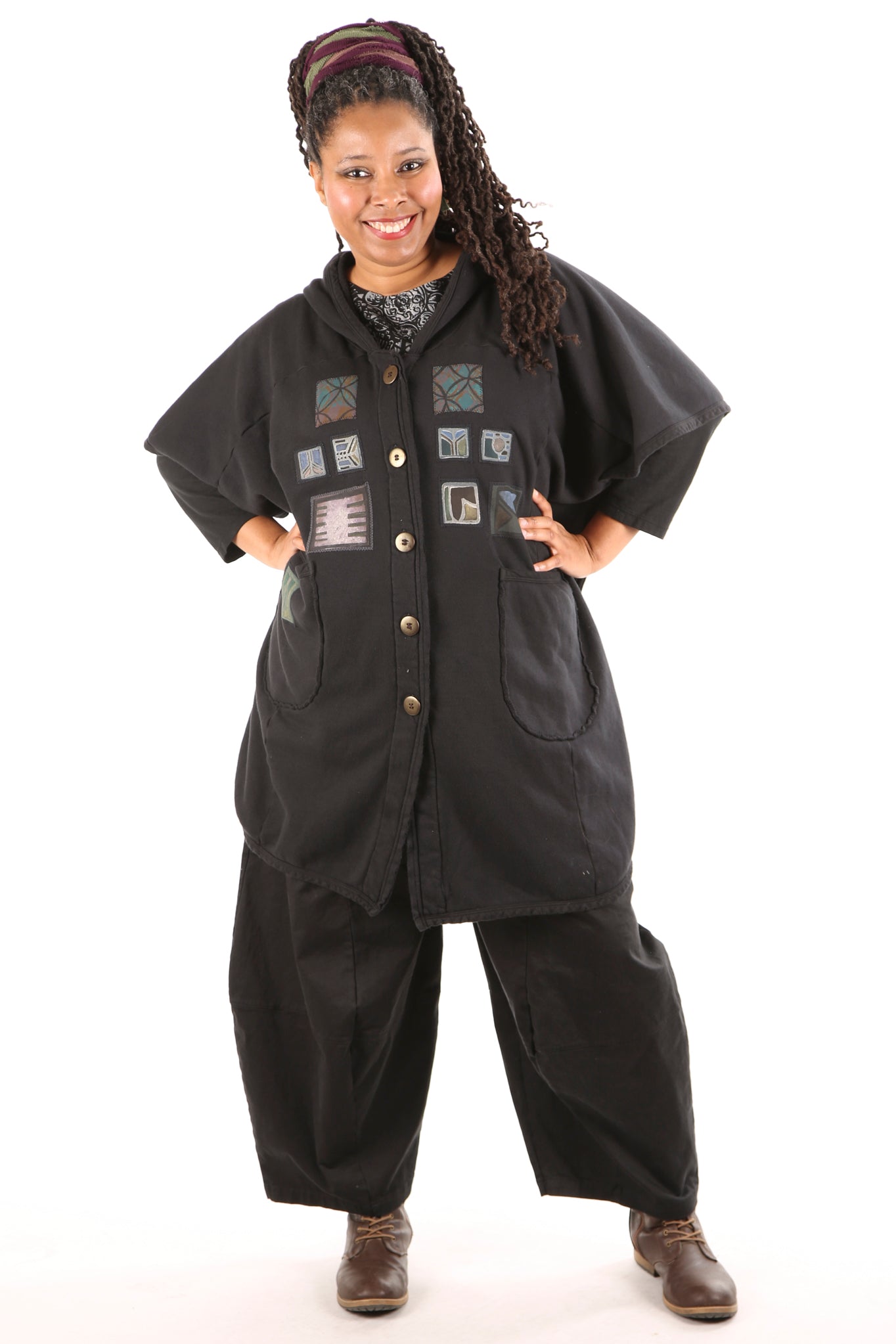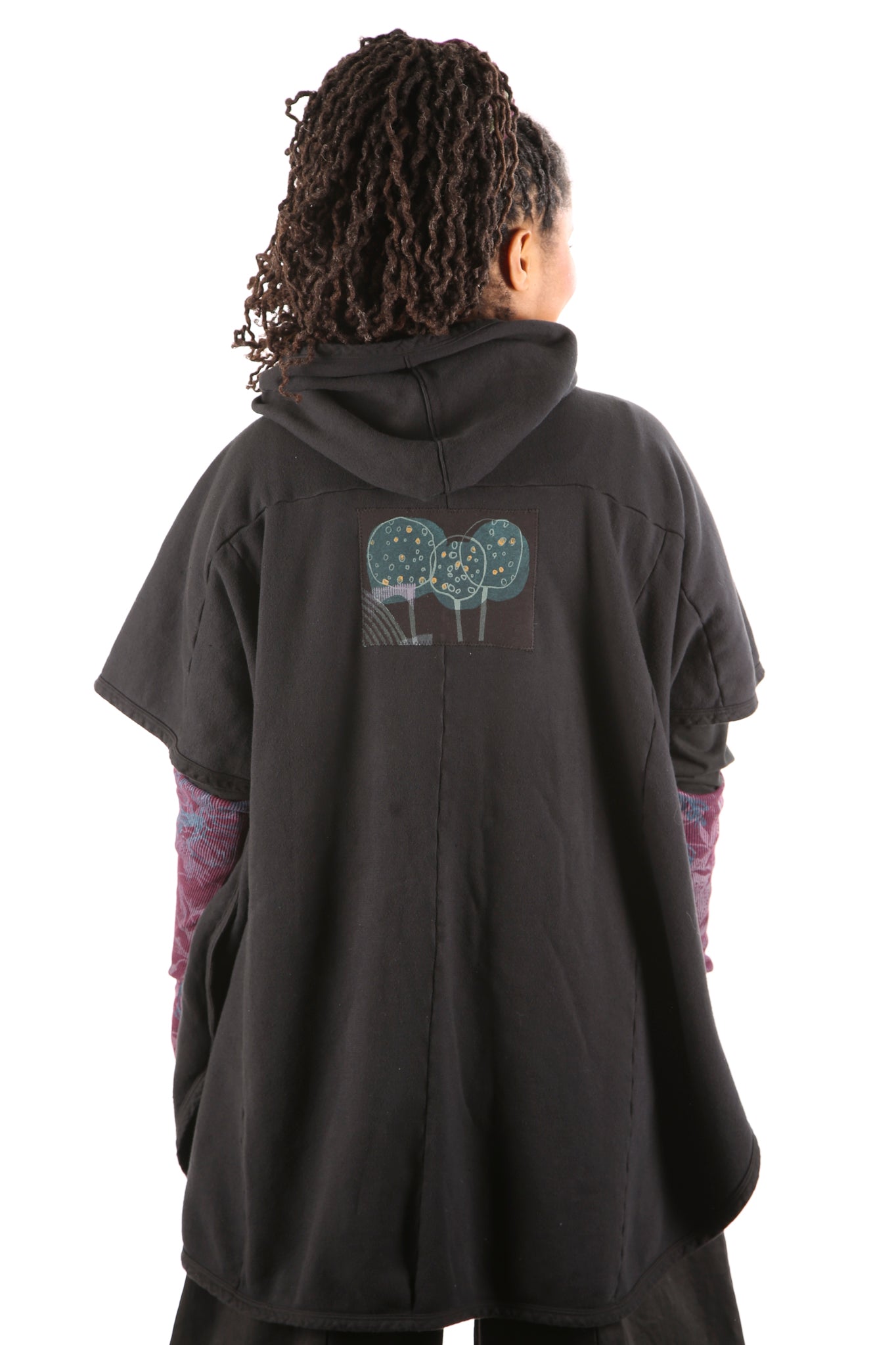 Yes. Don't wait! Limited edition, thick, not heavy, cozy warm organic sherpa knit just for us- a NEW fabric with sherpa softness on the inside, Red tones, flower, bird patches vintage style blue fish block printed, artful designs on the outside. Generous fit, POCKETS, button front, hemline scoops. You can even turn it inside-out for a different look and texture. Whatever you call it vest/ poncho-cape...keep it close, you will want to live in it.
