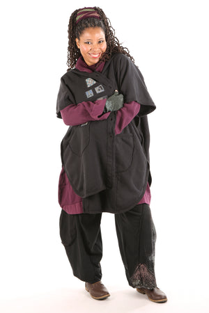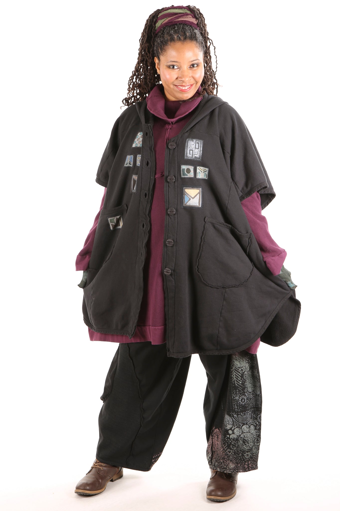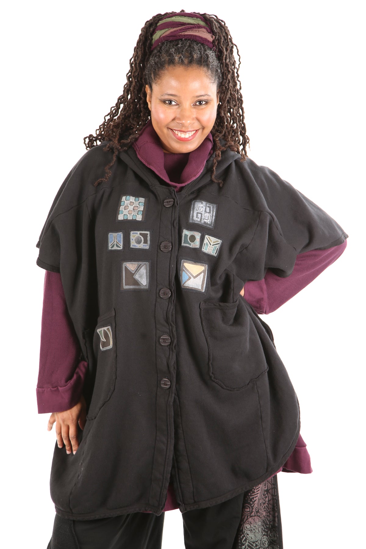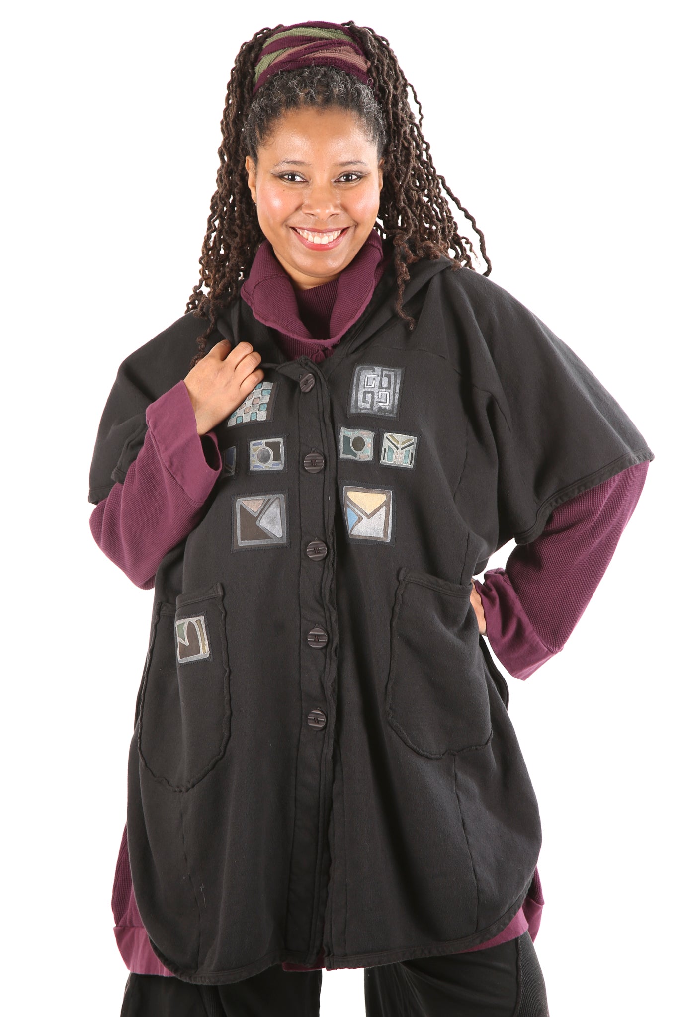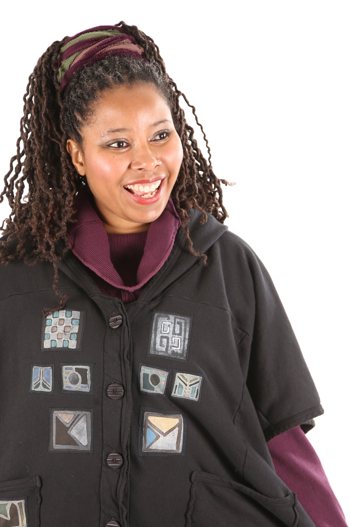 Yes. Don't wait! Limited edition, thick, not heavy, cozy warm organic sherpa knit just for us- a NEW fabric with sherpa softness on the inside, Grey tones with subtle hints of color adorn patches -vintage style blue fish block printed, artful designs on the outside. Generous fit, POCKETS, button front, hemline scoops. You can even turn it inside-out for a different look and texture. Whatever you call it vest/ poncho-cape...keep it close, you will want to live in it.