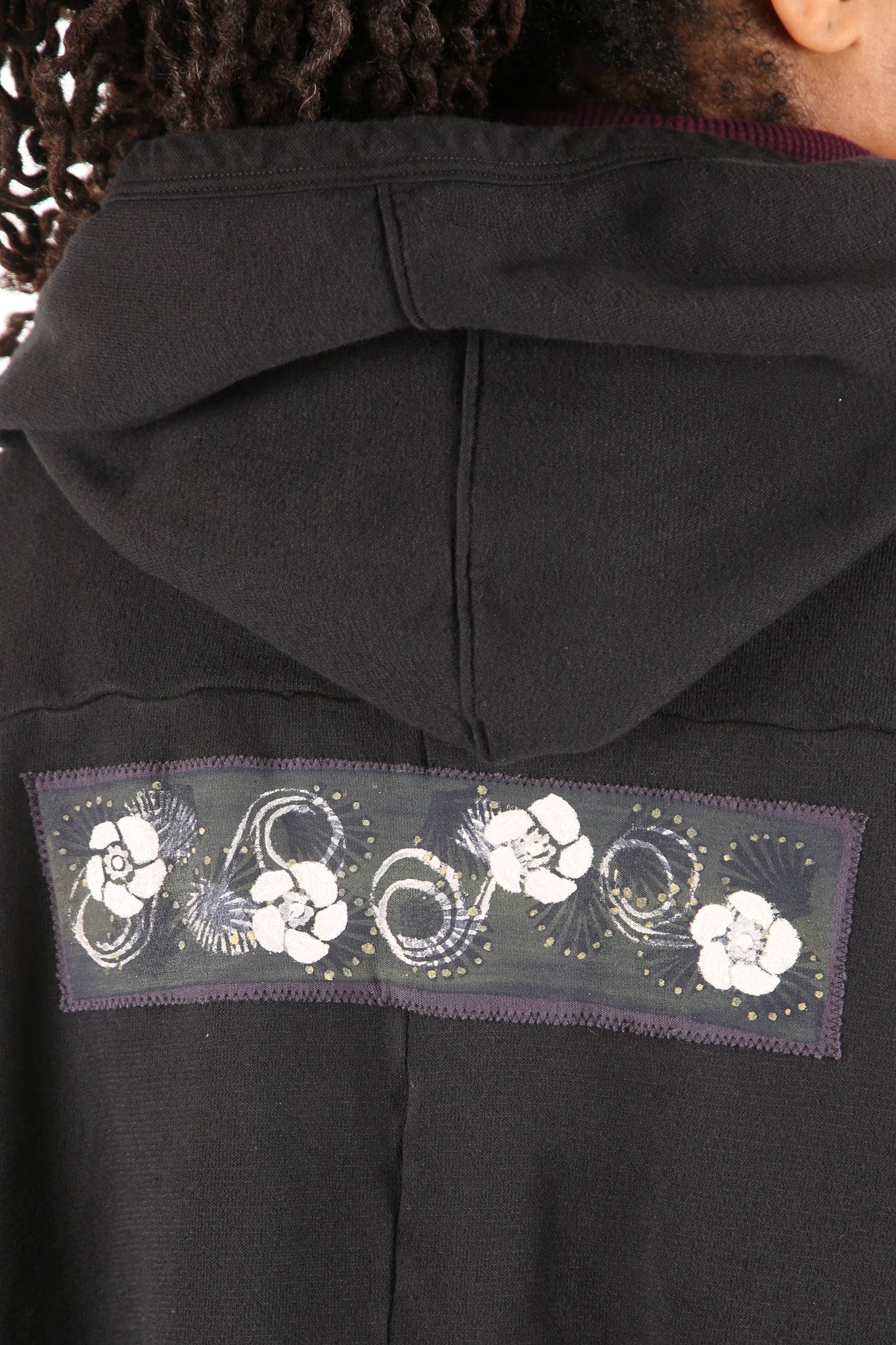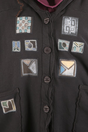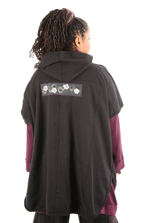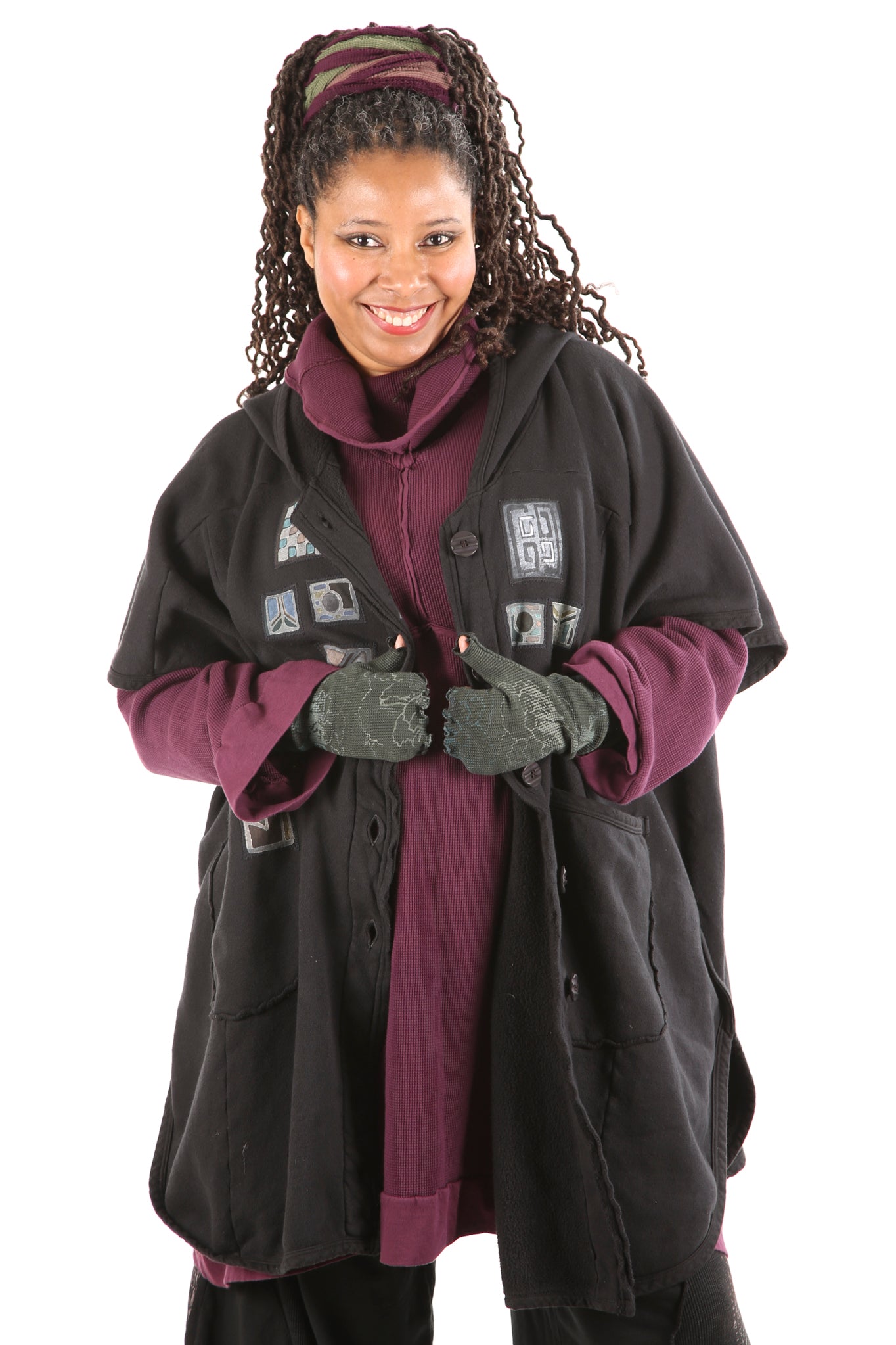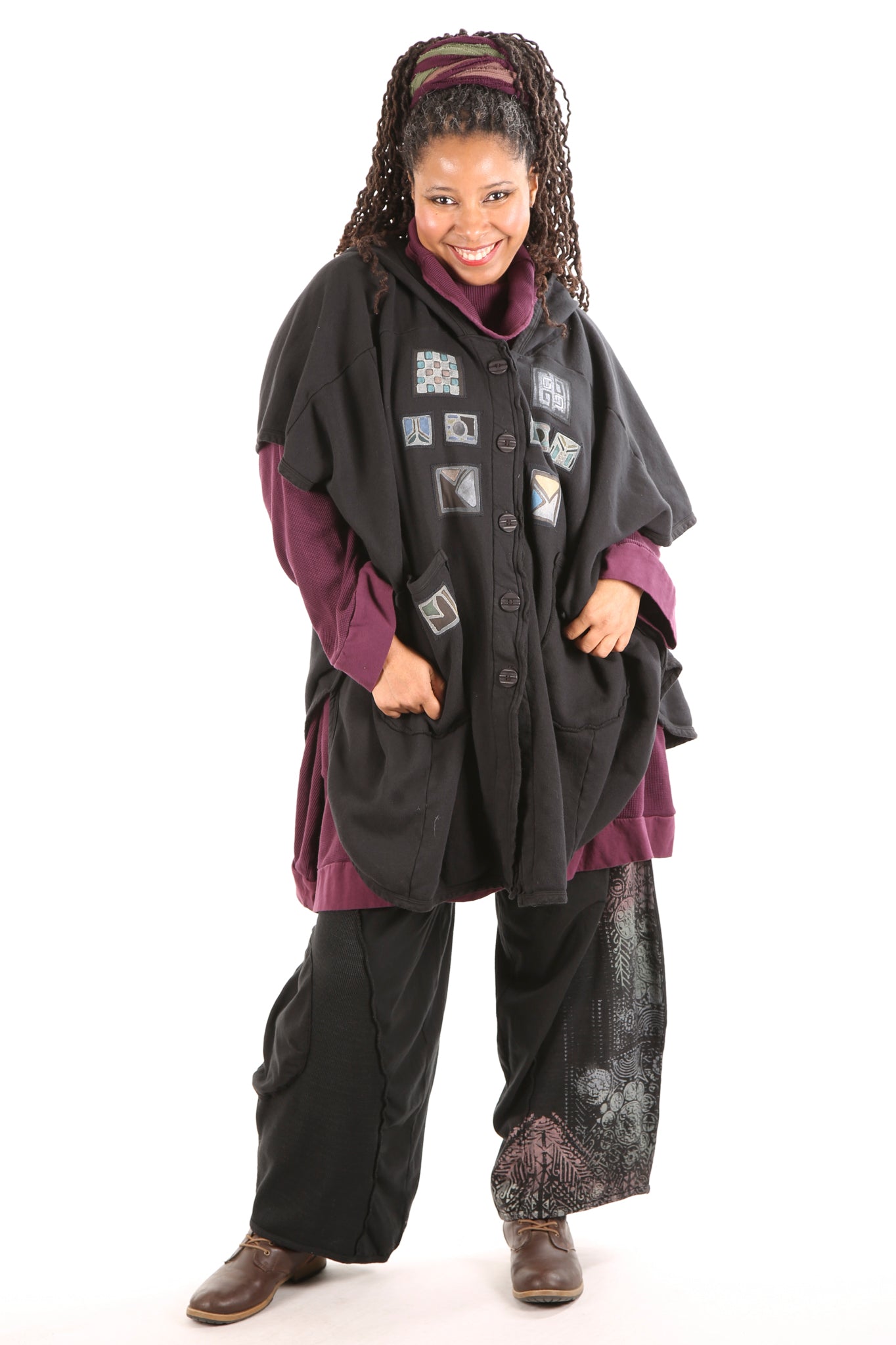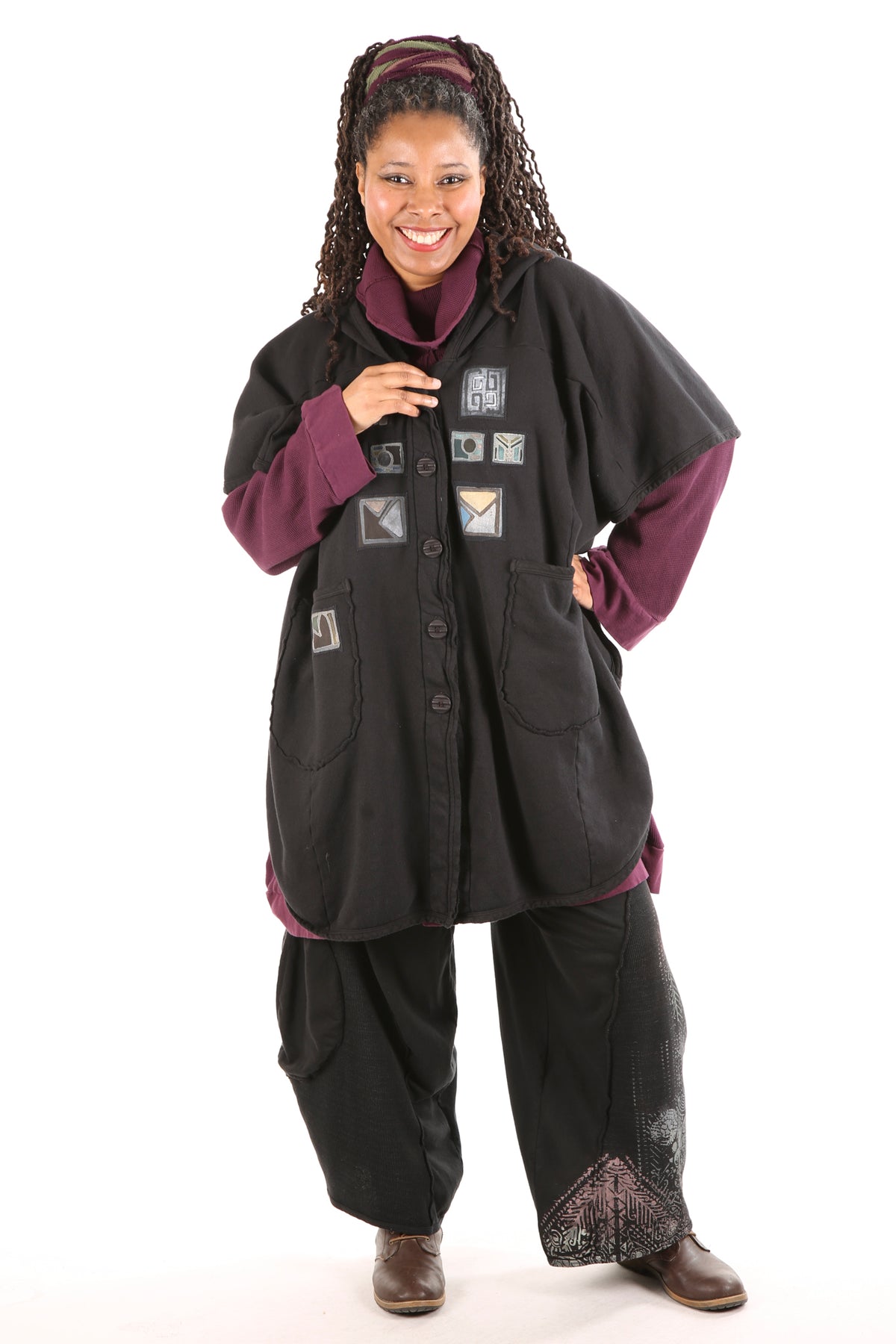 Yes. Don't wait! Limited edition, thick, not heavy, cozy warm organic sherpa knit just for us- a NEW fabric with sherpa softness on the inside, Grey tones with subtle hints of color adorn patches -vintage style blue fish block printed, artful designs on the outside. Generous fit, POCKETS, button front, hemline scoops. You can even turn it inside-out for a different look and texture. Whatever you call it vest/ poncho-cape...keep it close, you will want to live in it.