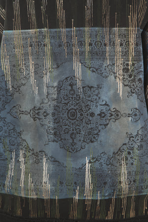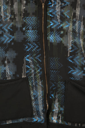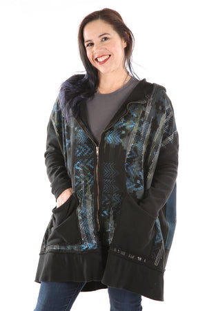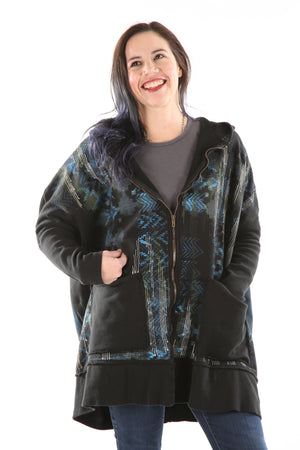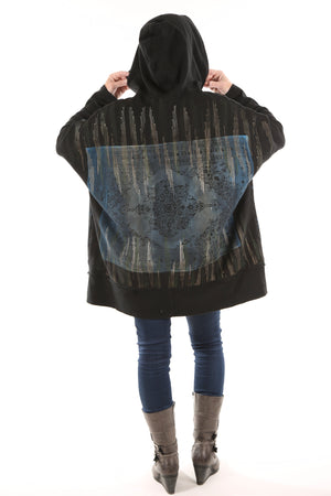 A perfect warm thick organic cotton stretch zip hoodie to layer . Subtle antique Persian Rug printing on the back and complementary designs on the front.