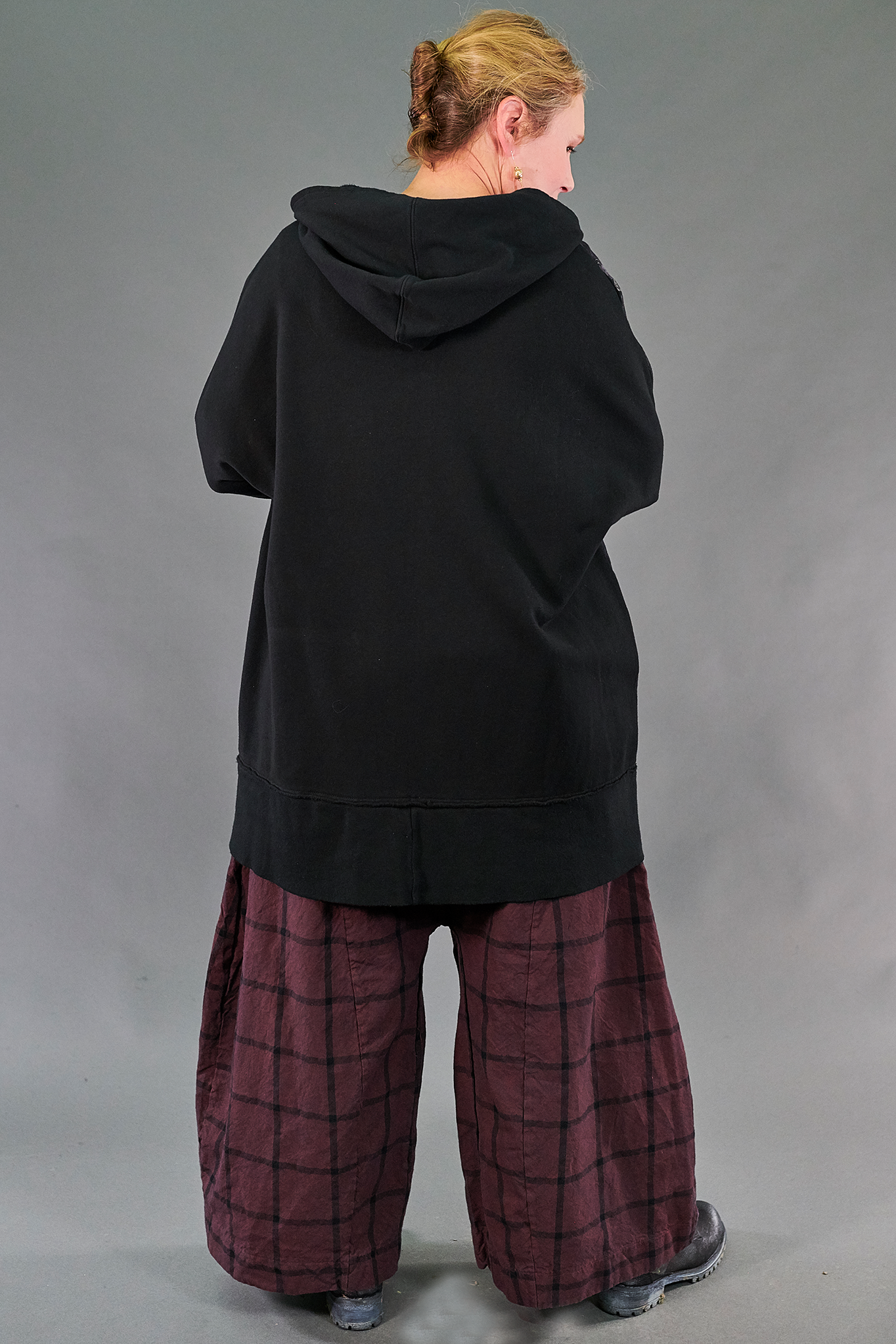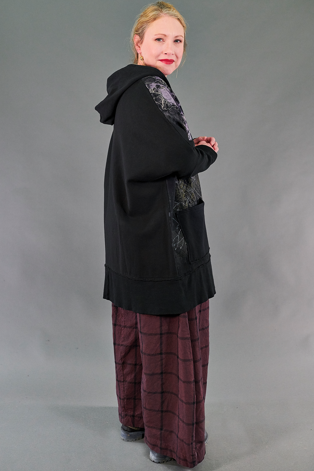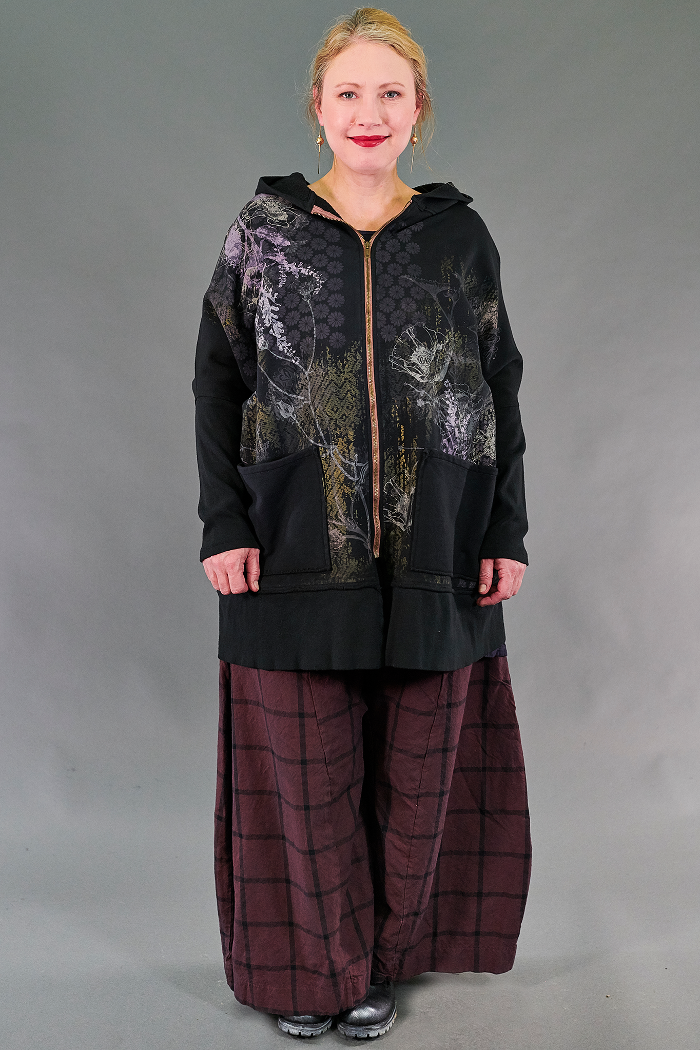 Who doesn't love a black hoodie? This is the perfect warm thick organic cotton stretch zip hoodie to layer all year round! This style is oversized, yet slightly less wide than our style 5255. This rib zipper hoodie features contrasting zipper and great patch pockets. Ribbed cotton fabric on arms & bottom hem gives definition. Roomy hood and an artfully oversized silhouette are perfect for layering over anything. The fabric is thick, soft, stretchy, & ORGANIC! This incredible floral print is sure to be your new favorite.