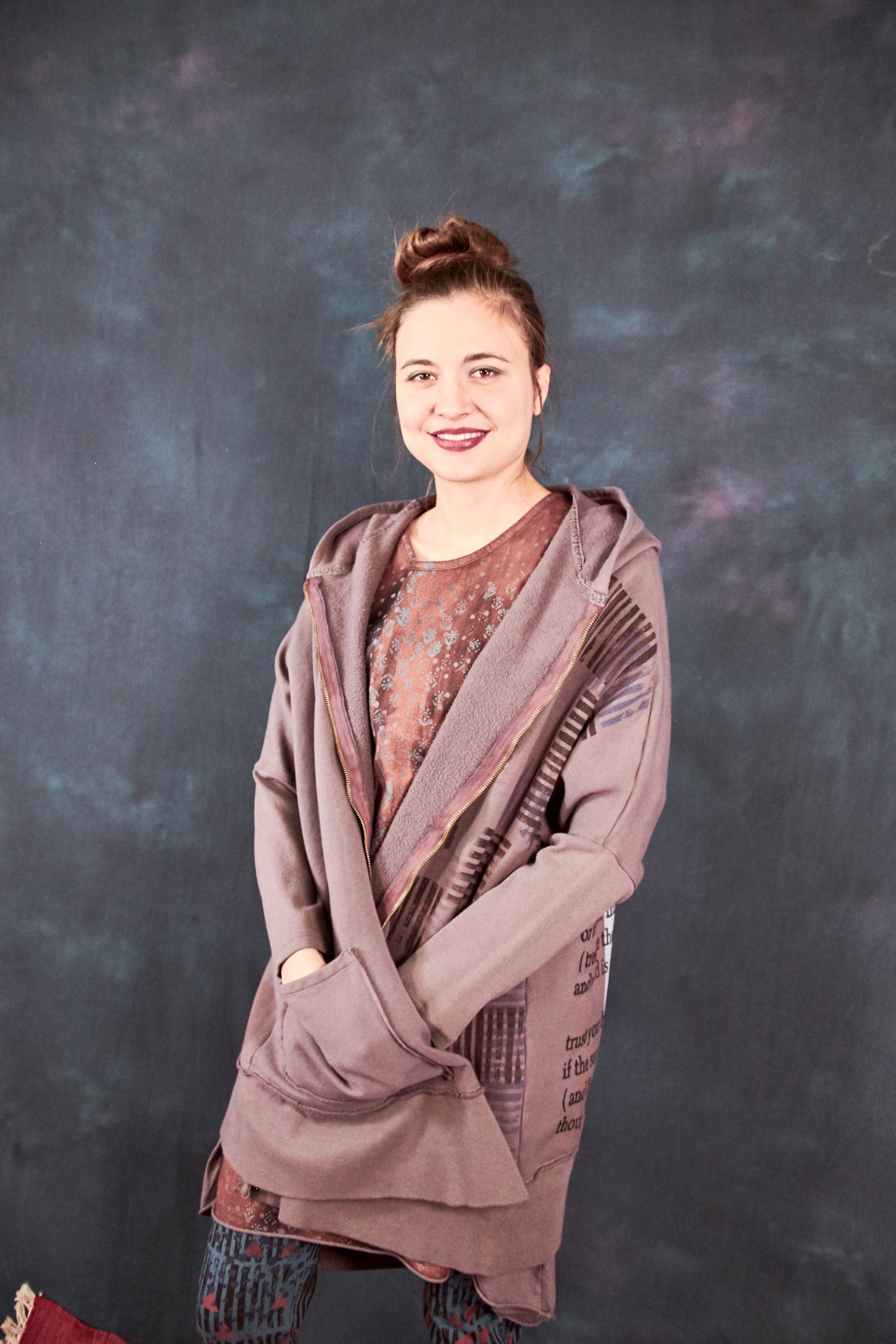 It closes with a contrasting, heavy-duty maroon zipper. Features large pockets, a roomy hood and an oversized silhouette. The fabric is thick, soft and stretchy. Organic. Hand printed on the front and the back.