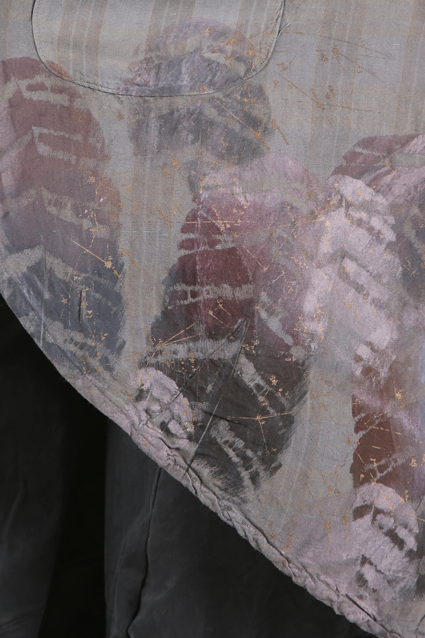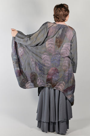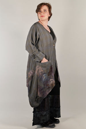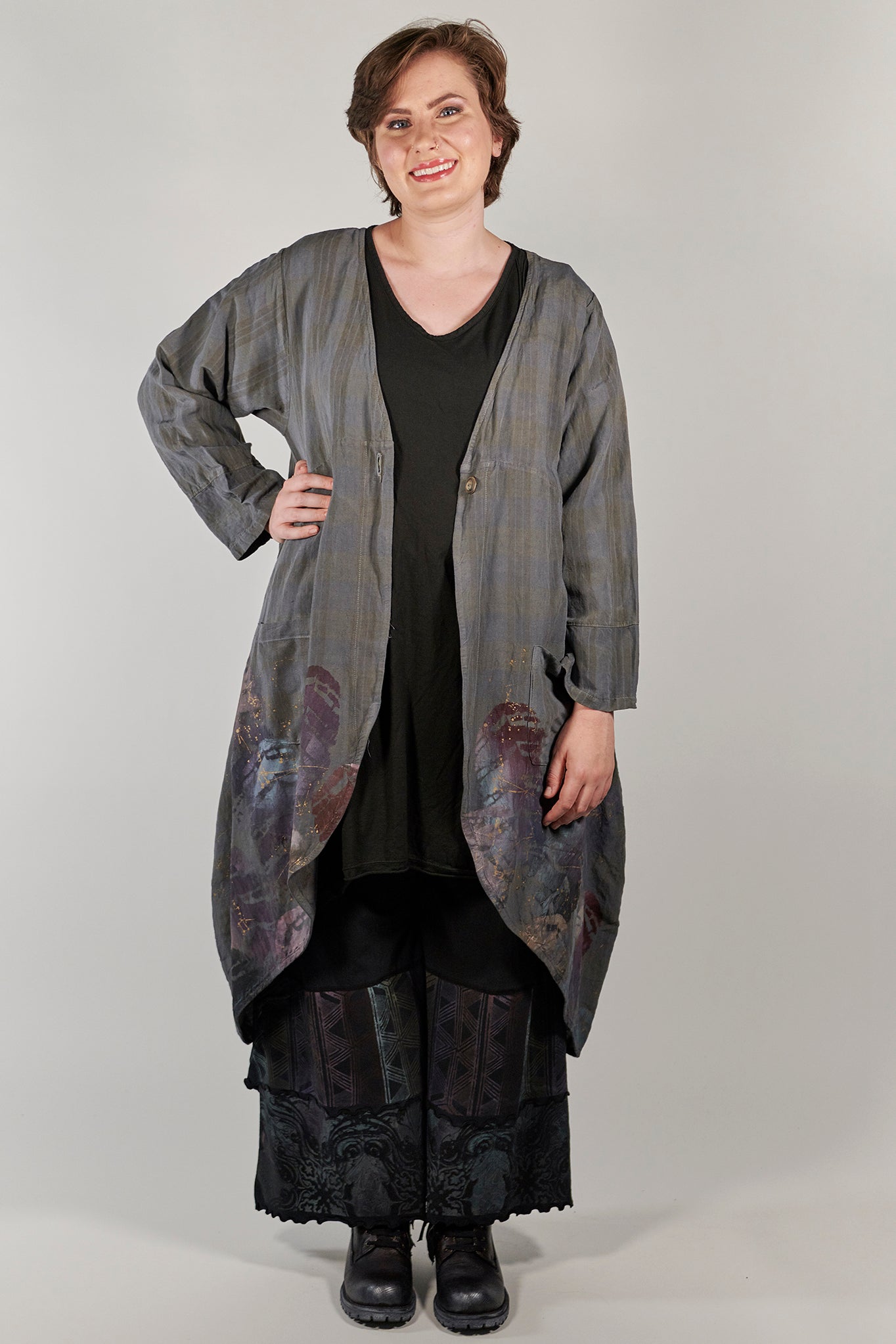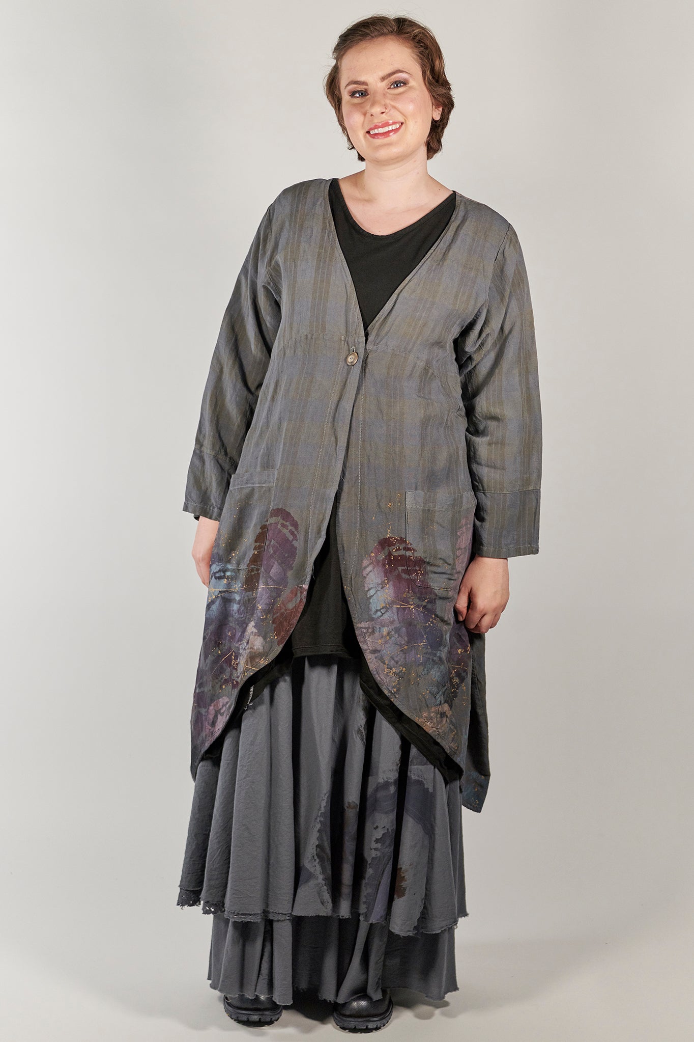 Made of a substantial rayon in a very subtle woven tonal plaid, which we then overdye to create a wonderful texture and tone. This style closes with a single button or is just as beautiful left open. Pockets adorn the front, a long curving line wraps from the front around to the back, making a graceful and unusual shape which is flattering and elegant. It is a bit more fitted at the top, then spreads out in a gracious A-line, shaped as the flowing key piece to top your special occasion ensemble.