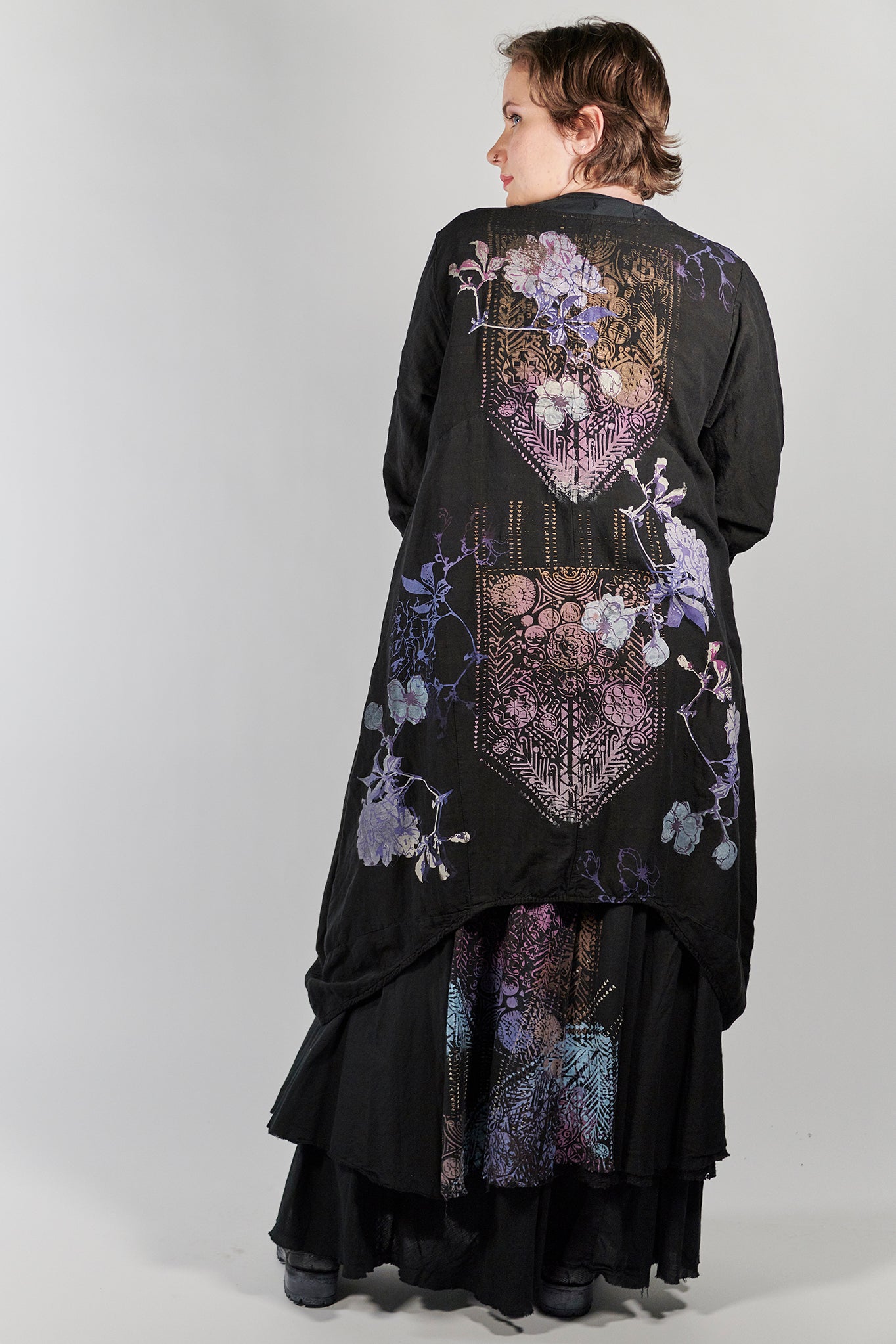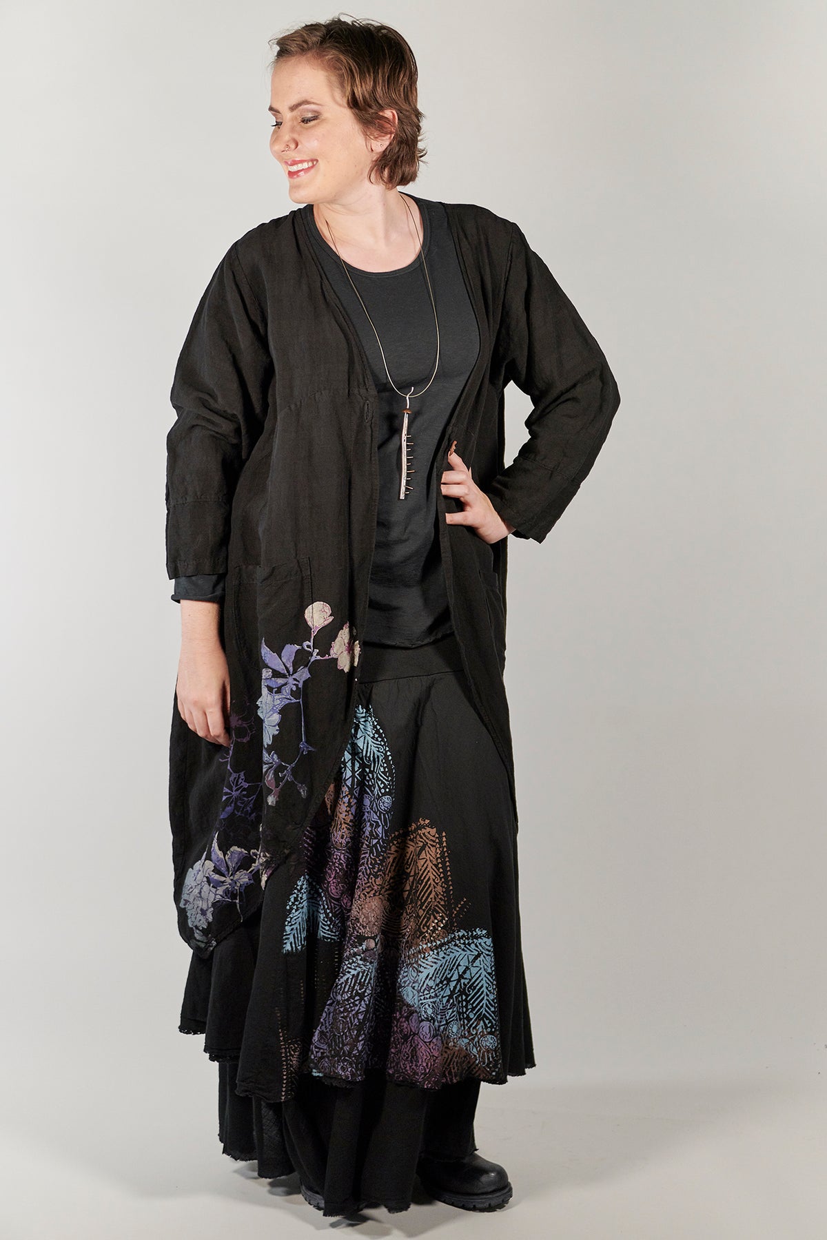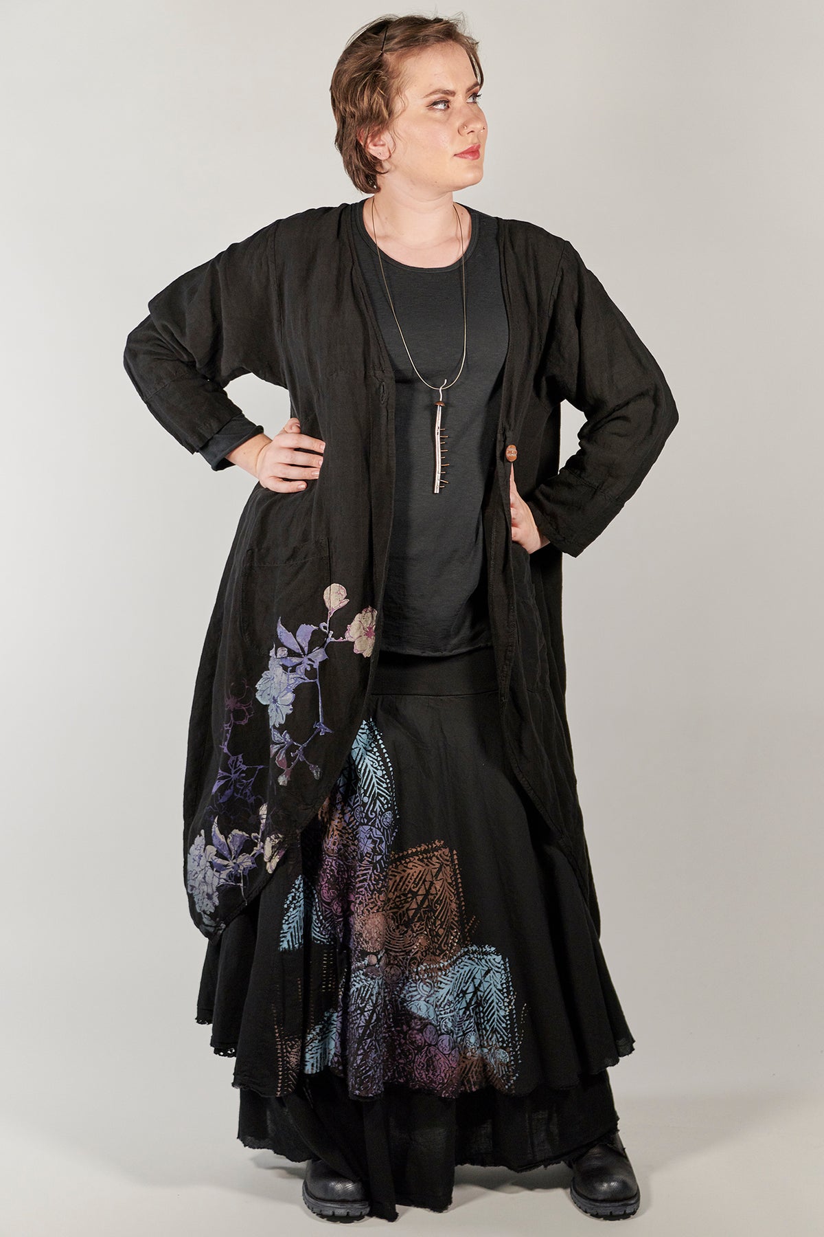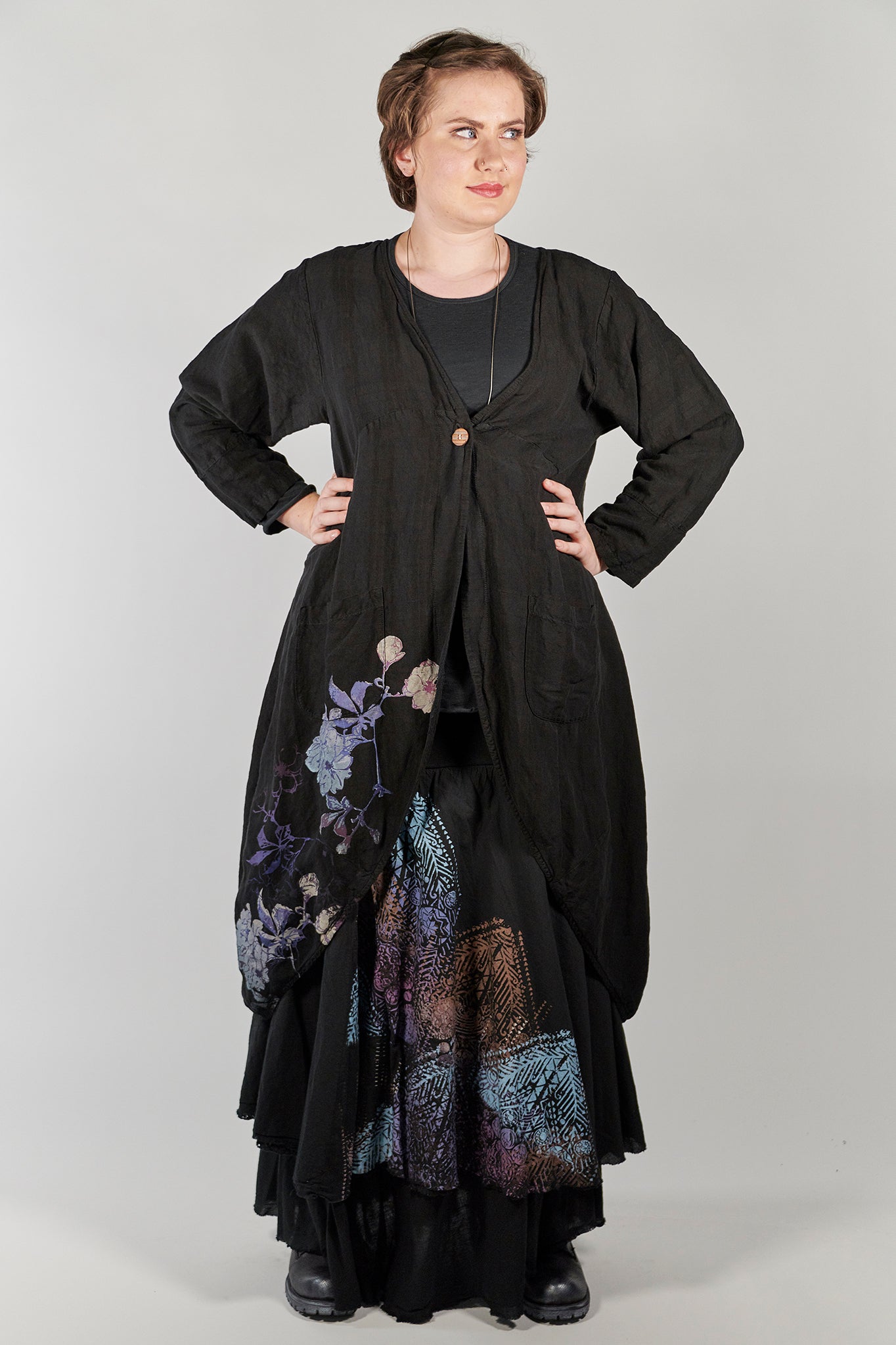 Beautiful for special occasions. This style closes with a single button or is just as beautiful left open. Pockets adorn the front, a long curving line wraps from the front around to the back, making a graceful, flattering shape. It is a bit more fitted at the top, then spreads out in a petalled A-line, shaped as the flowing key piece to top your ensemble.