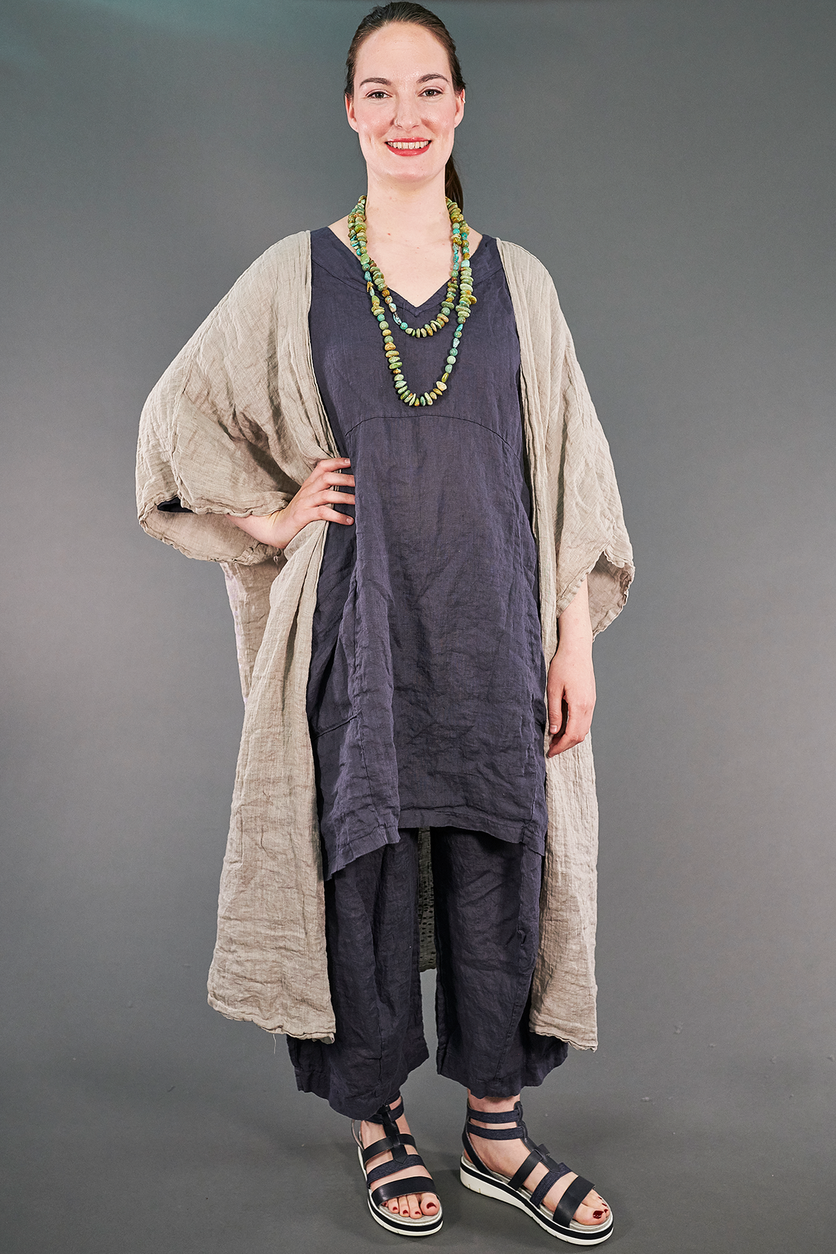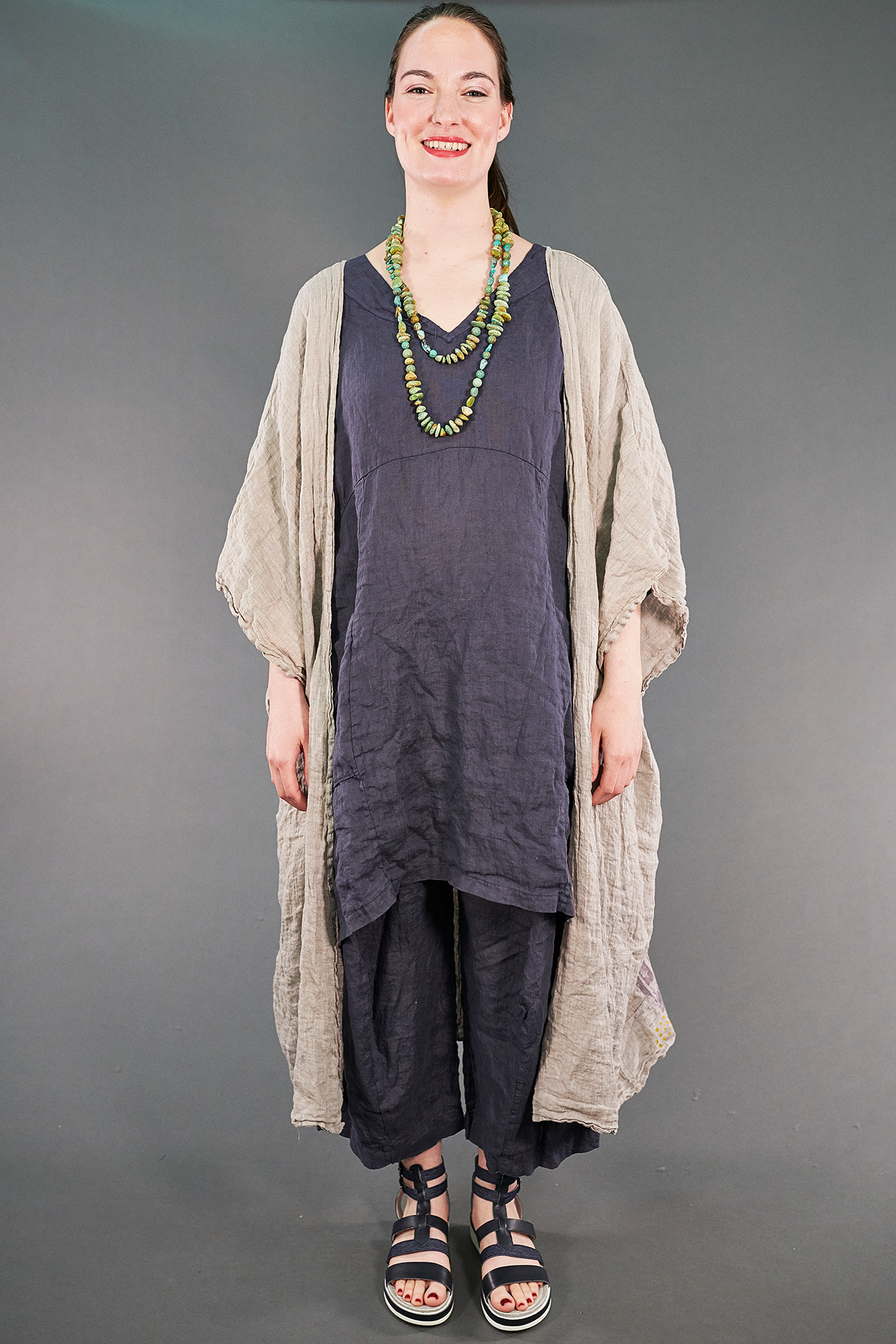 This lightweight linen has a rich, soft texture, and a sophisticated look -wonderful! You could pack for a month in the Mediterranean in a tiny and light bag. Wear it over our linen tank and billow pants for an elegant airy (effortless) outfit.