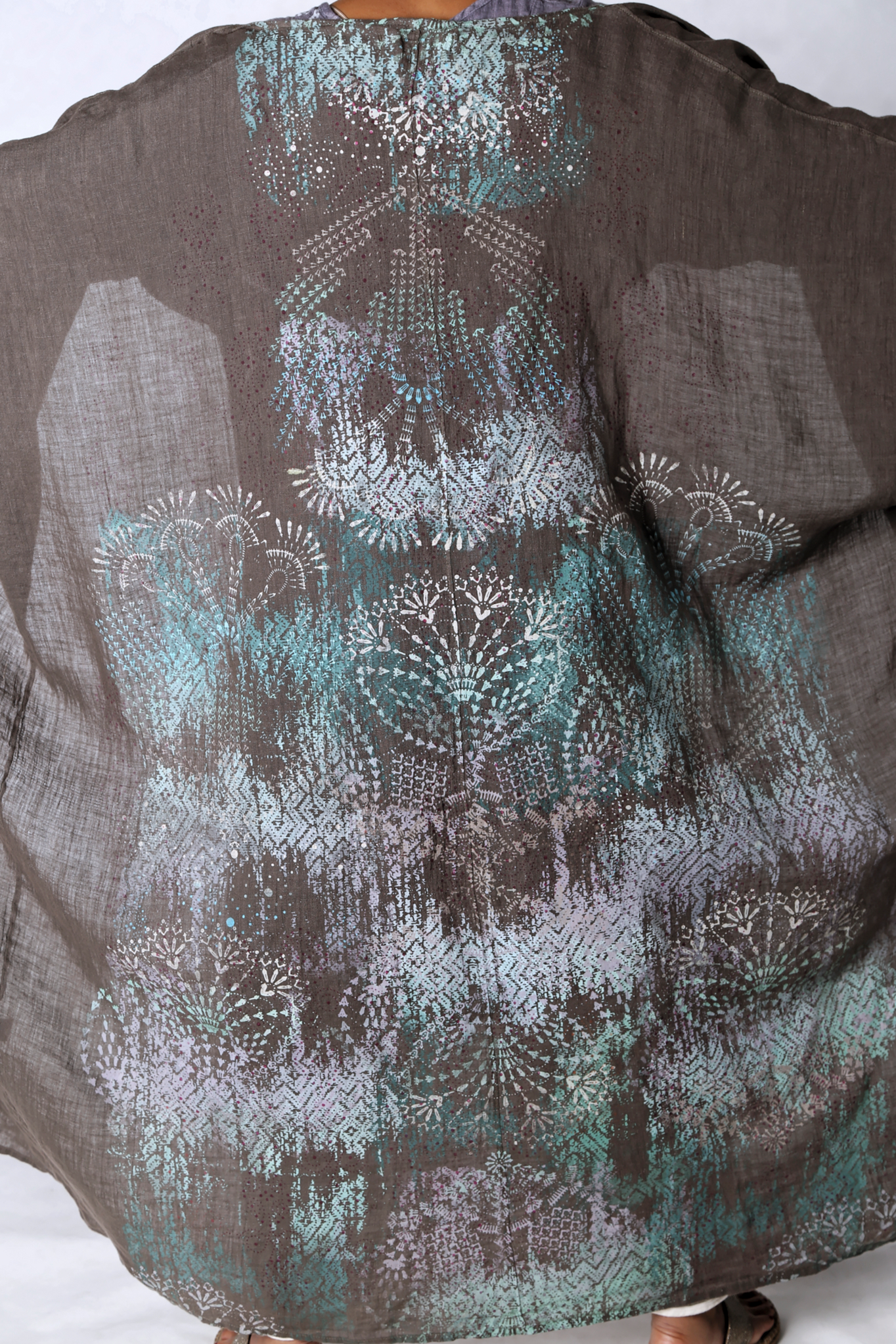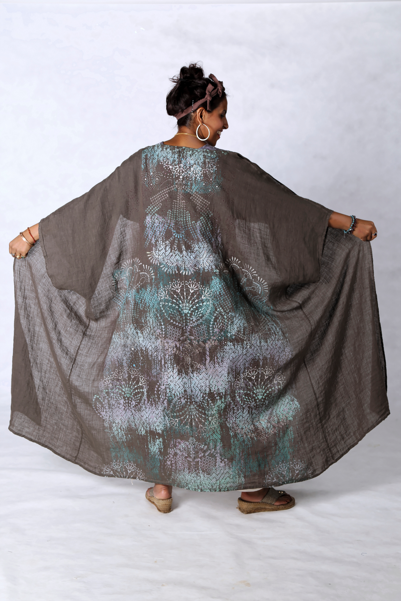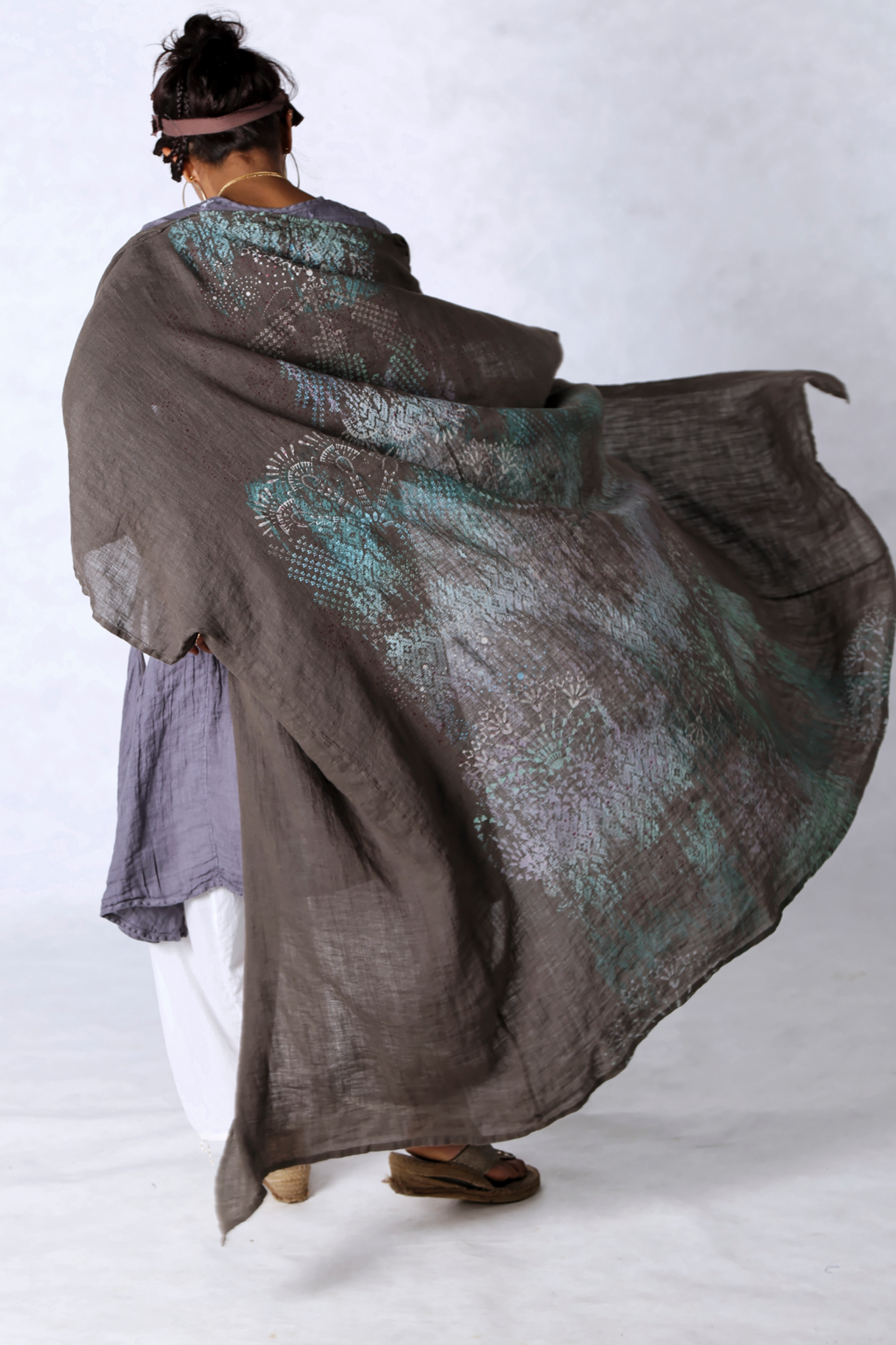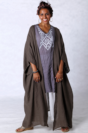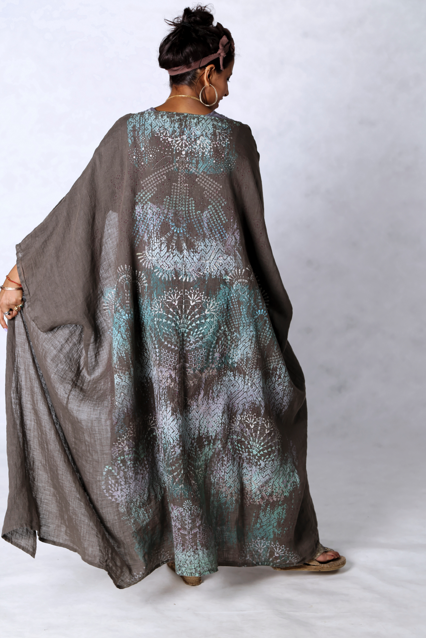 This limited edition, long washed linen kimono offers the perfect canvas for our lavishly printed patterns and textures--a true work of art & perfect to wear to your next event or gala. Note that this print is much more lush and detailed than you are able to see in the photo. There are tiny, intricate, hand-printed dot designs and the lighter color is a soft brown (which may appear darker or lighter, depending on lighting).