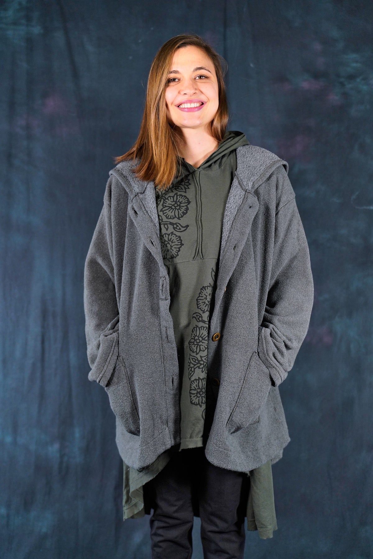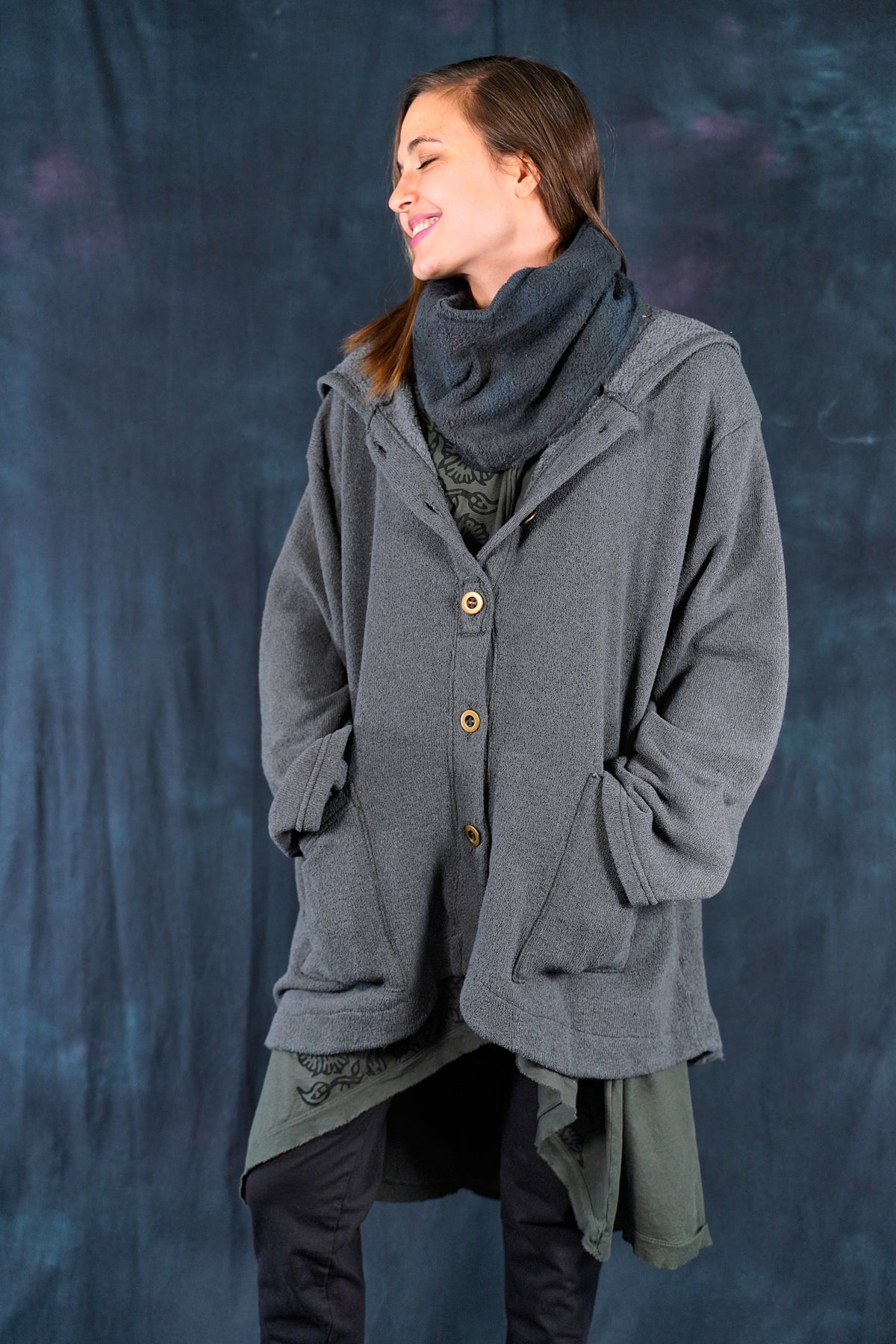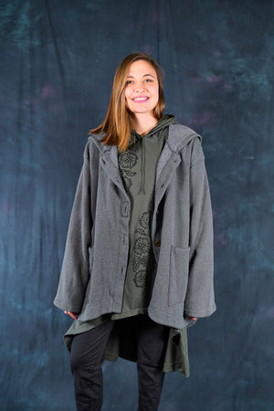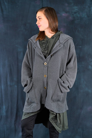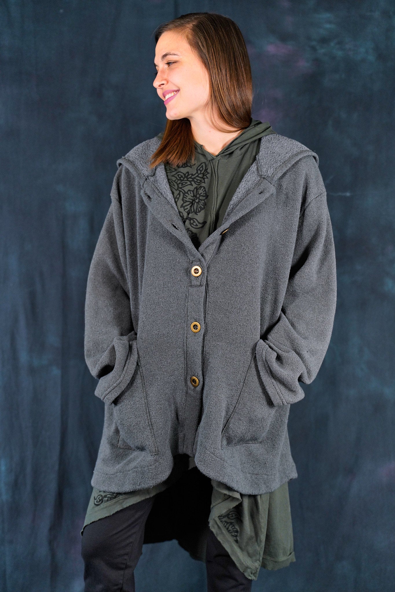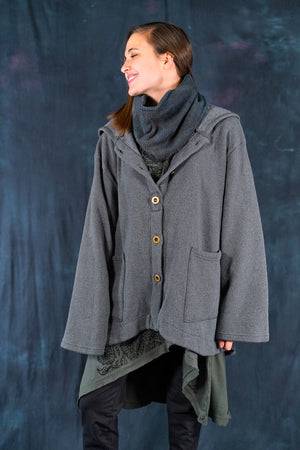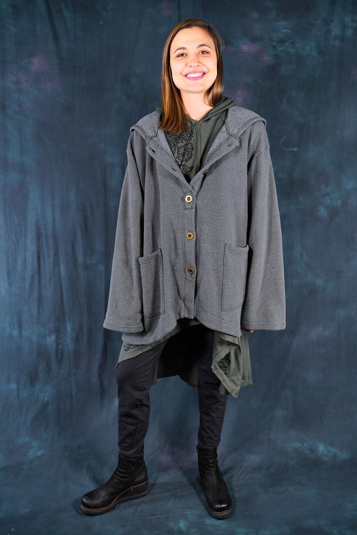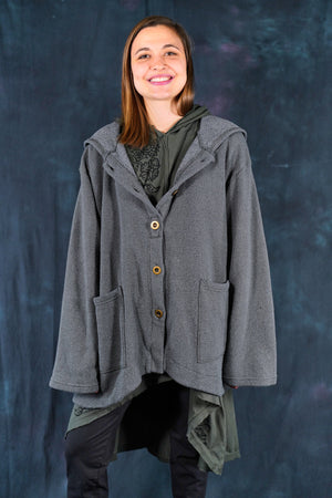 Wonderfully versatile, warm & fuzzy. Generous boxy fit makes it easy to layer up underneath. Hi-Lo Utility jacket LONGER IN THE BACK will keep you warm during the autumn/winter transitioning temperatures. Featuring a hi-lo hemline, generous front patch pockets to keep hands warm, and embellished with antiqued bronze metal buttons. Easy to wear every day.
