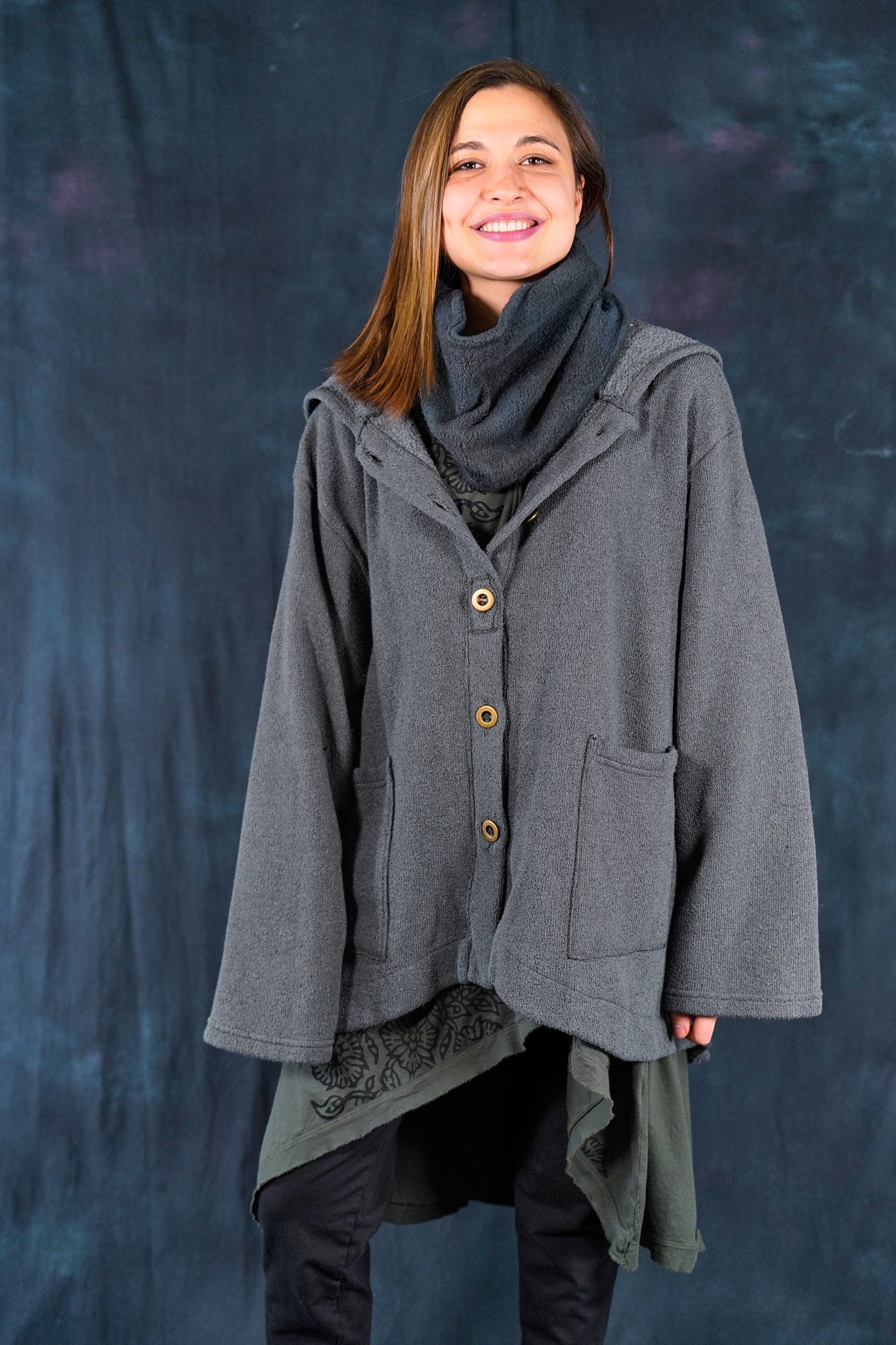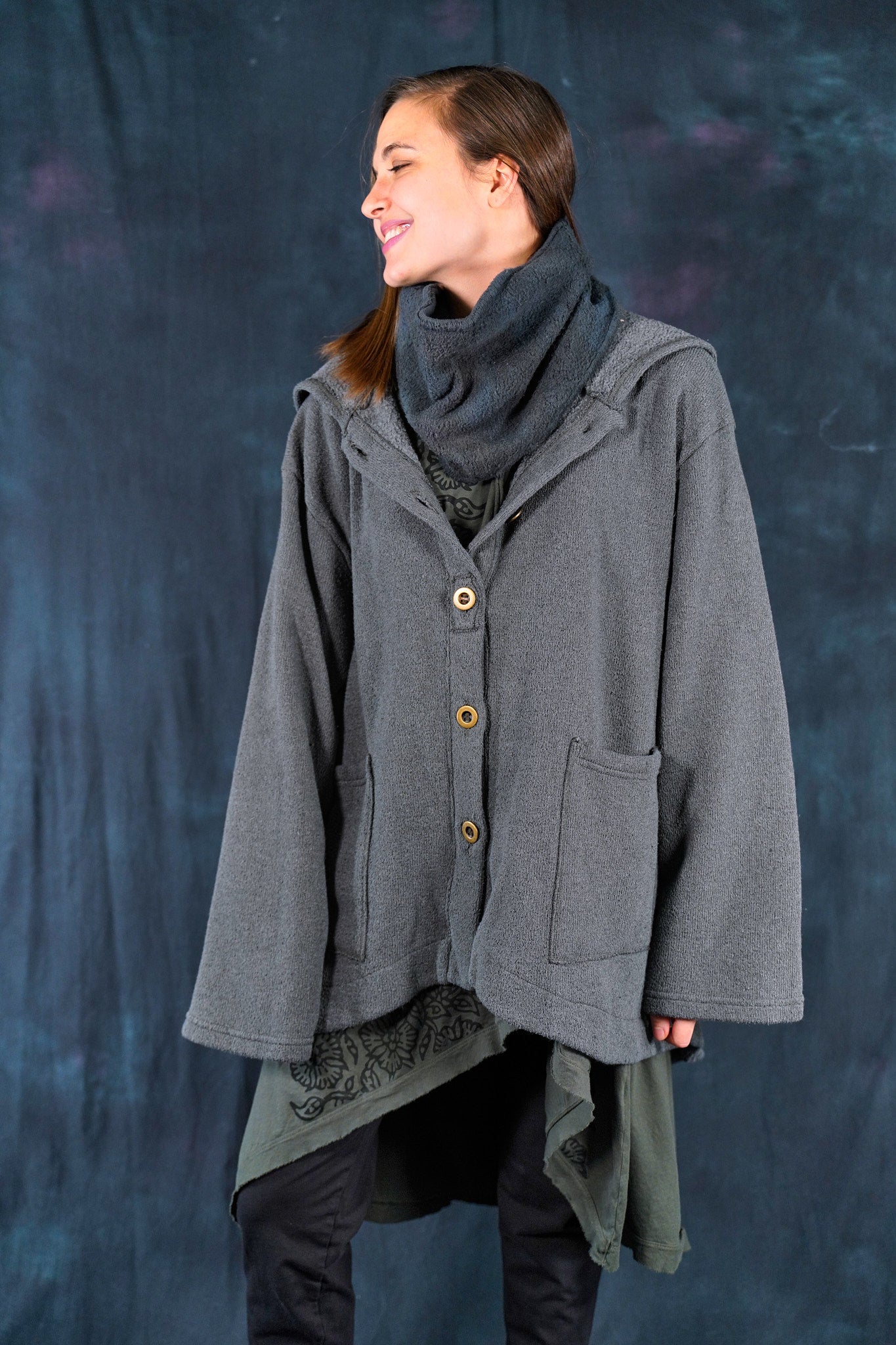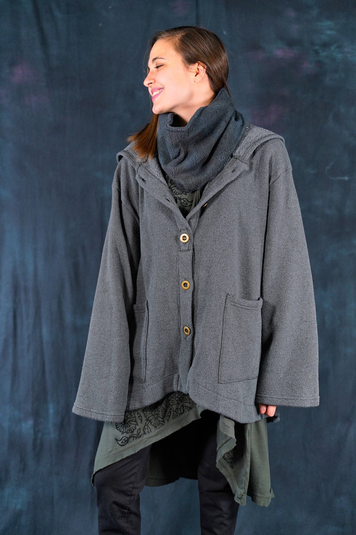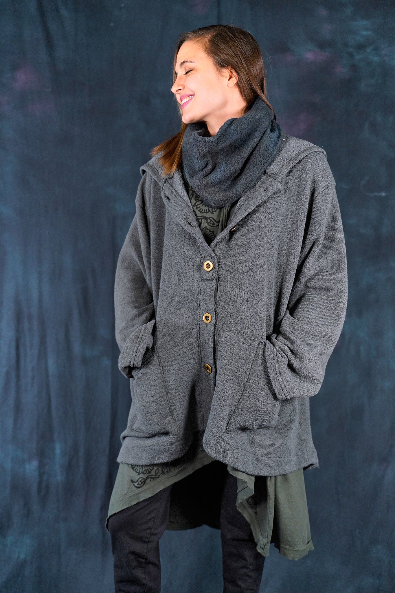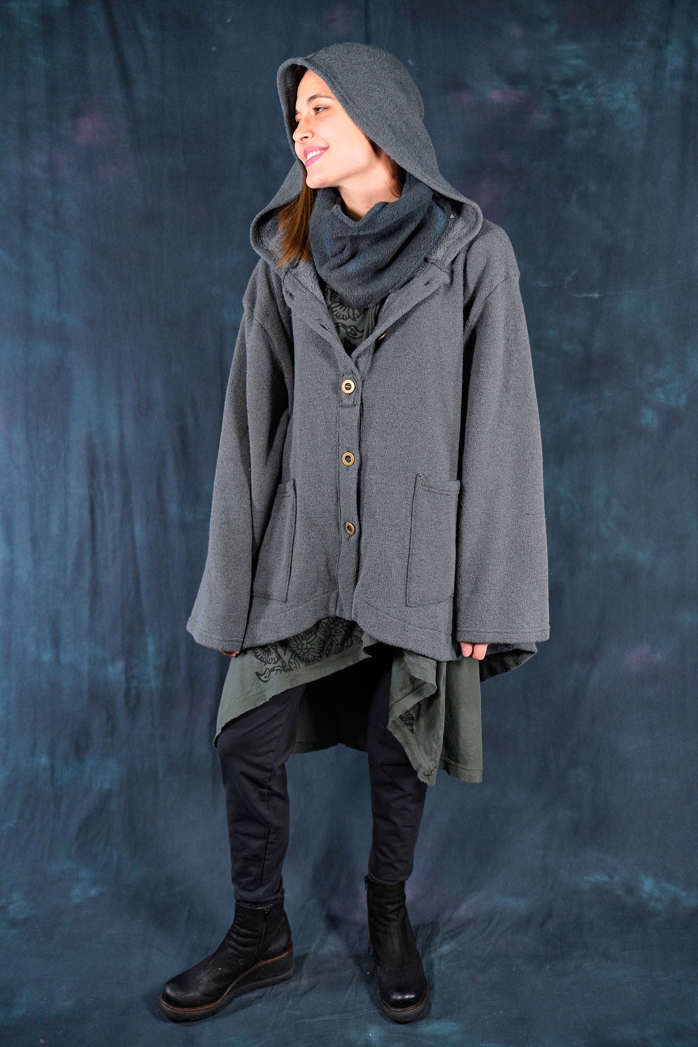 Wonderfully versatile, warm & fuzzy. Generous boxy fit makes it easy to layer up underneath. Hi-Lo Utility jacket LONGER IN THE BACK will keep you warm during the autumn/winter transitioning temperatures. Featuring a hi-lo hemline, generous front patch pockets to keep hands warm, and embellished with antiqued bronze metal buttons. Easy to wear every day.