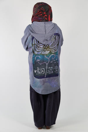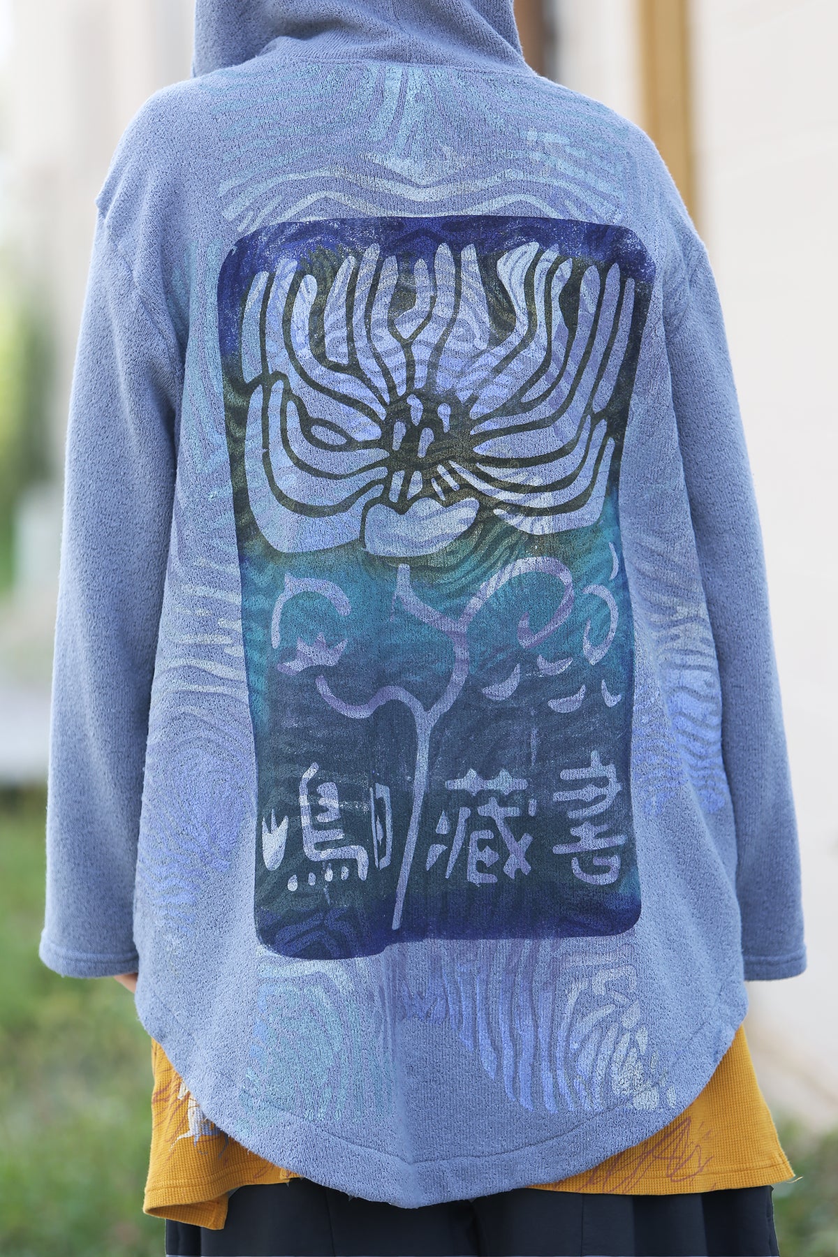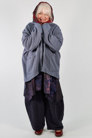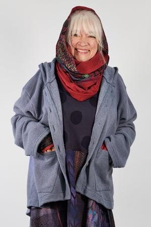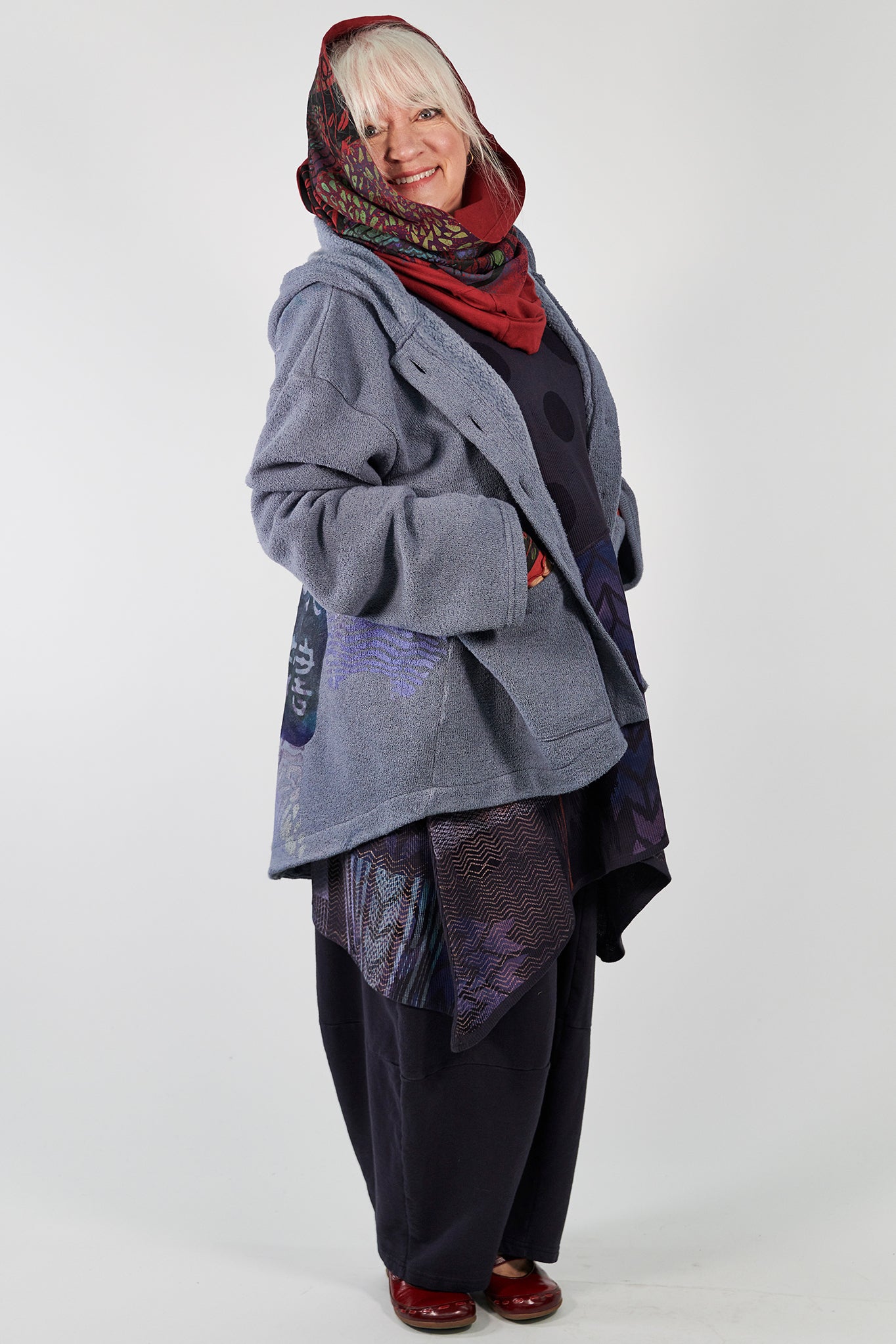 You will never find another coat like this. The sherpa fabric is so soft and stretchable, comfortable and plush. Each coat is adorned with different buttons from wooden tree coins to silver disks. A new favorite!