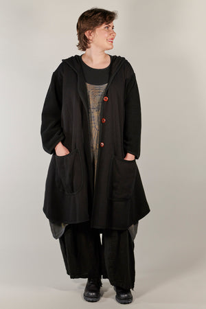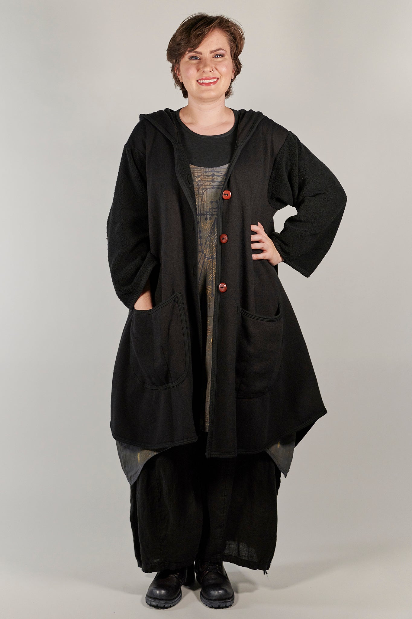 Textured, wide sleeves & roomy shape layer over all of your fall & winter pieces, soft neckline provides just a peek of your favorite sweater or scarf, & deep oversized pockets add practicality & style. Voluminous hood drapes beautifully.Three wooden buttons on the front add whimsical Blue Fish elegance. You will never find another like this. Very limited!