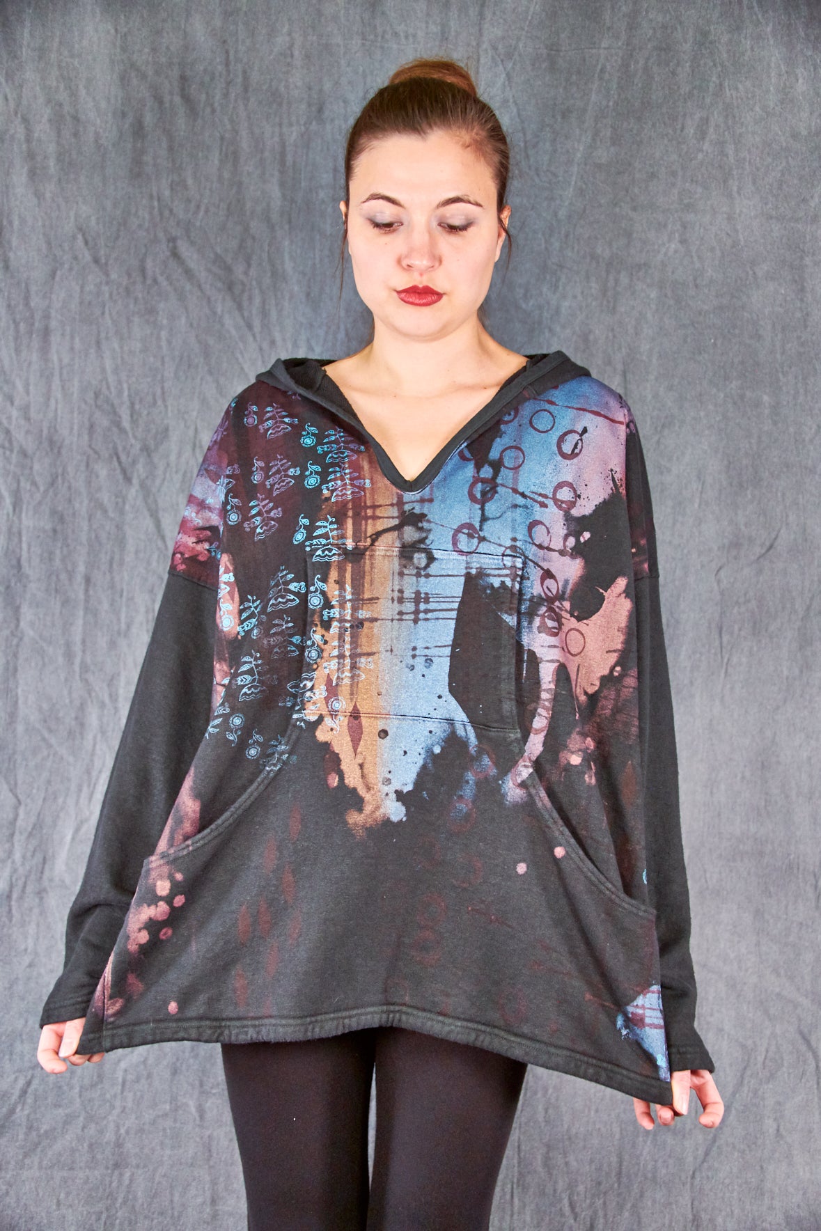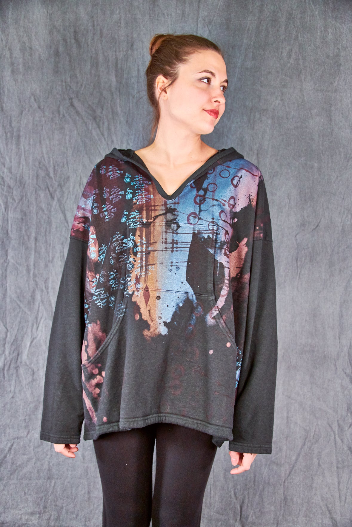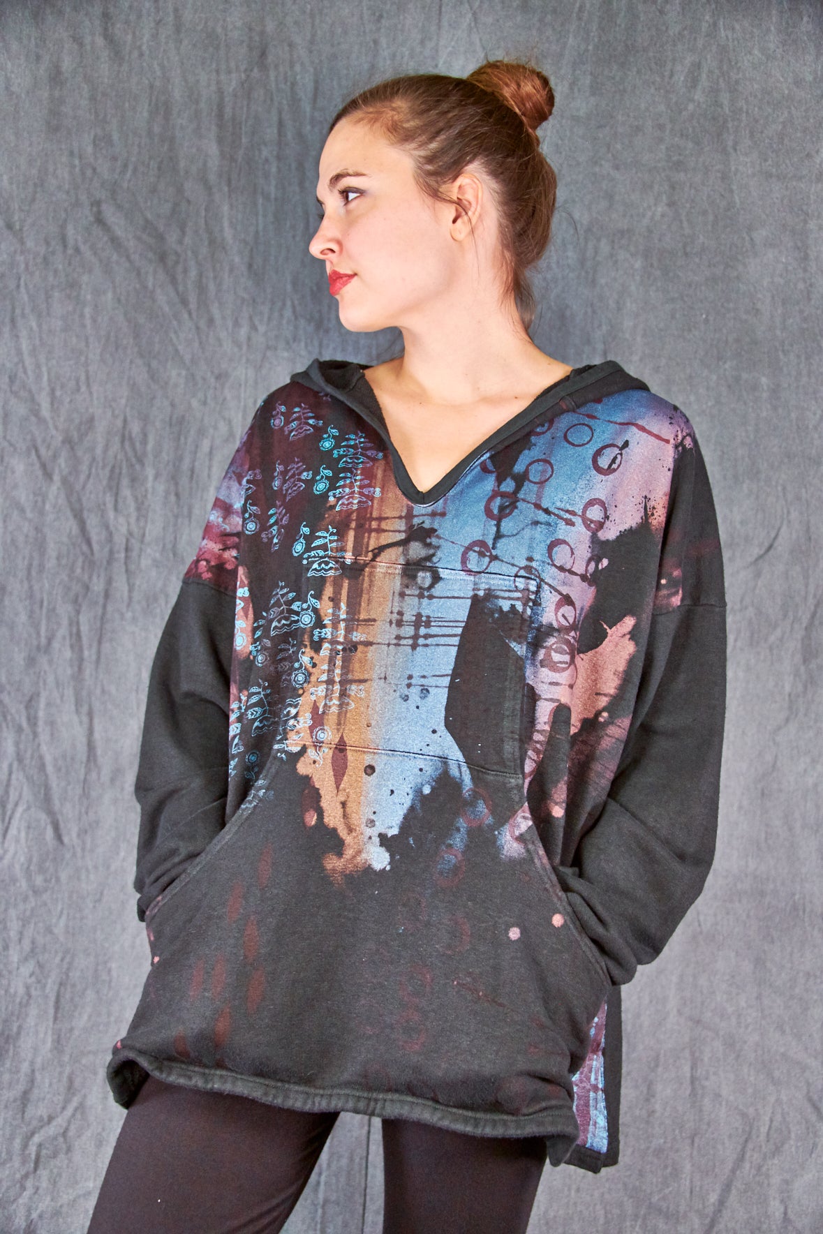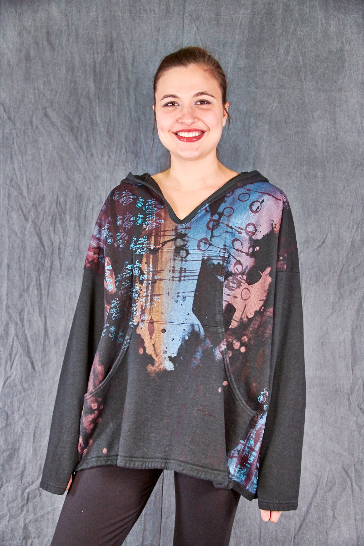 Easy throw on hoodie to top off your blue fish look. French terry hoodie made from a blend of hemp and organic cotton. Featuring an accent square front patch above pouch pocket and hood. Open neckline makes for ease of fit. This one size hoodie will fit best on sizes to about a 14, it looks good when it is a bit oversized. Just the right length to pair with our Lounge Billow Pant, Four Square Pant. Layer over your favorite printed top or tee...