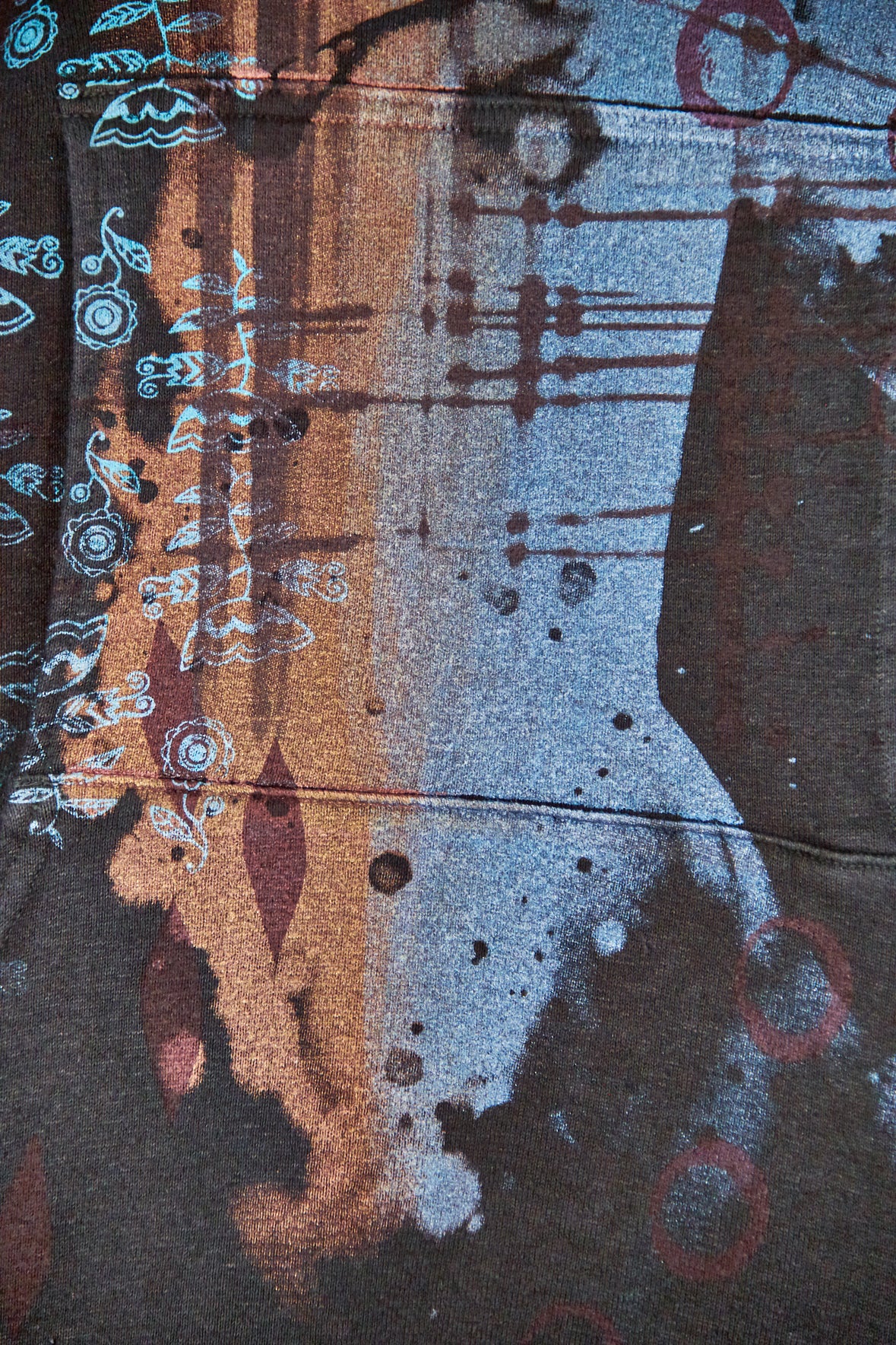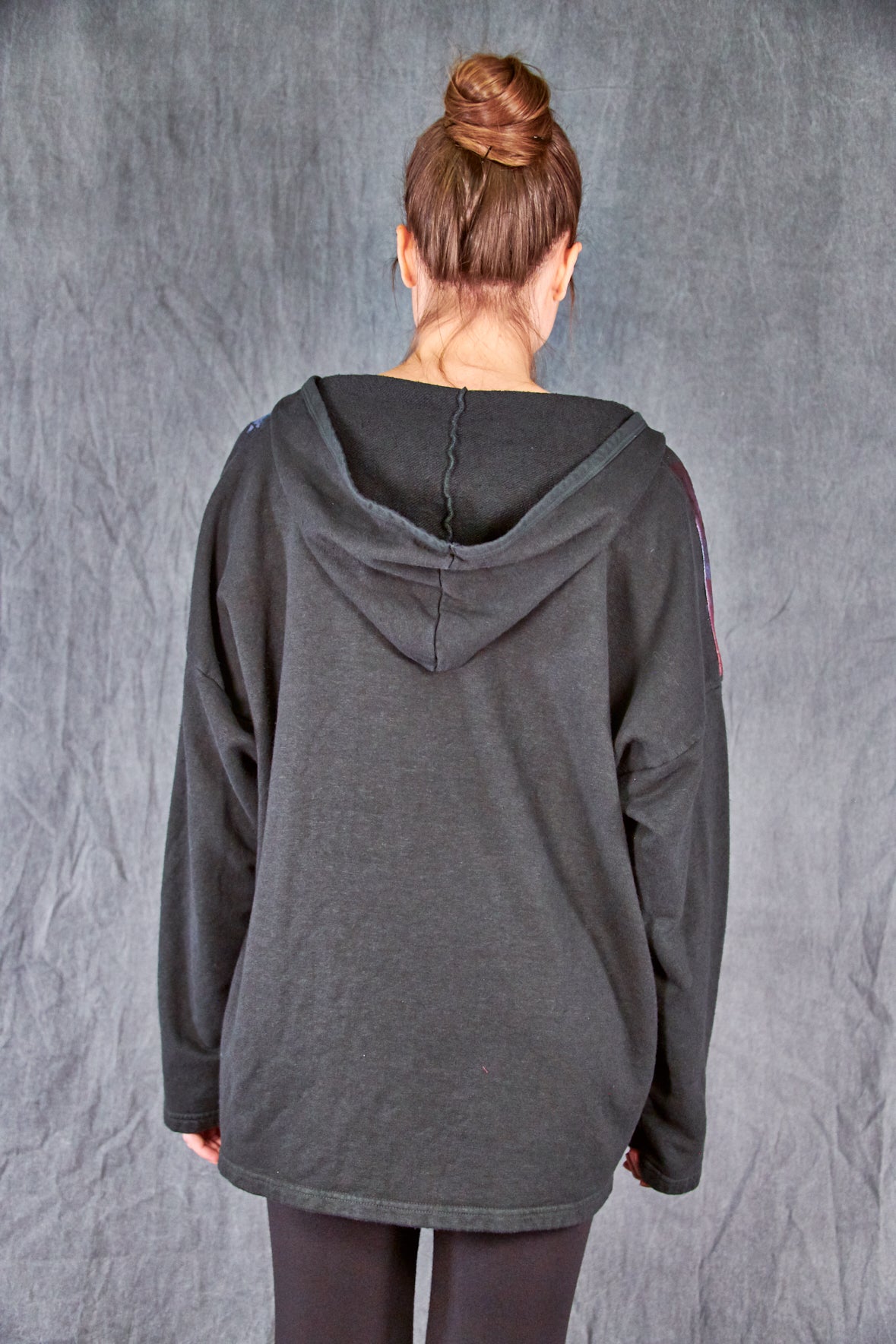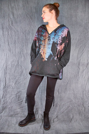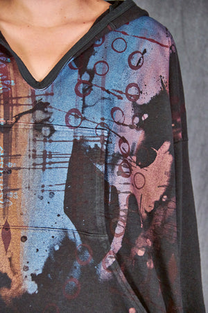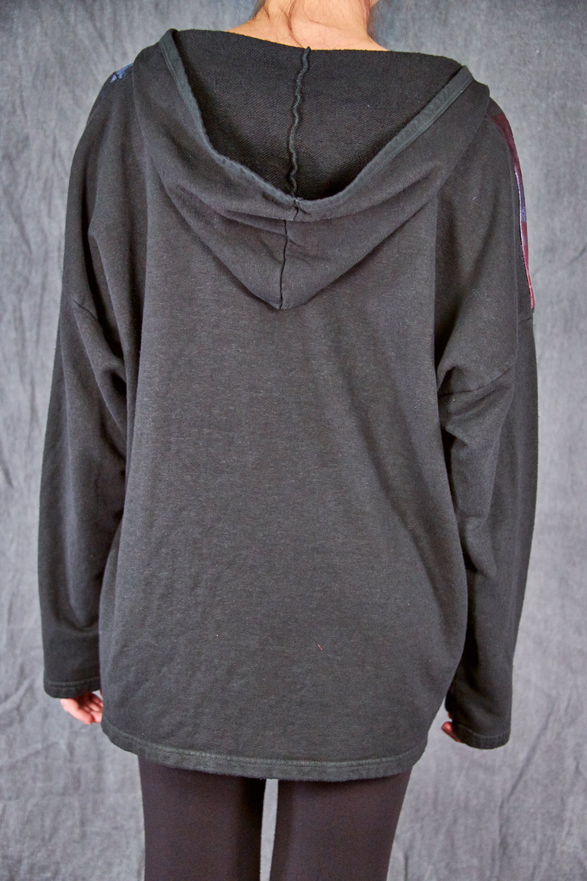 Easy throw on hoodie to top off your blue fish look. French terry hoodie made from a blend of hemp and organic cotton. Featuring an accent square front patch above pouch pocket and hood. Open neckline makes for ease of fit. This one size hoodie will fit best on sizes to about a 14, it looks good when it is a bit oversized. Just the right length to pair with our Lounge Billow Pant, Four Square Pant. Layer over your favorite printed top or tee...