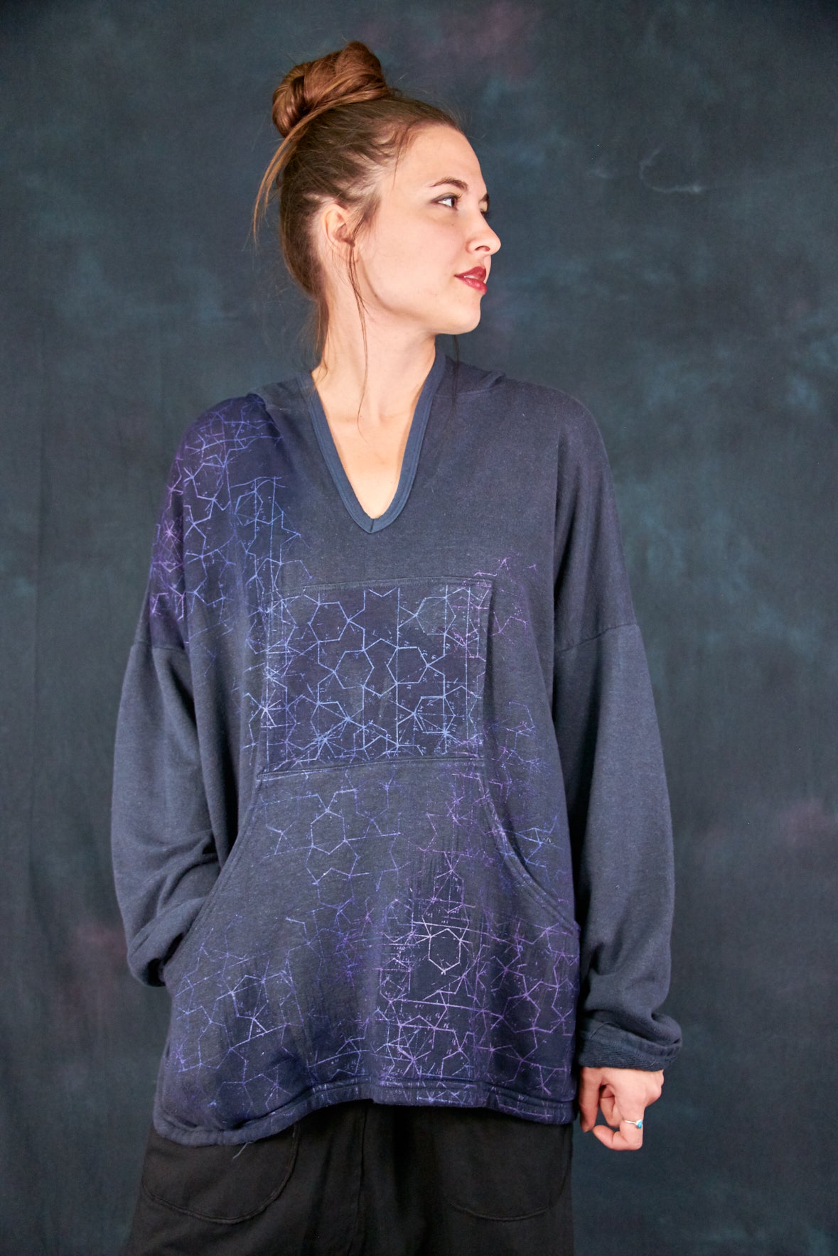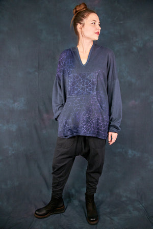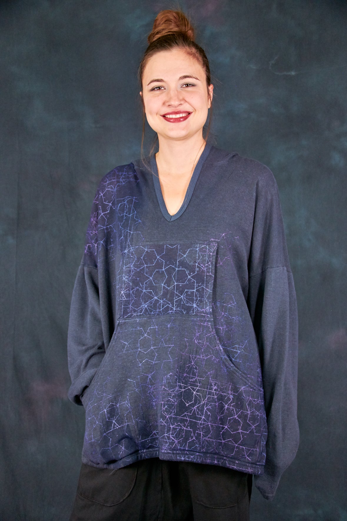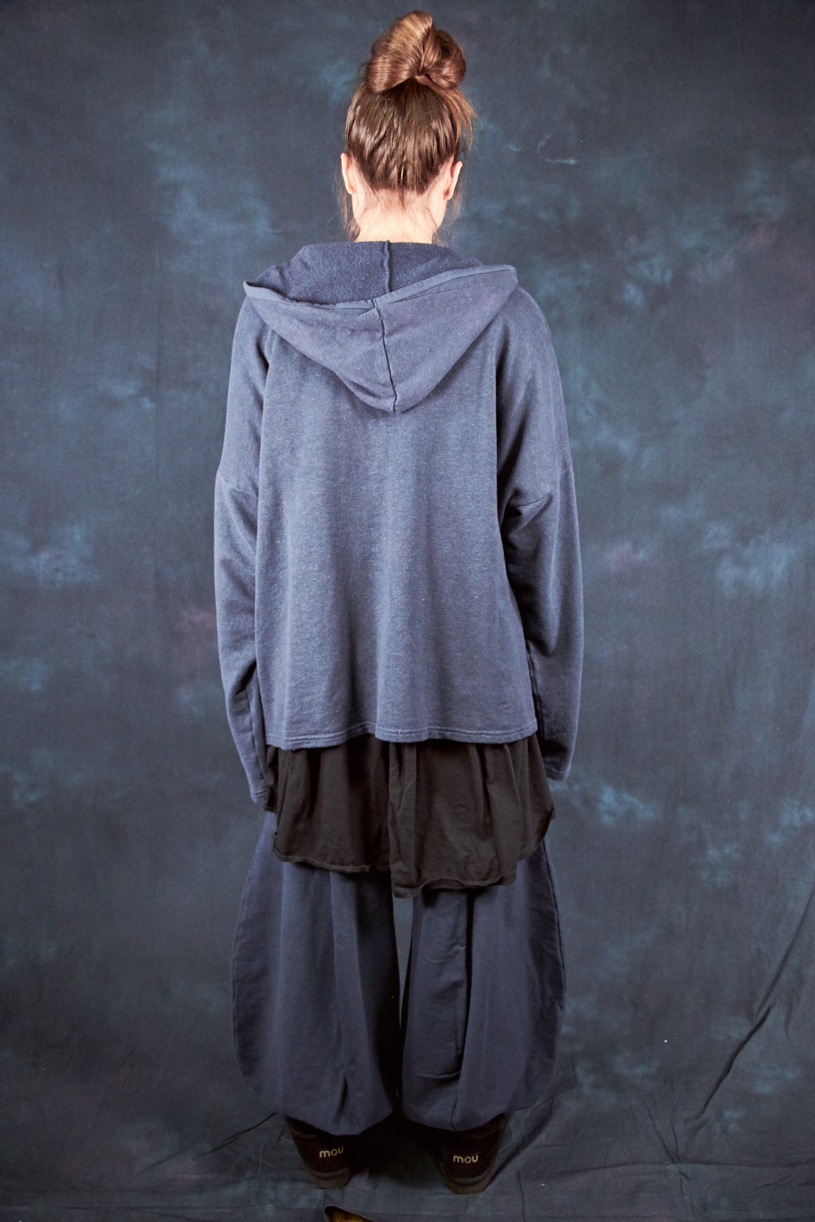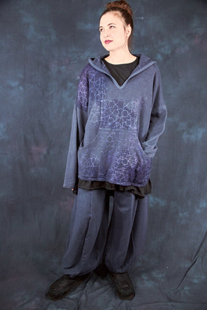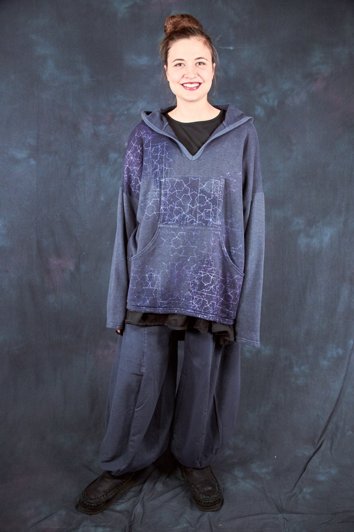 Easy throw on hoodie to top off your blue fish look. French terry hoodie made from a blend of hemp and organic cotton. Featuring an accent square front patch above pouch pocket and hood. Open neckline makes for ease of fit. This one size hoodie will fit best on sizes to about a 14, it looks good when it is a bit oversized. Just the right length to pair with our Lounge Billow Pant,  Four Square Pant. Layer over your favorite printed top or tee...