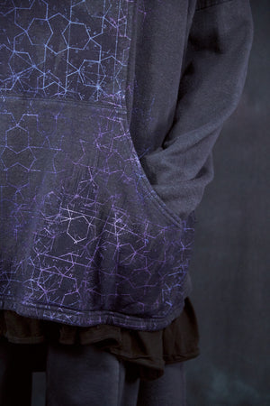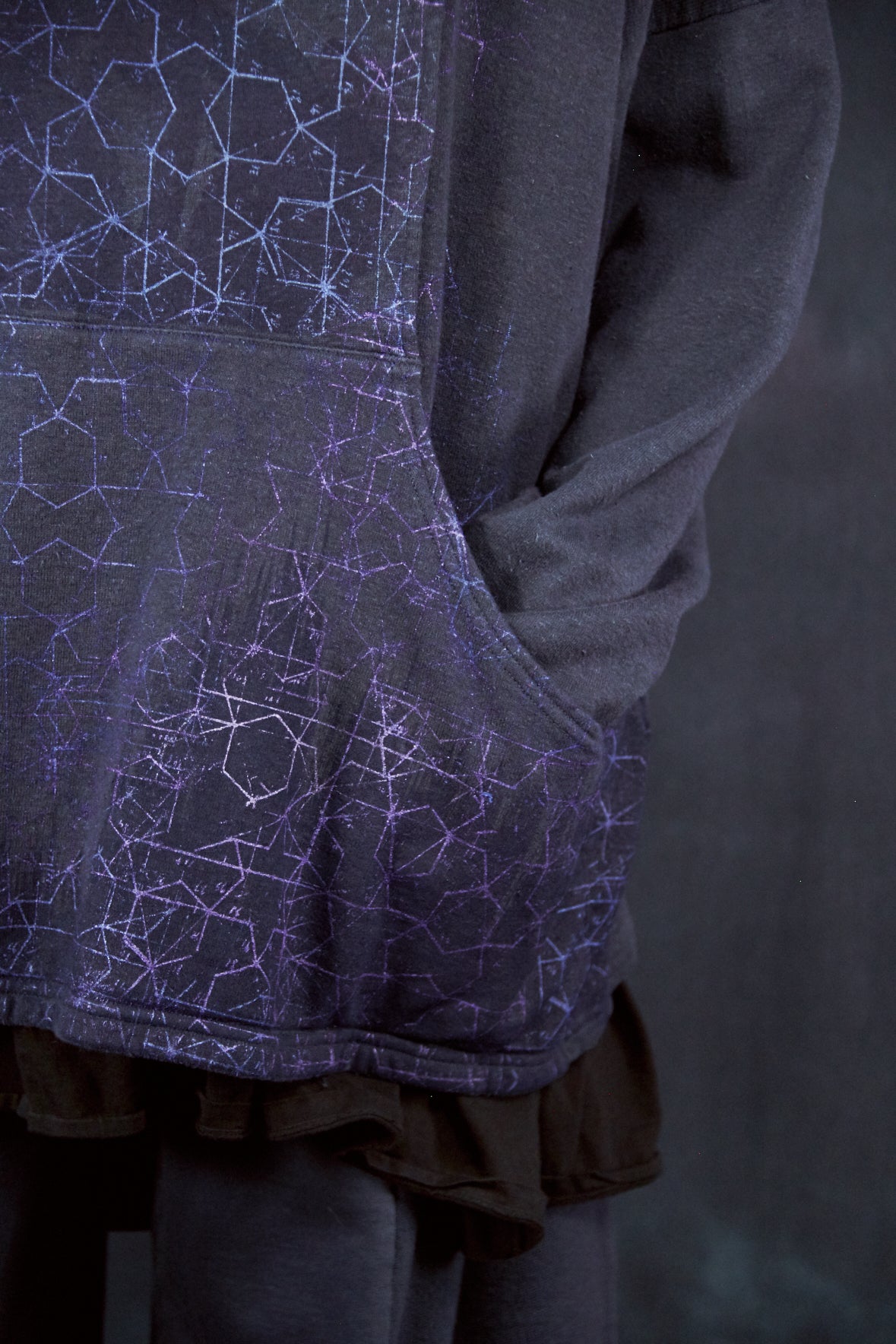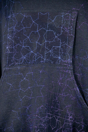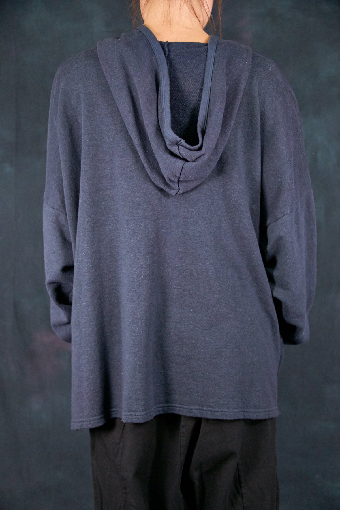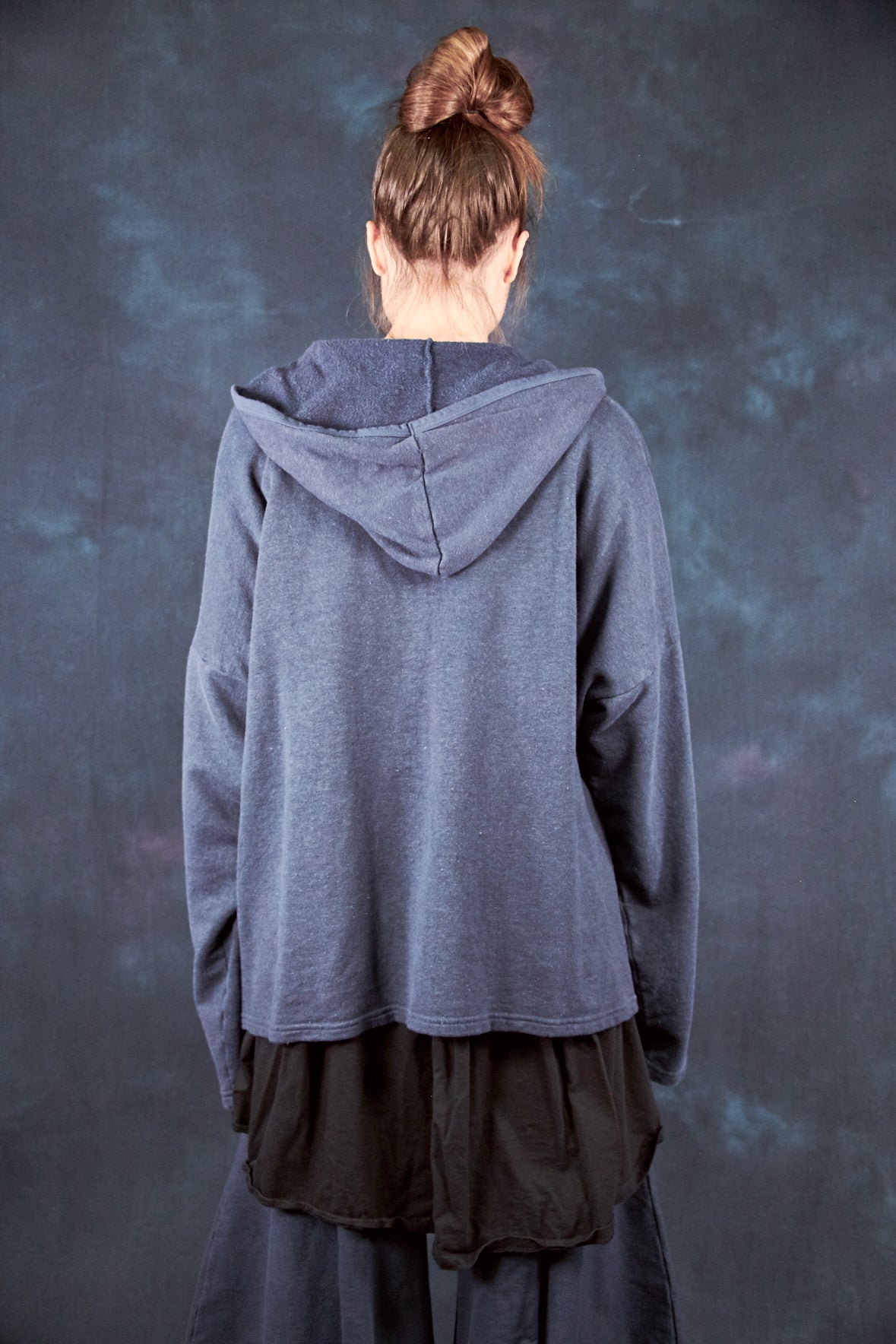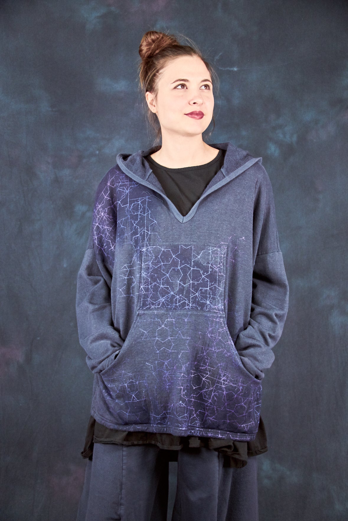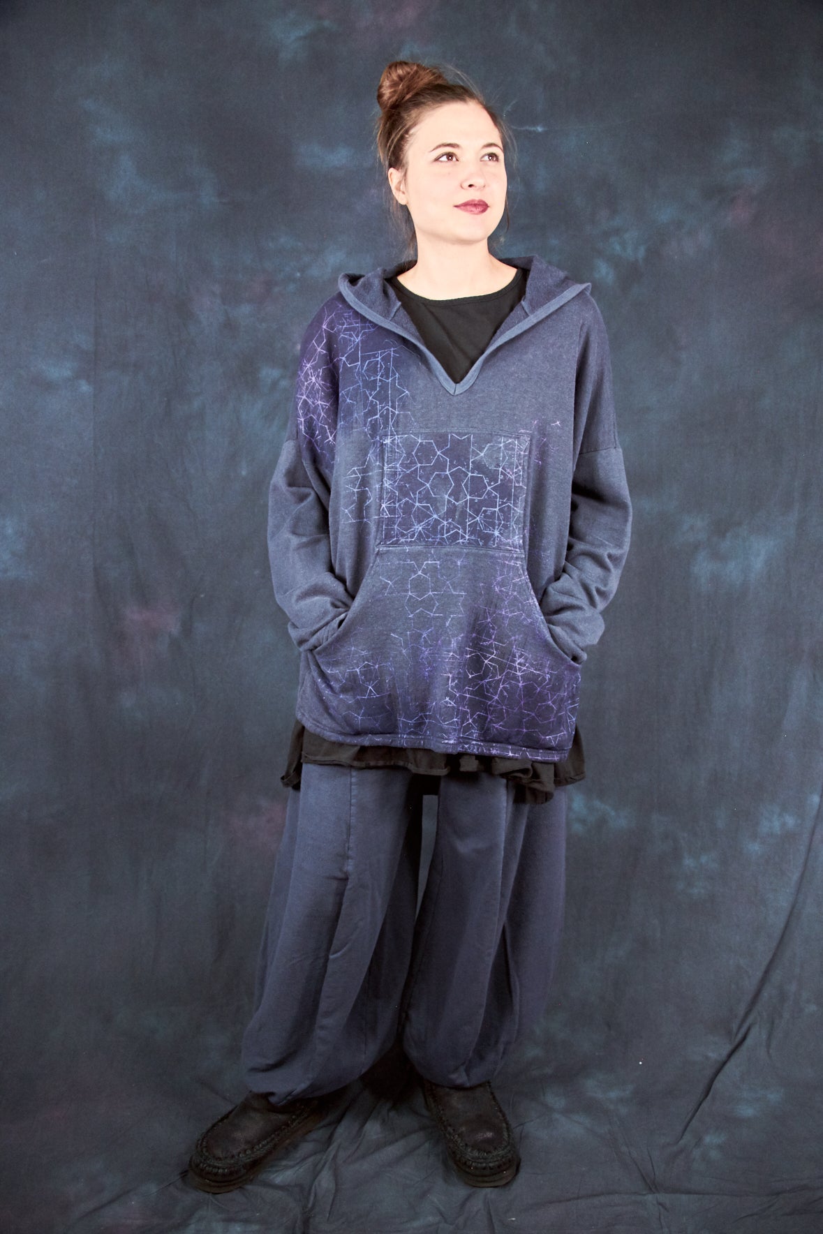 Easy throw on hoodie to top off your blue fish look. French terry hoodie made from a blend of hemp and organic cotton. Featuring an accent square front patch above pouch pocket and hood. Open neckline makes for ease of fit. This one size hoodie will fit best on sizes to about a 14, it looks good when it is a bit oversized. Just the right length to pair with our Lounge Billow Pant,  Four Square Pant. Layer over your favorite printed top or tee...