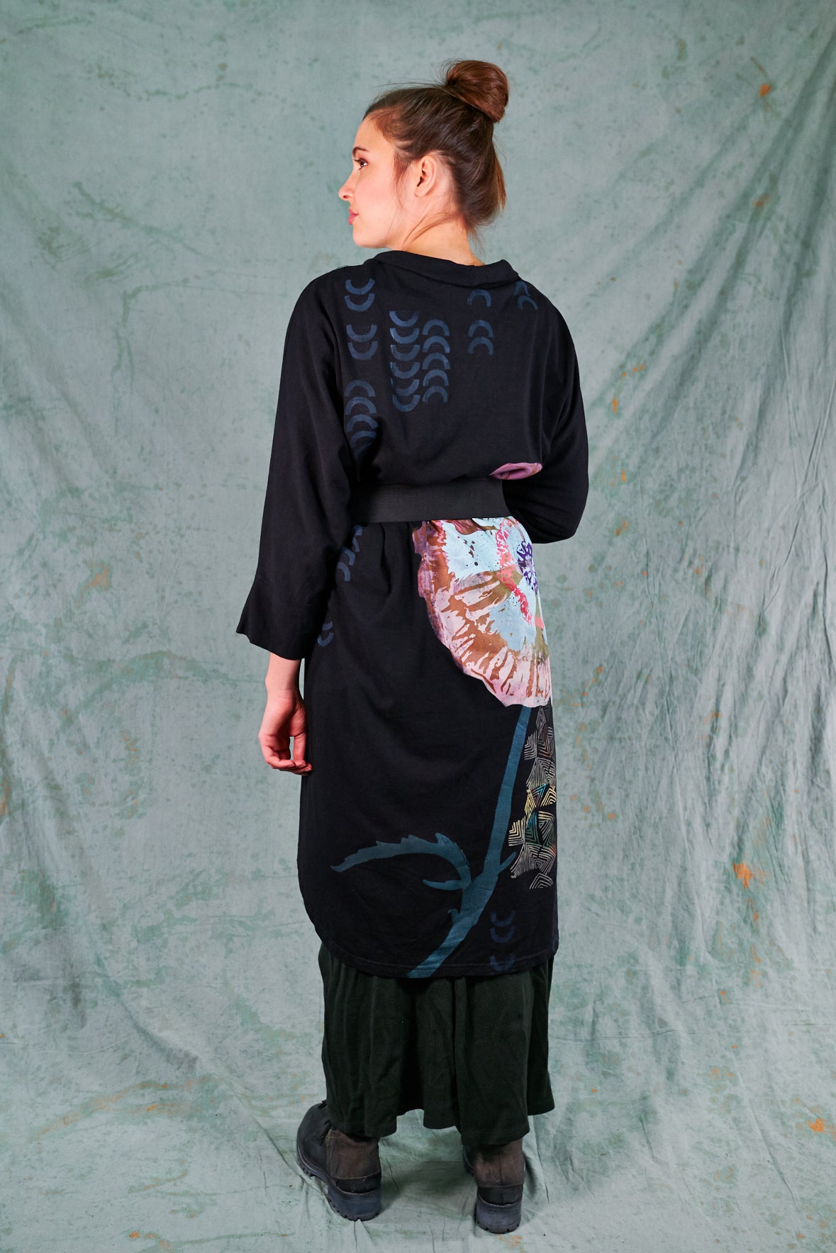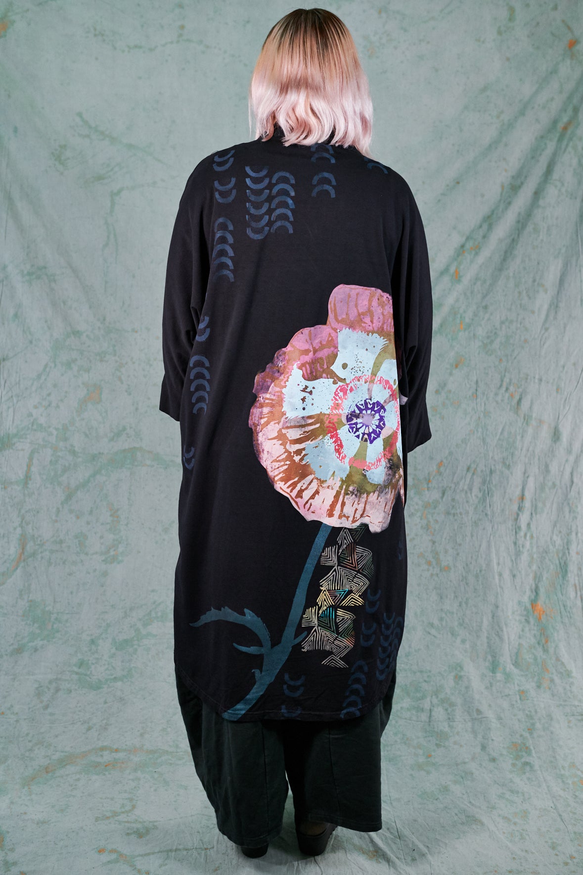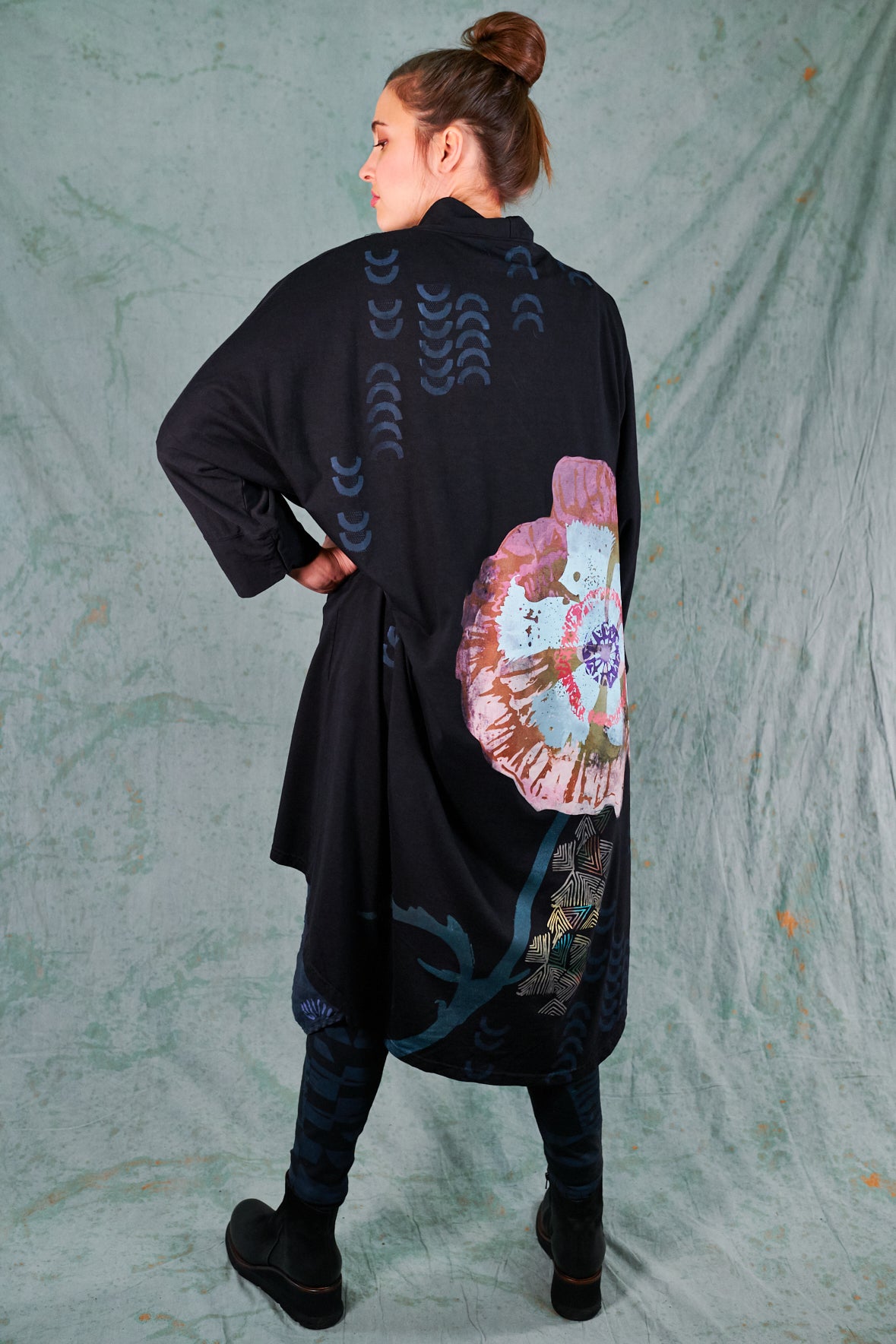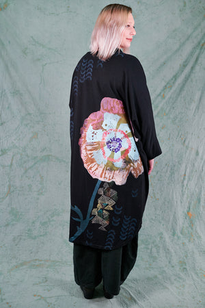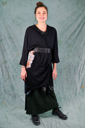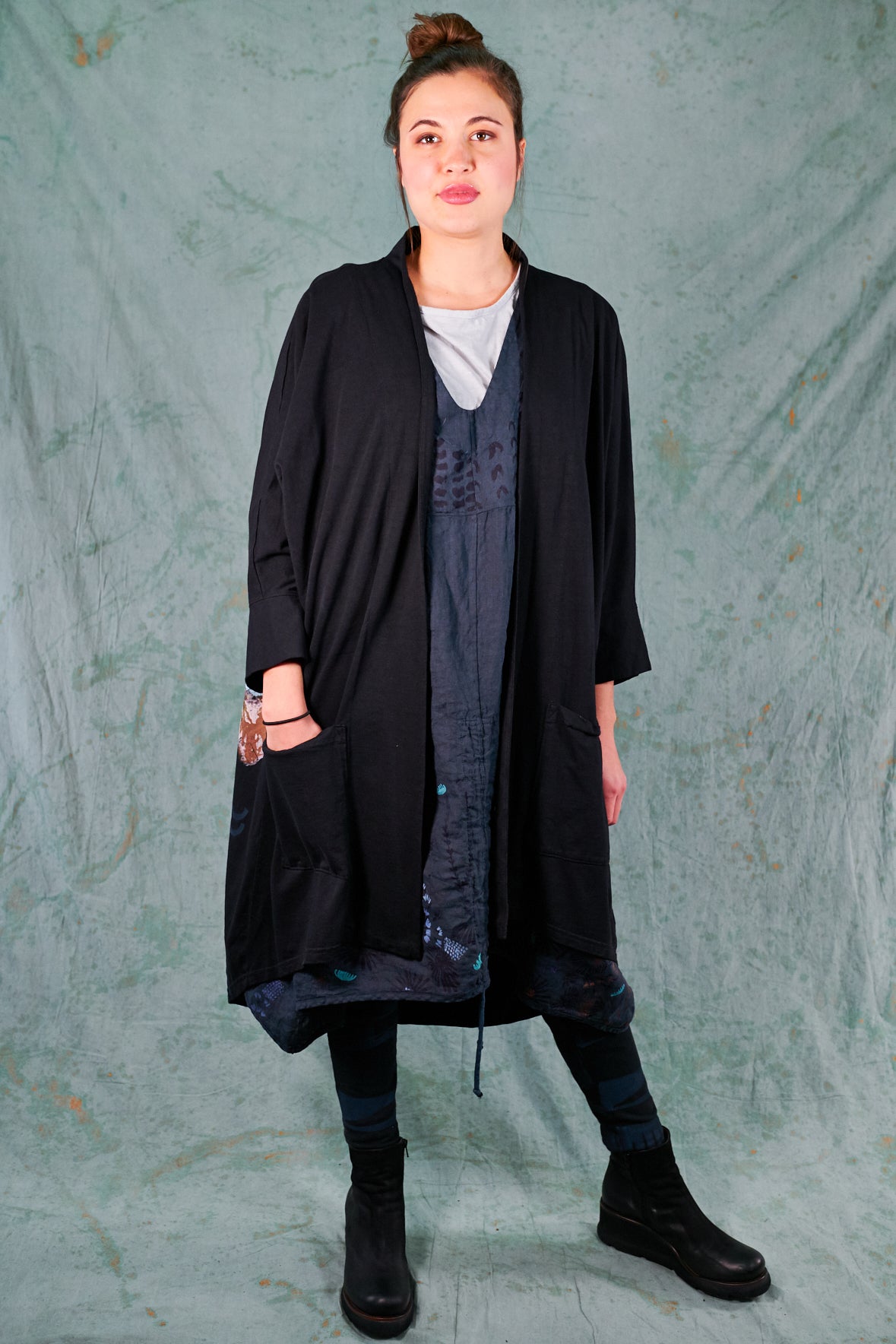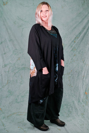 Hi-Lo, bamboo fabric, mid length kimono with 2 pouch pockets. Shawl collar with ¾ sleeves. Stylish layering piece to throw on over any outfit.