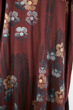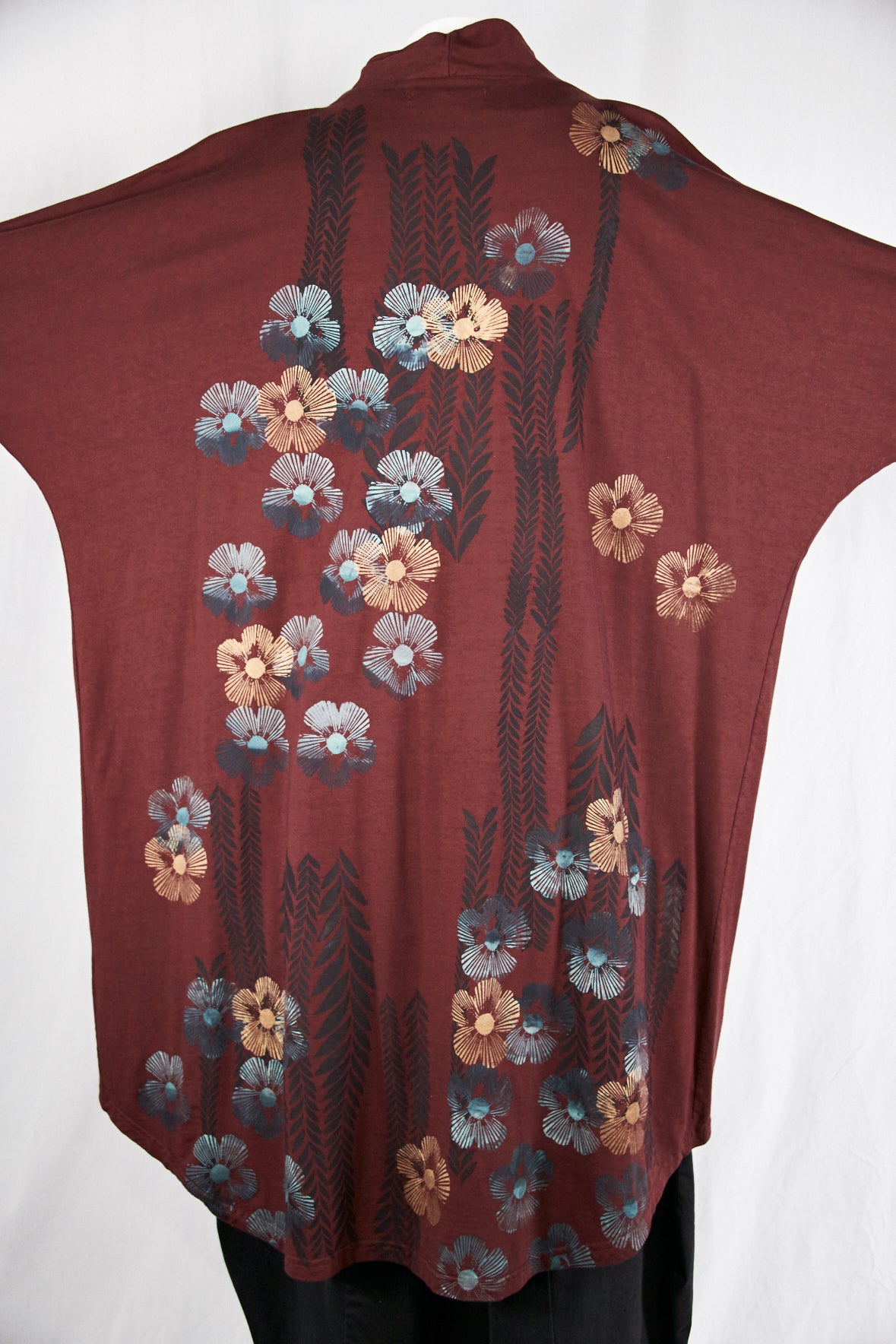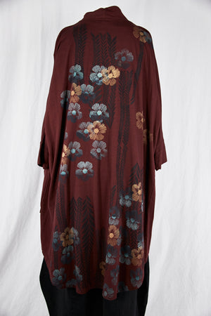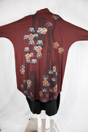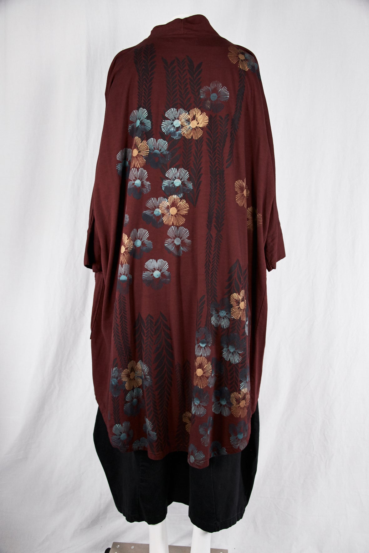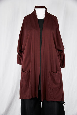 Slightly Hi-Lo, heavy and smooth bamboo organic cotton blend fabric, mid length kimono with 2 pouch pockets. Shawl collar with ¾ sleeves. Stylish layering piece to throw on over any outfit.