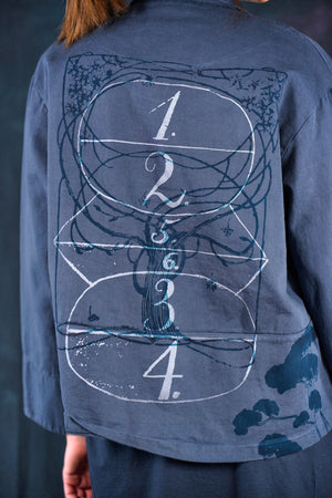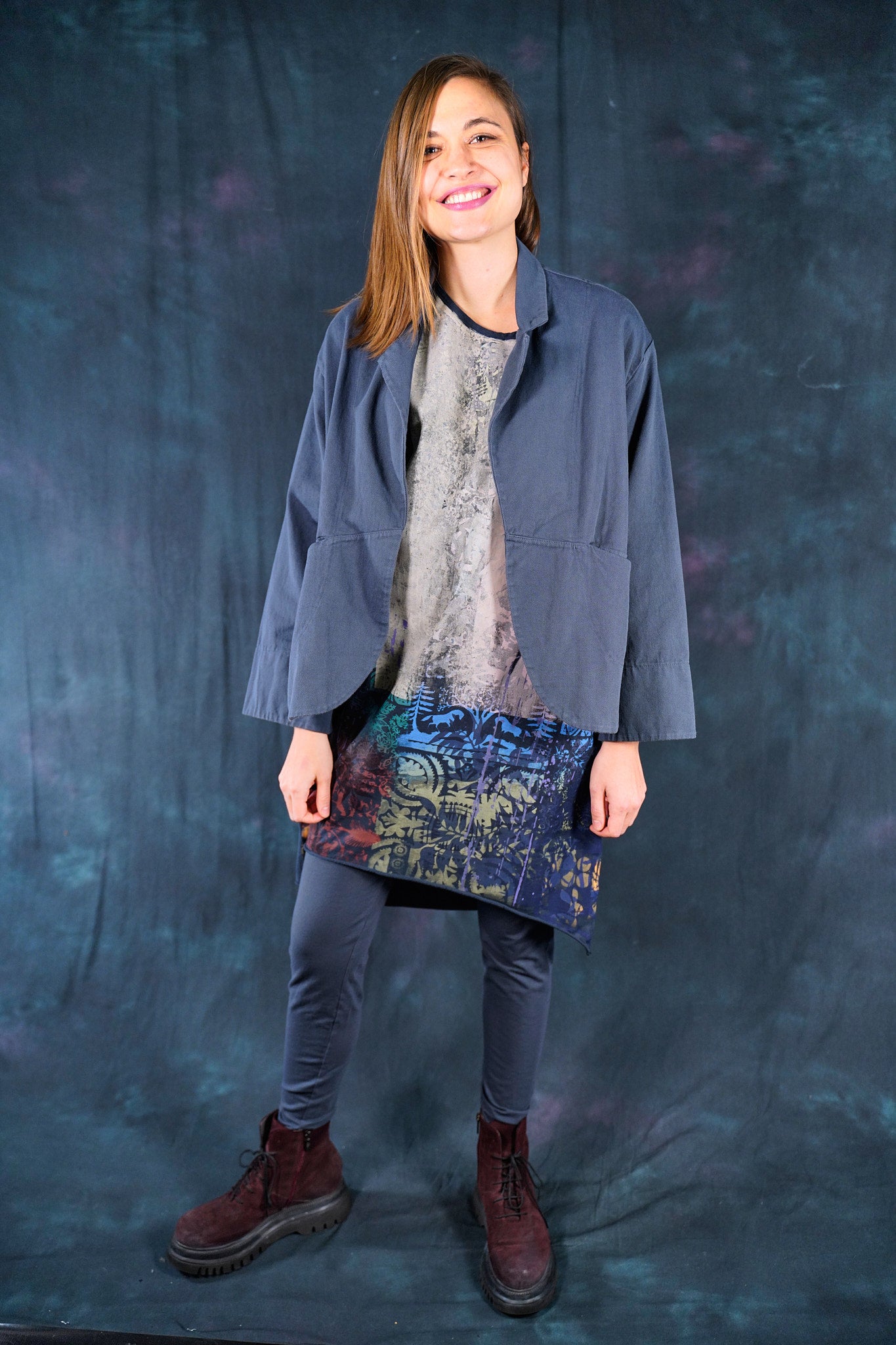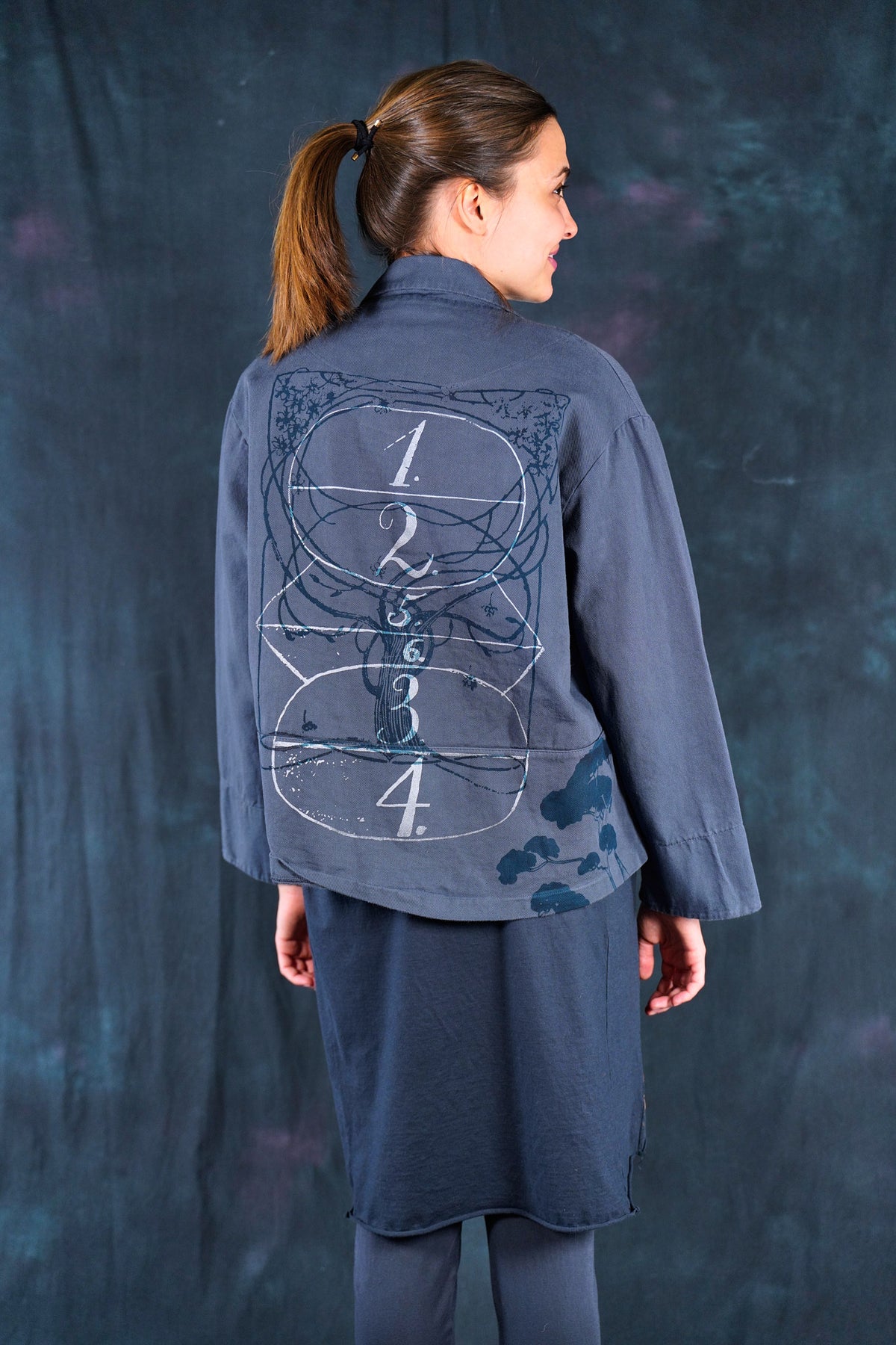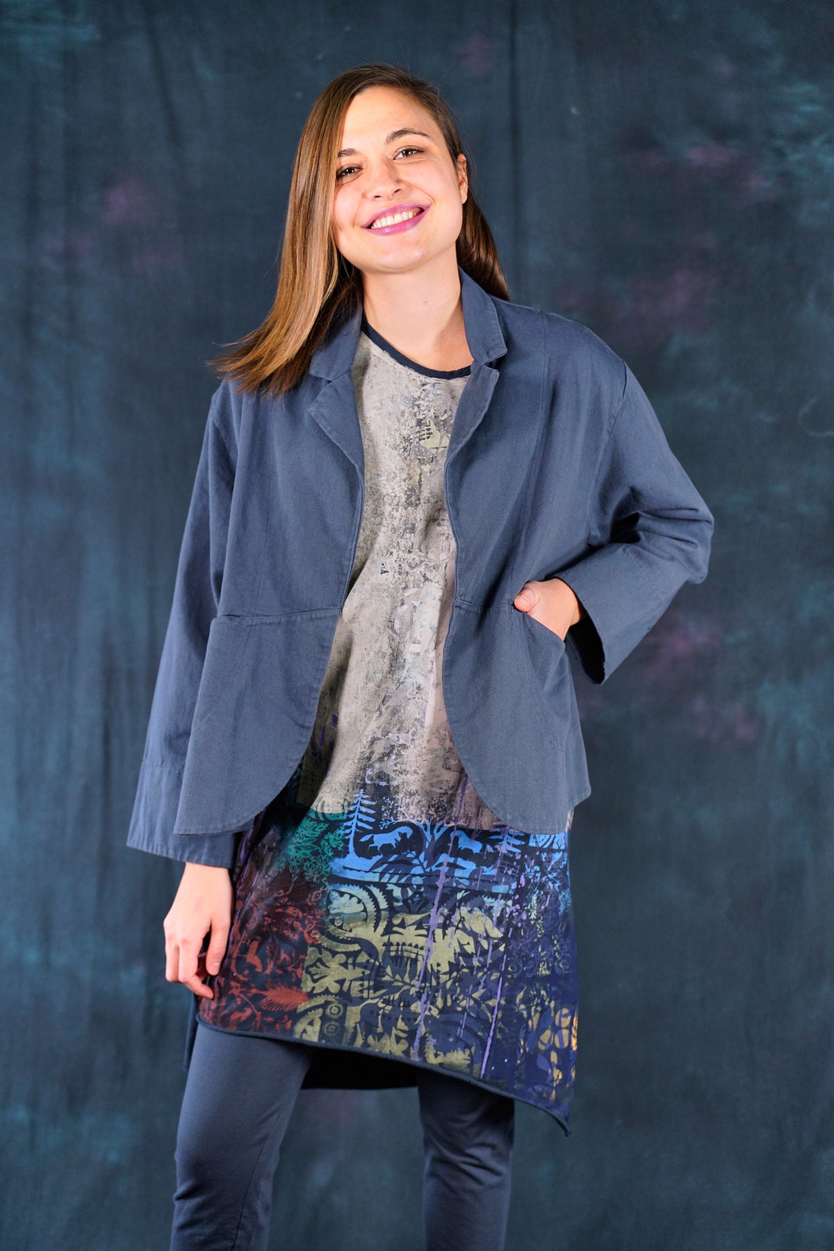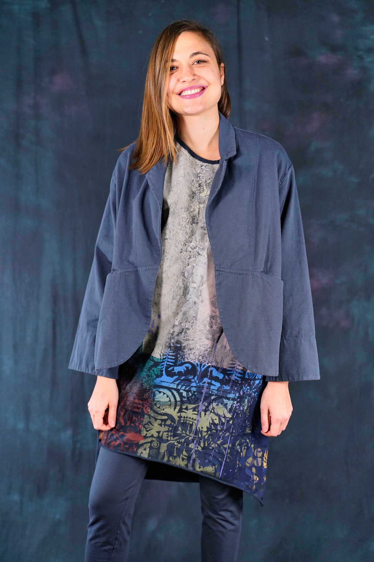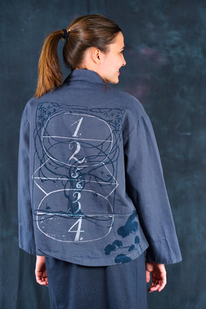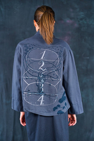Made of soft, thick Japanese Cotton Twill. This little jacket features an open front, two pockets, and Wear layered over the #6211 Apron and #3239 Pants in the same color or mix it up with color: incense in the styles mentioned. Color is a nice deeper greyblue.