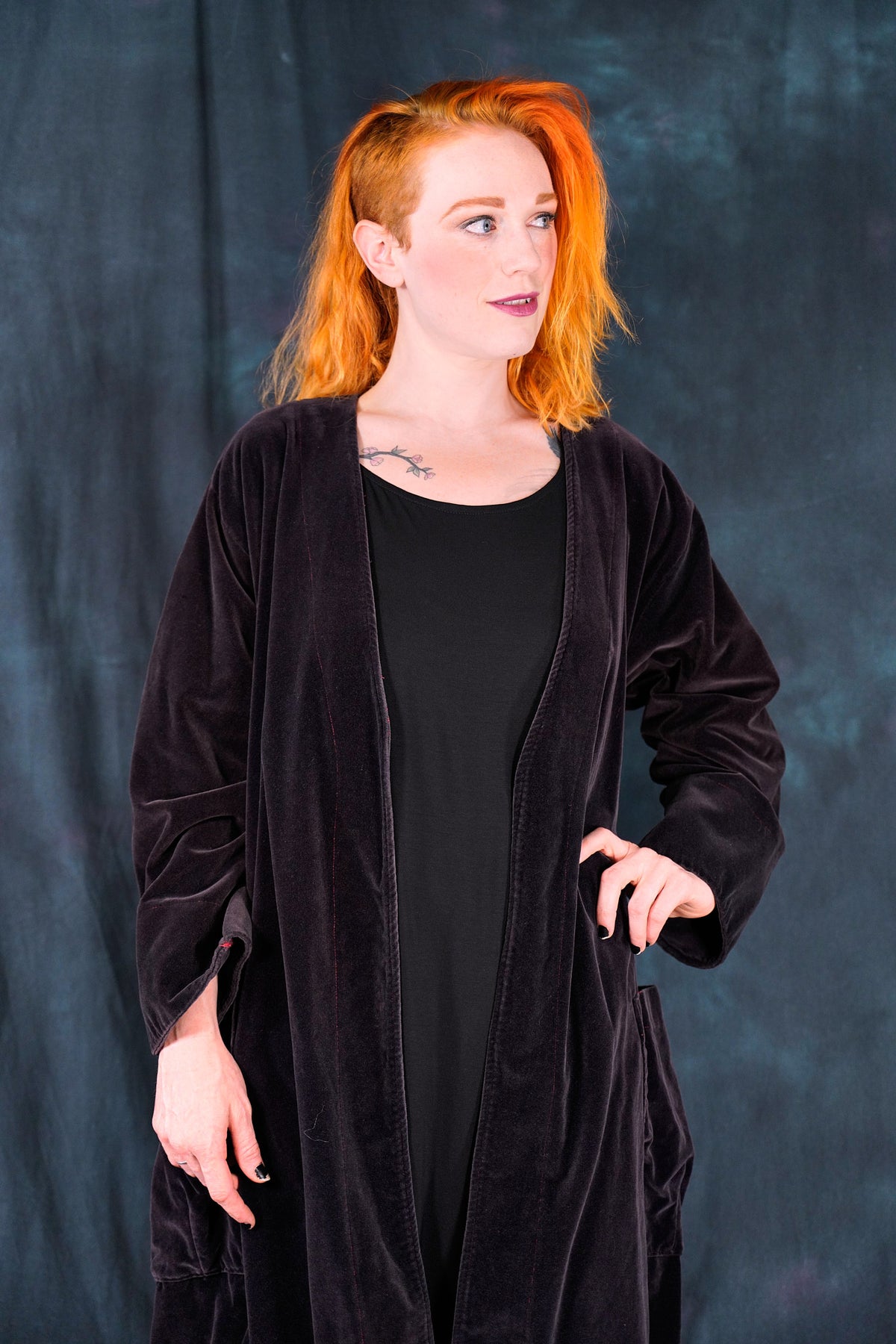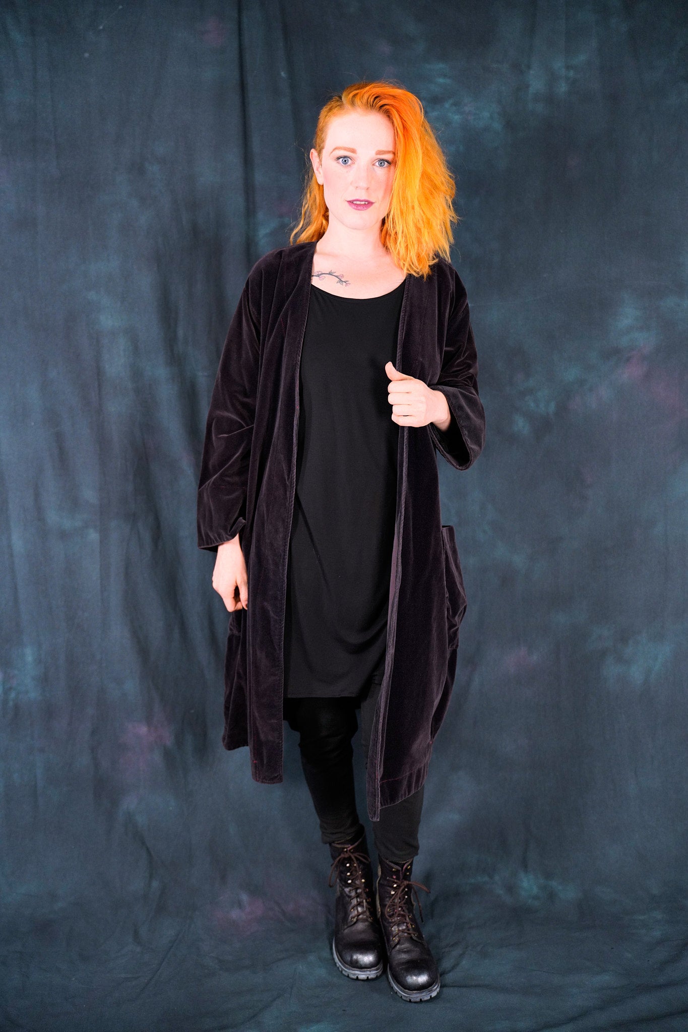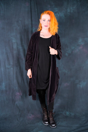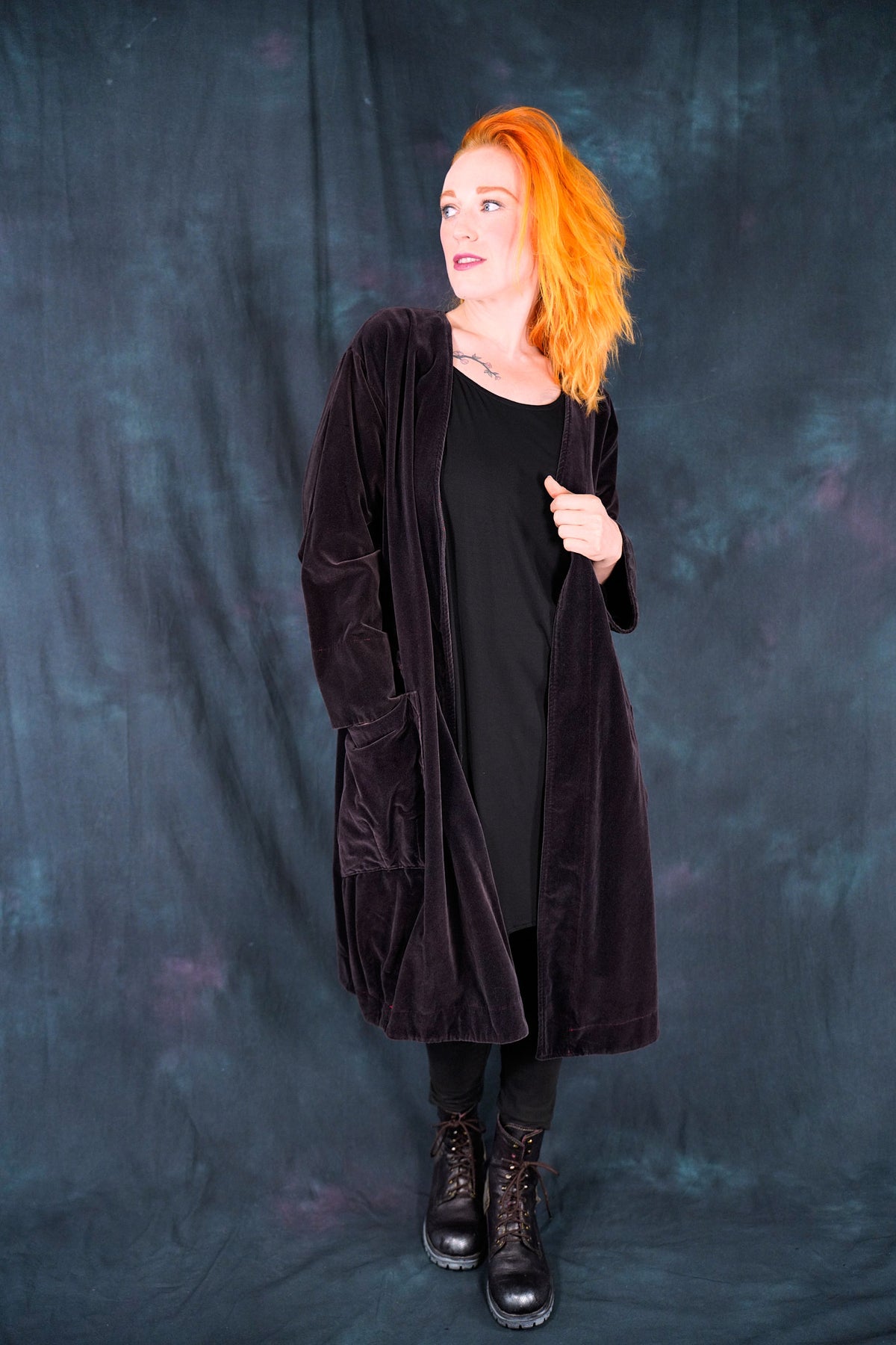 This luxe velvet coat features a darted hem, shaped body and two large pockets, with an open front. Wear over jeans or a dressy Blue Fish ensemble. This is a gorgeous cool plum ton, unprinted.