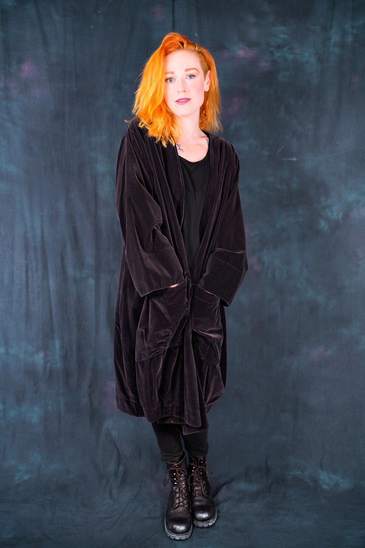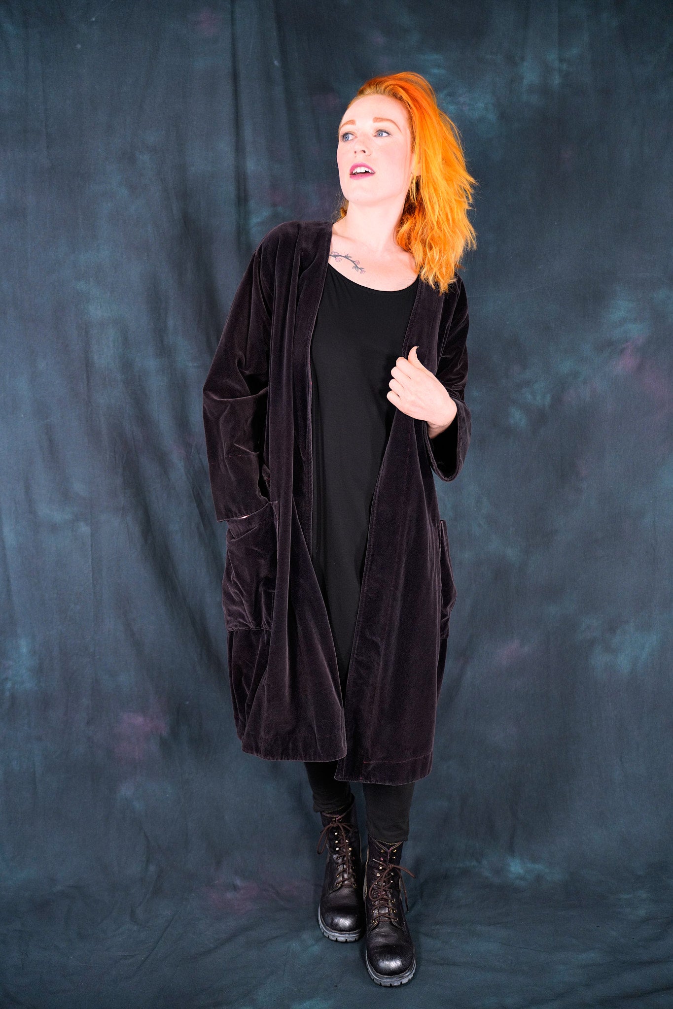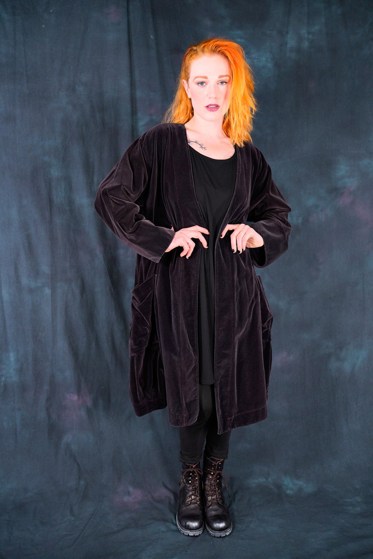This luxe velvet coat features a darted hem, shaped body and two large pockets, with an open front. Wear over jeans or a dressy Blue Fish ensemble. This is a gorgeous cool plum ton, unprinted.