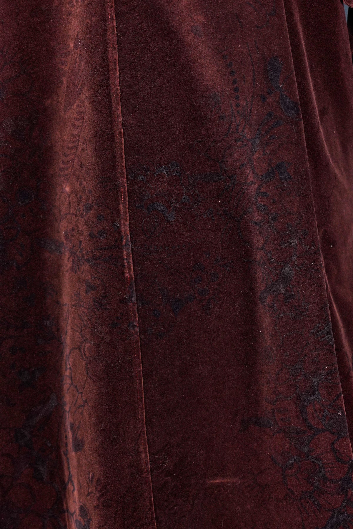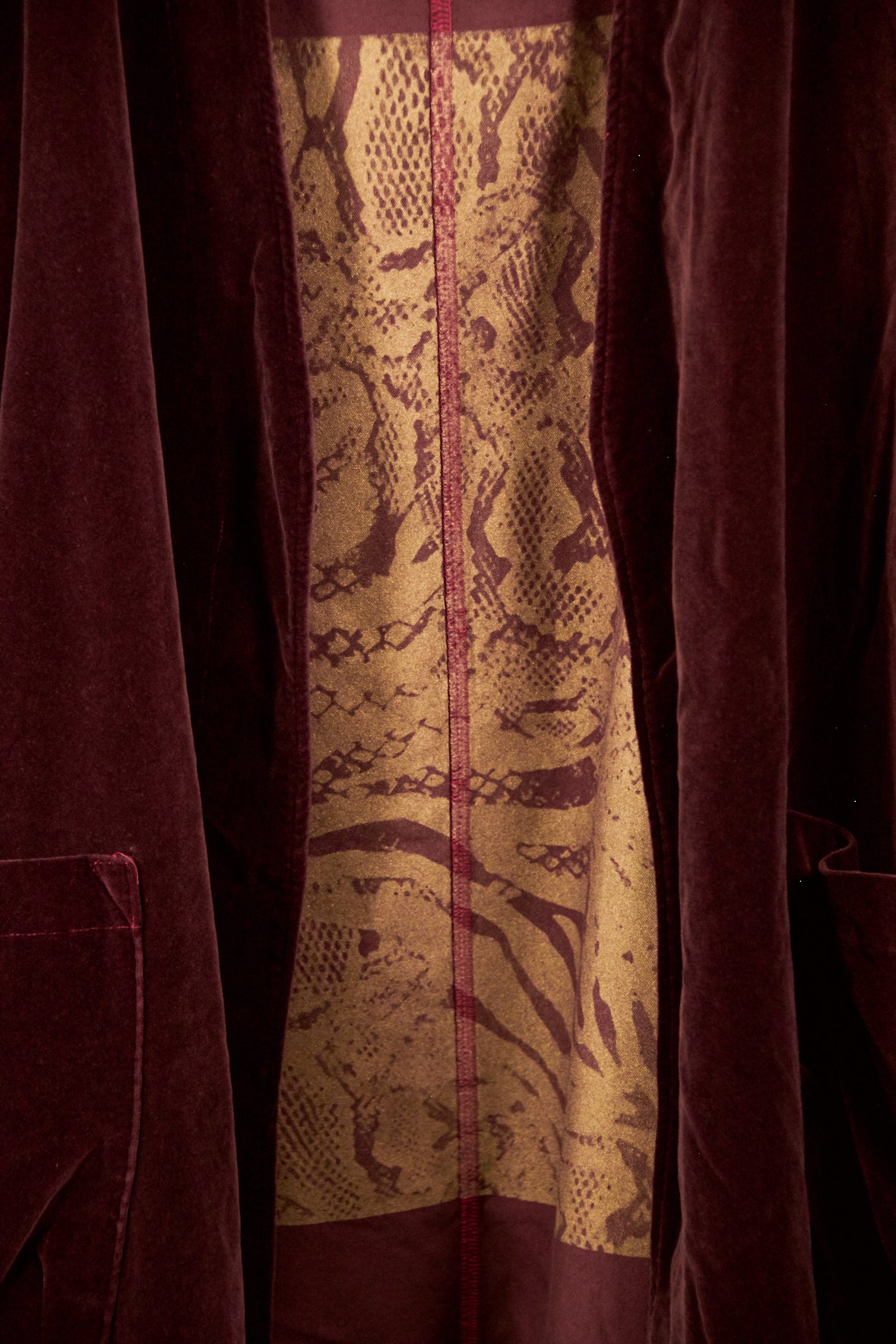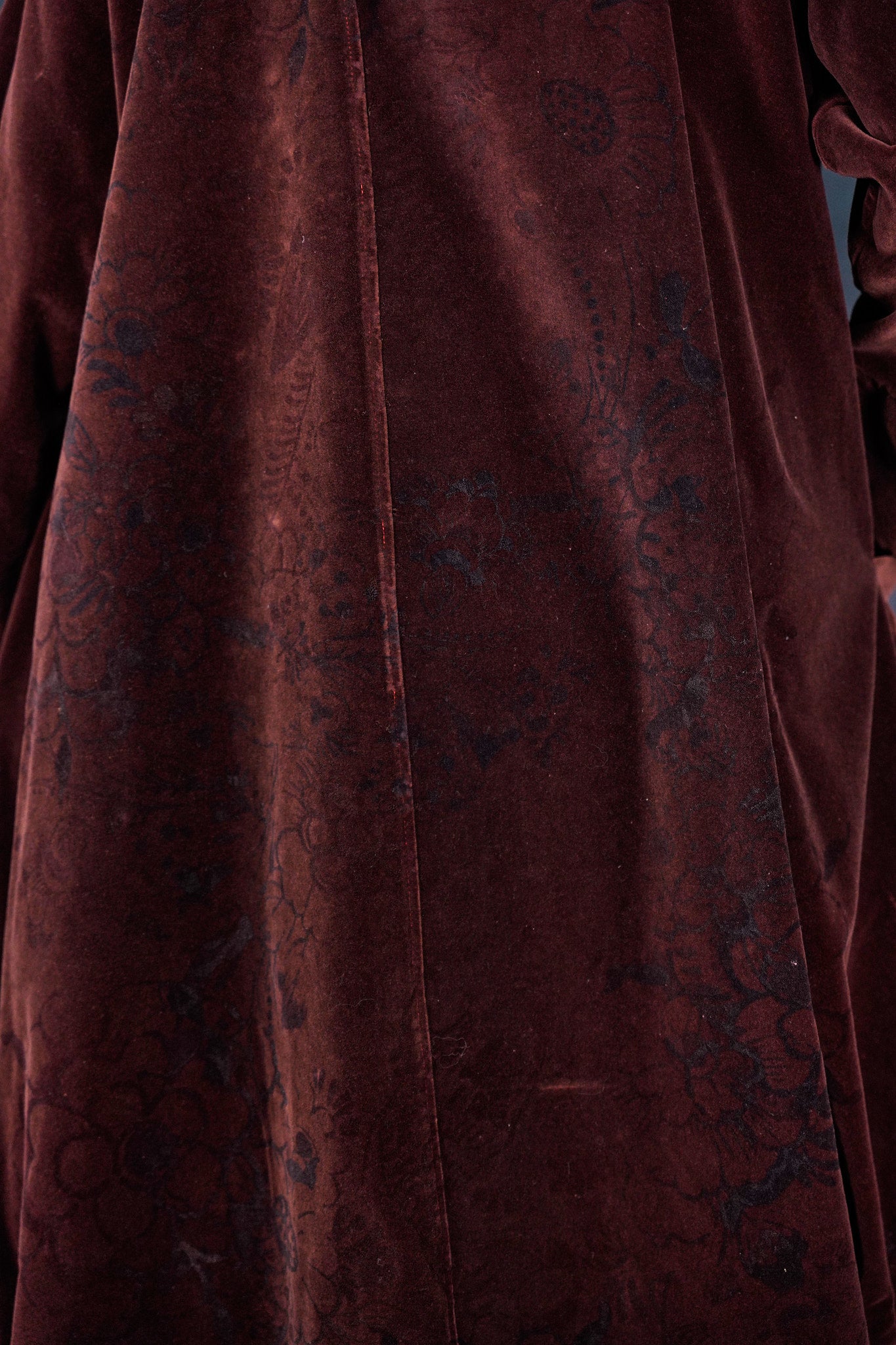 100 % Cotton Velvet Coat is printed inside and out. Allover print on the back is a rich, subtle and beautiful antiqued botanical & bird, please see close ups.