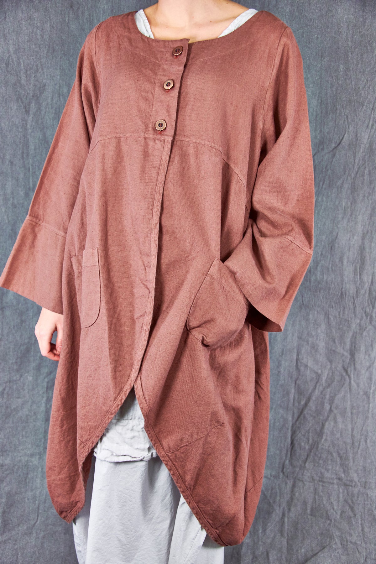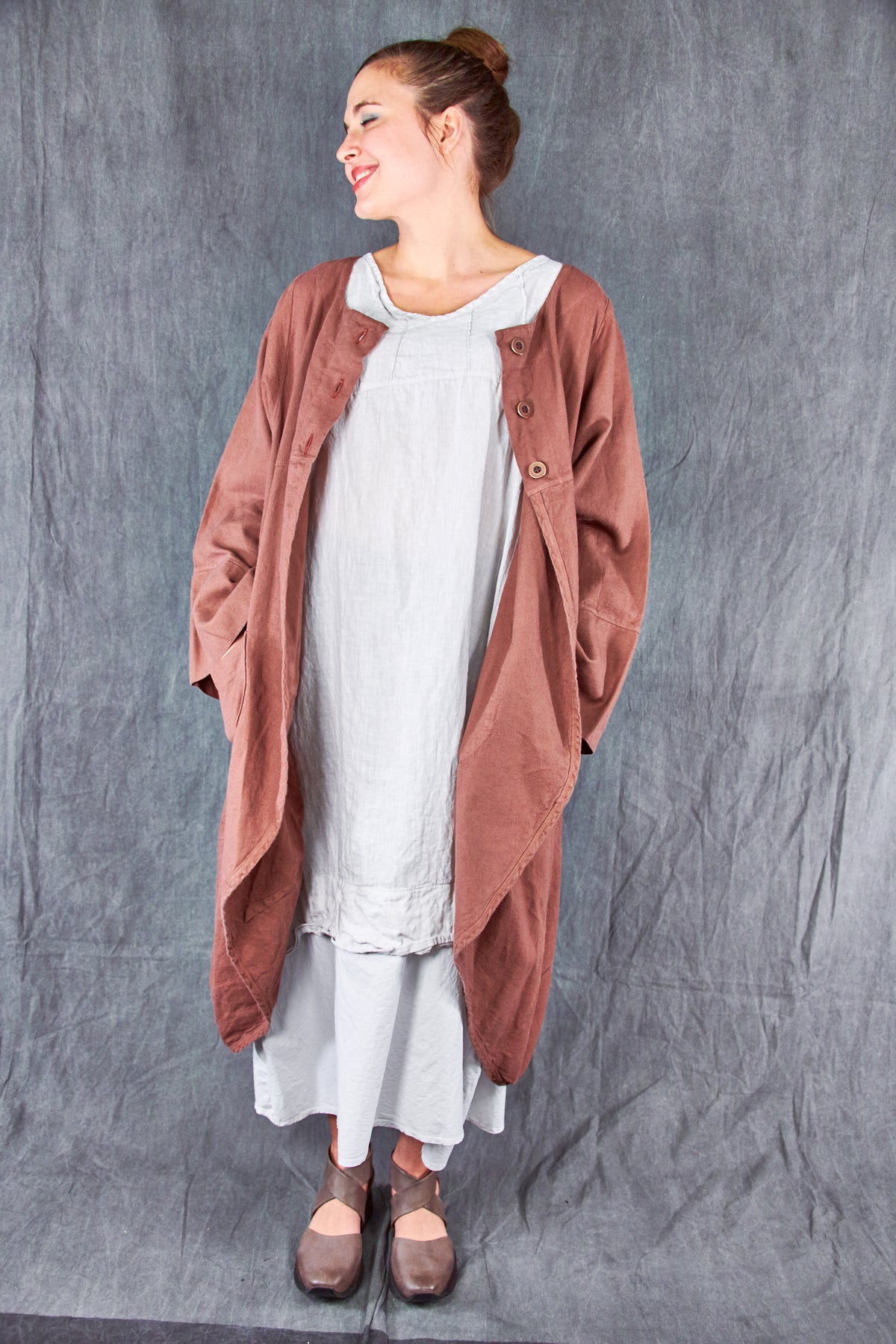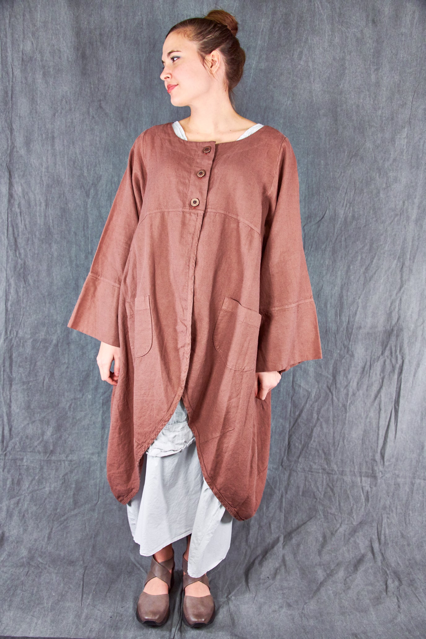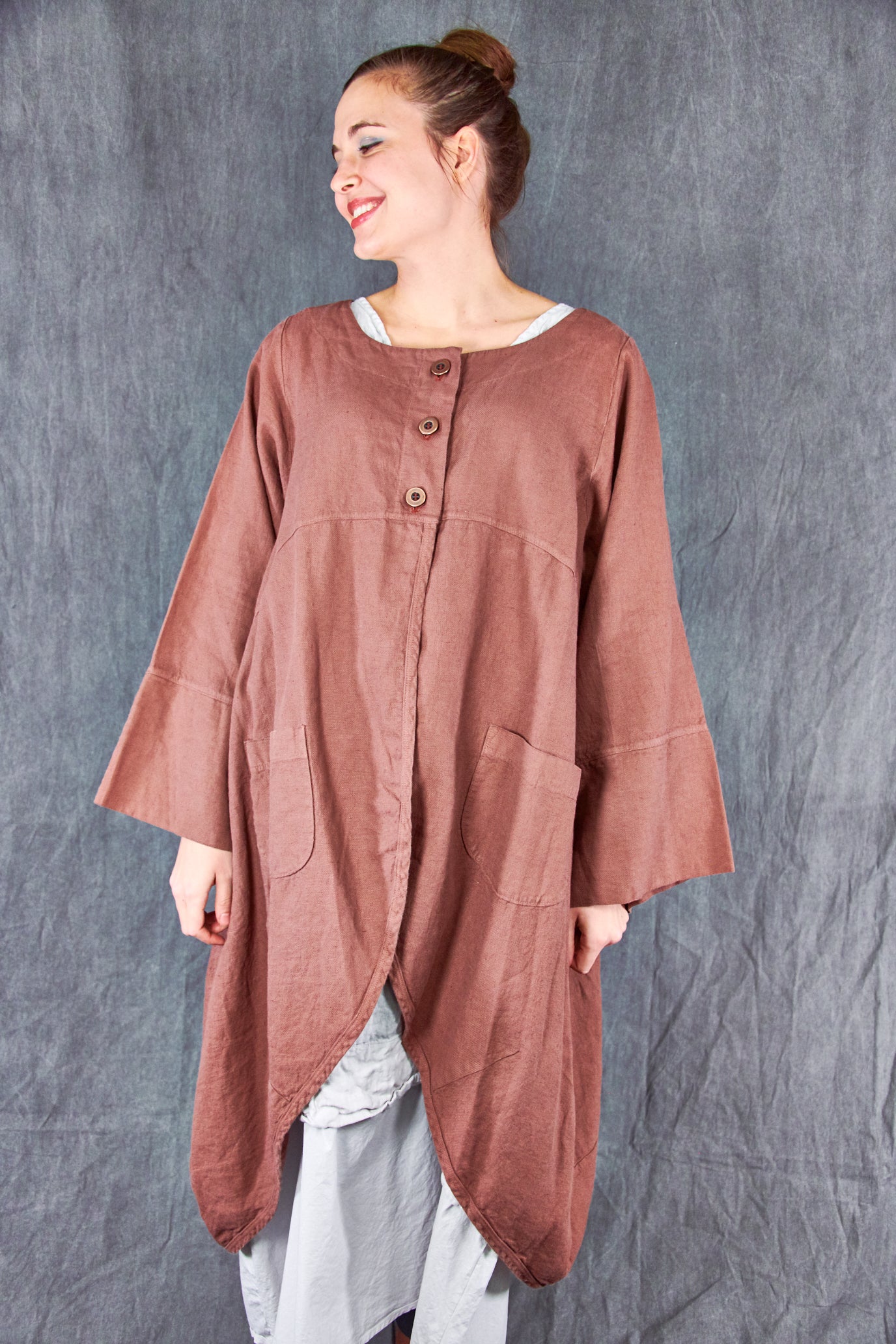 Bell shaped duster jacket Crafted from our signature 100% Linen. Featuring our heaviest weight linen for transitional seasons. Featuring 2 front patch pockets, topstitching at empire waistline for definition and a 3 button closure. The perfect finishing touch for any outfit. MADE IN THE USA.