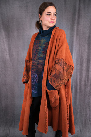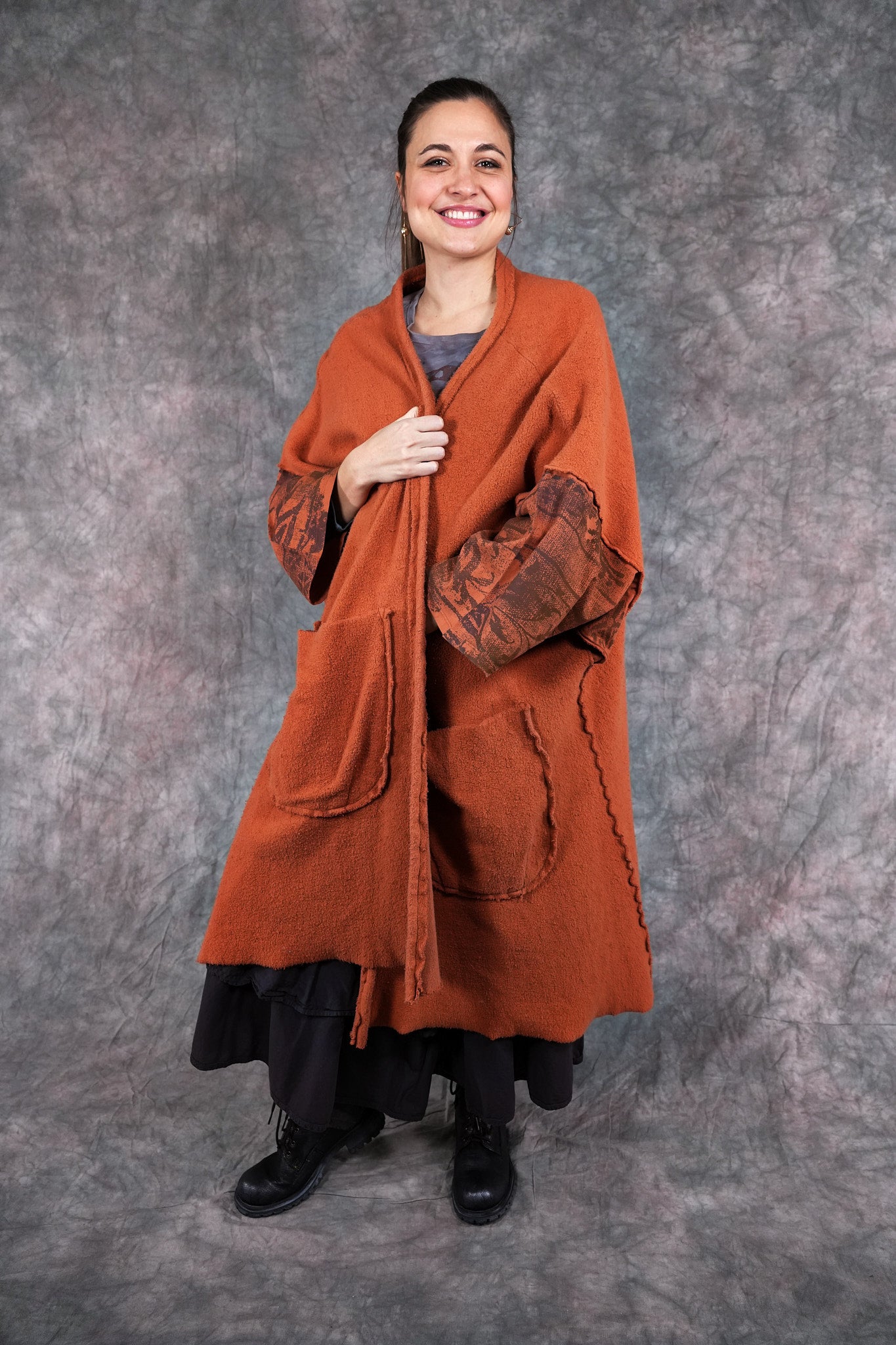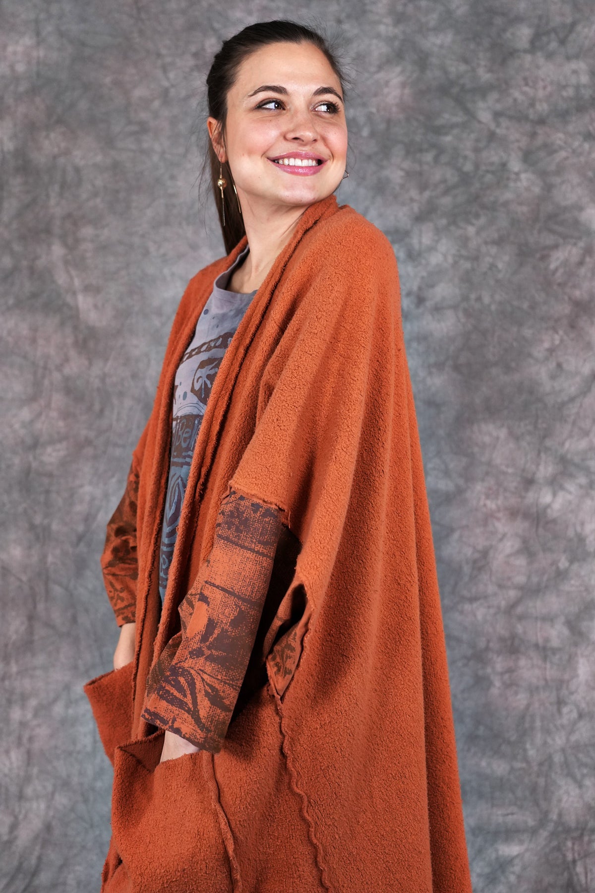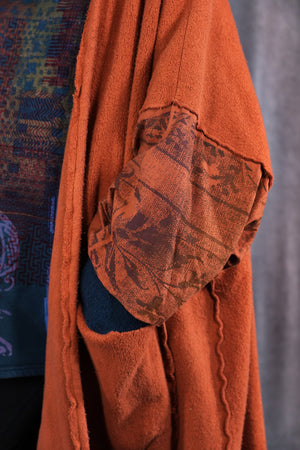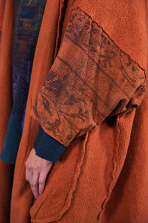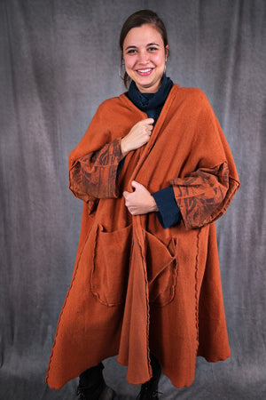 Heavy & substantial weight organic cotton sherpa ( not the light lofty kind) This means warmth. (This is actually a wearable blanket, with big pockets and light sleeves… so you can wear it from the sofa to go get your tea...and to stay cozy all the way!)The thick heavy sherpa is made just for us in the Carolinas. So soft and dense, really keeps you warm! Layers over anything quite easily.