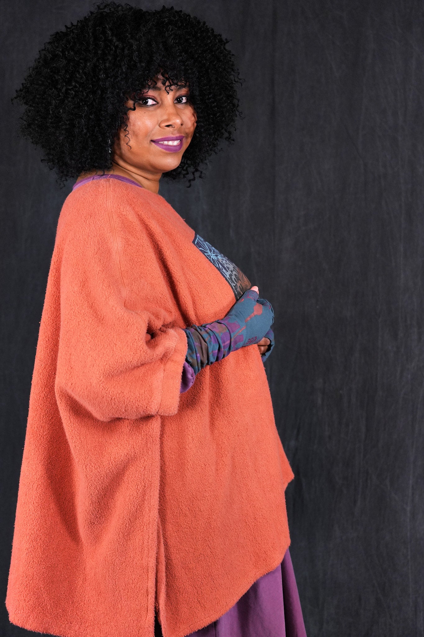 Lush sherpa vest with loose gathered sleeves and open sides. Perfect piece to drape over any Blue Fish outfit