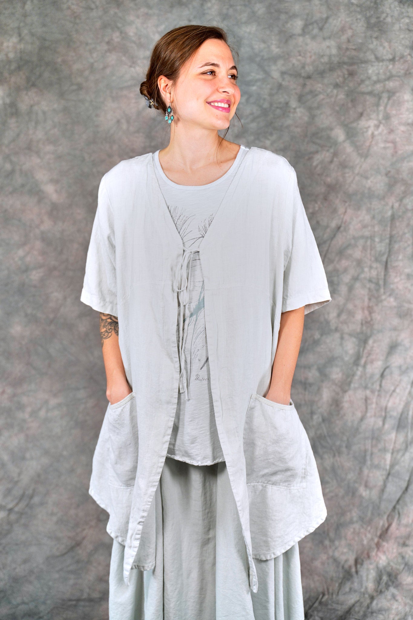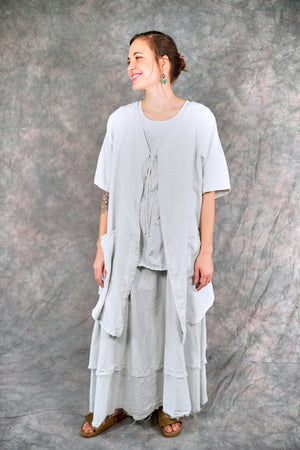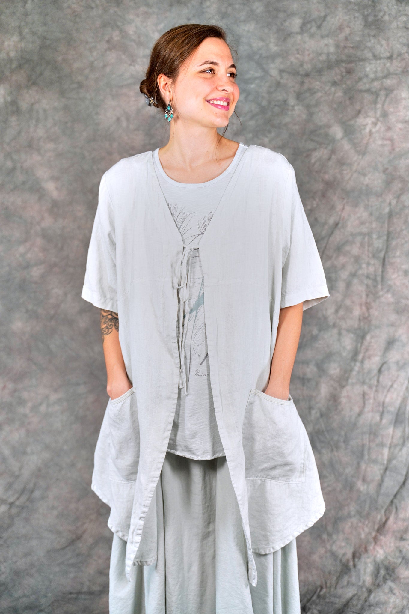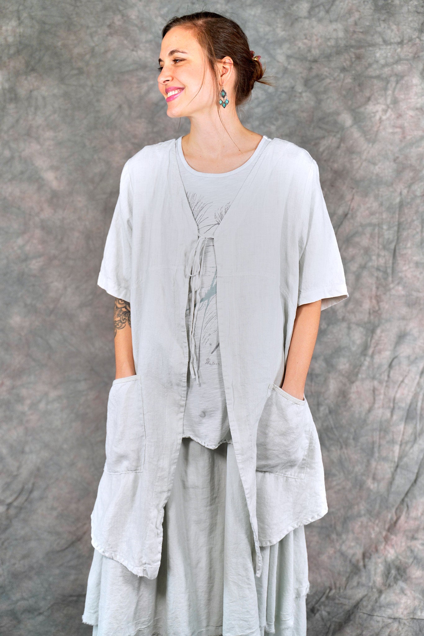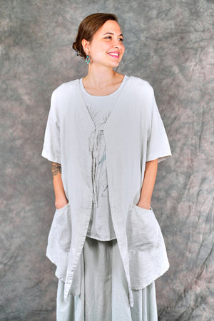 Soft 100% linen to wear open or optionally closed with a simple tie closure. Throw it on over  a #1210 tank top or dress. The pockets make it a perfect for travel or a walk in the park.