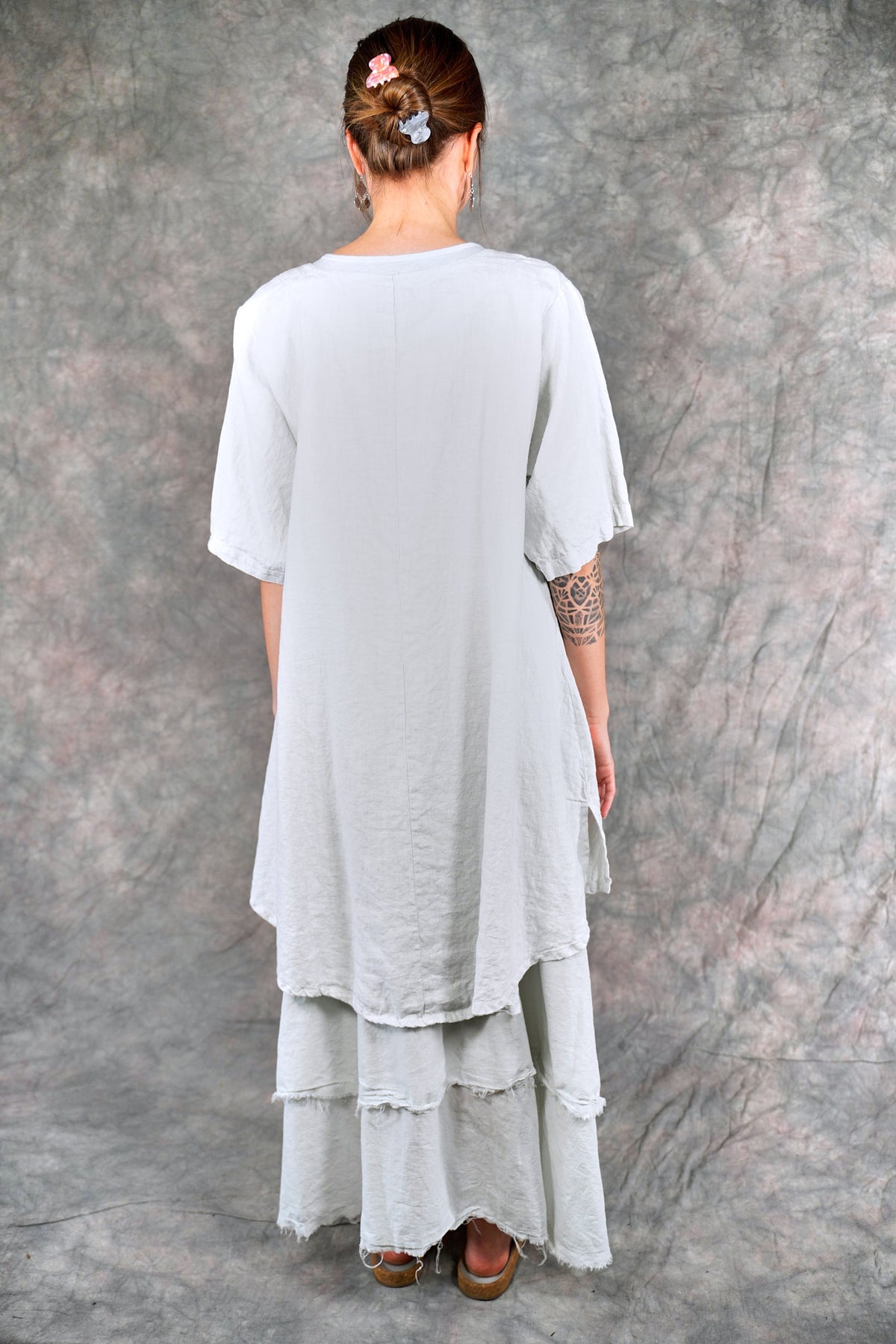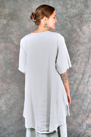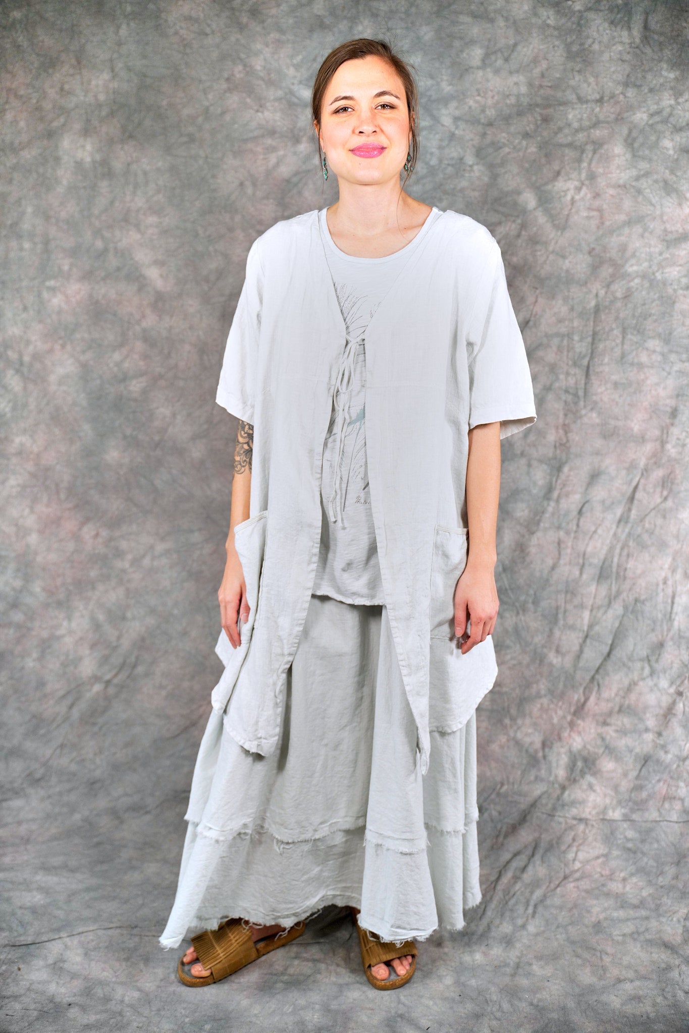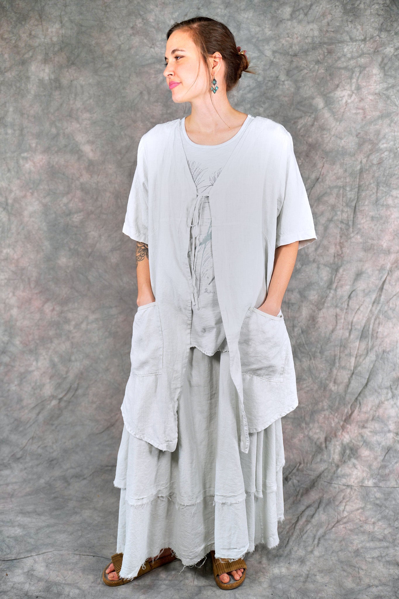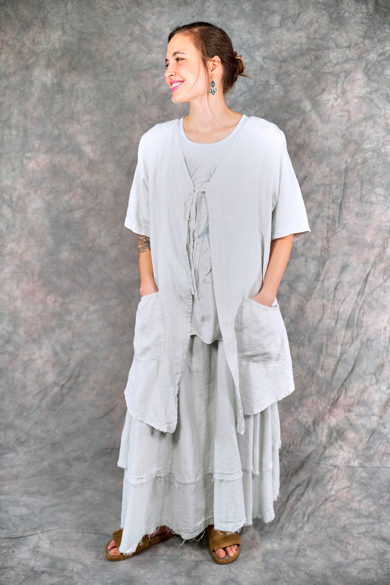 Soft 100% linen to wear open or optionally closed with a simple tie closure. Throw it on over  a #1210 tank top or dress. The pockets make it a perfect for travel or a walk in the park.