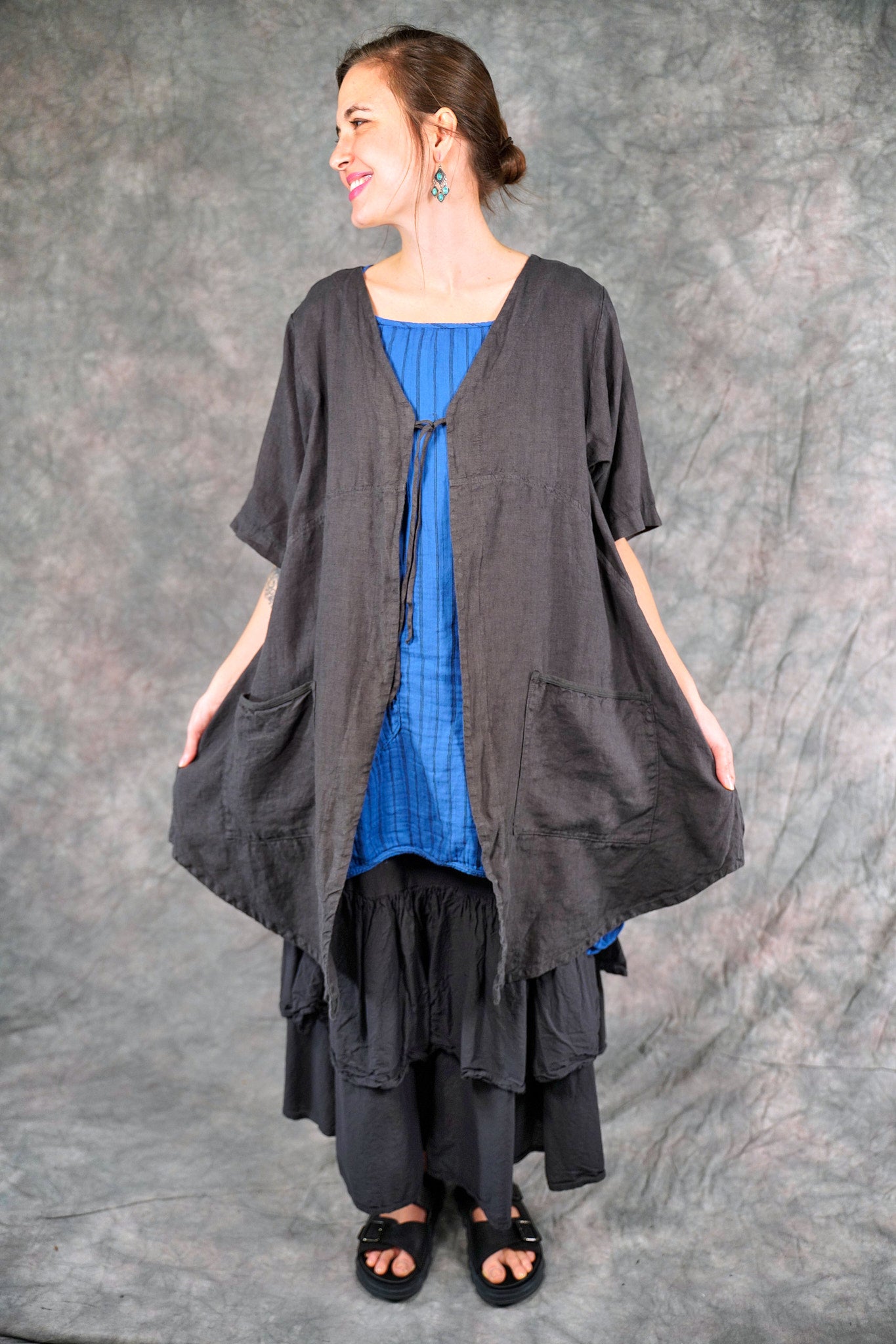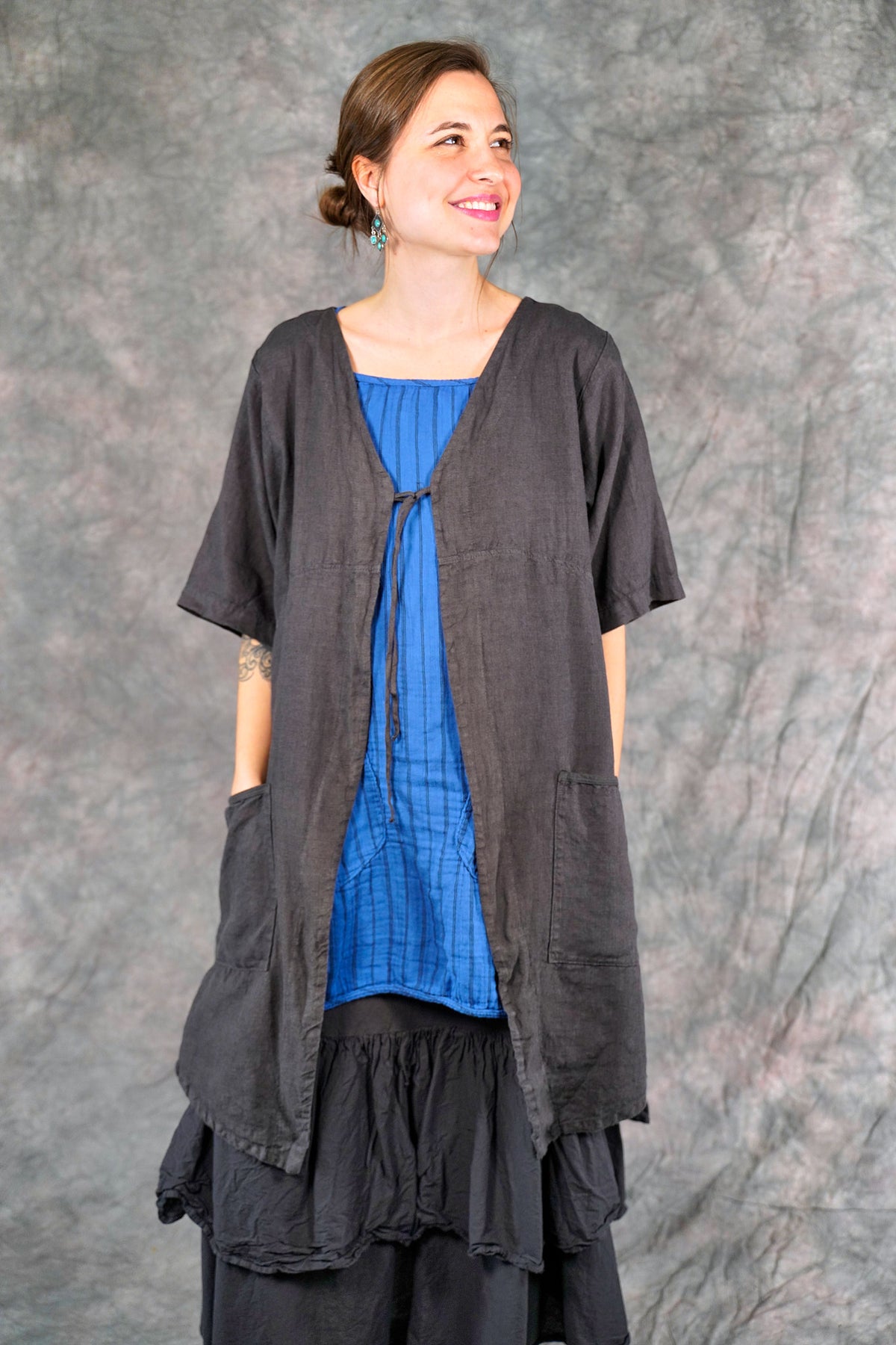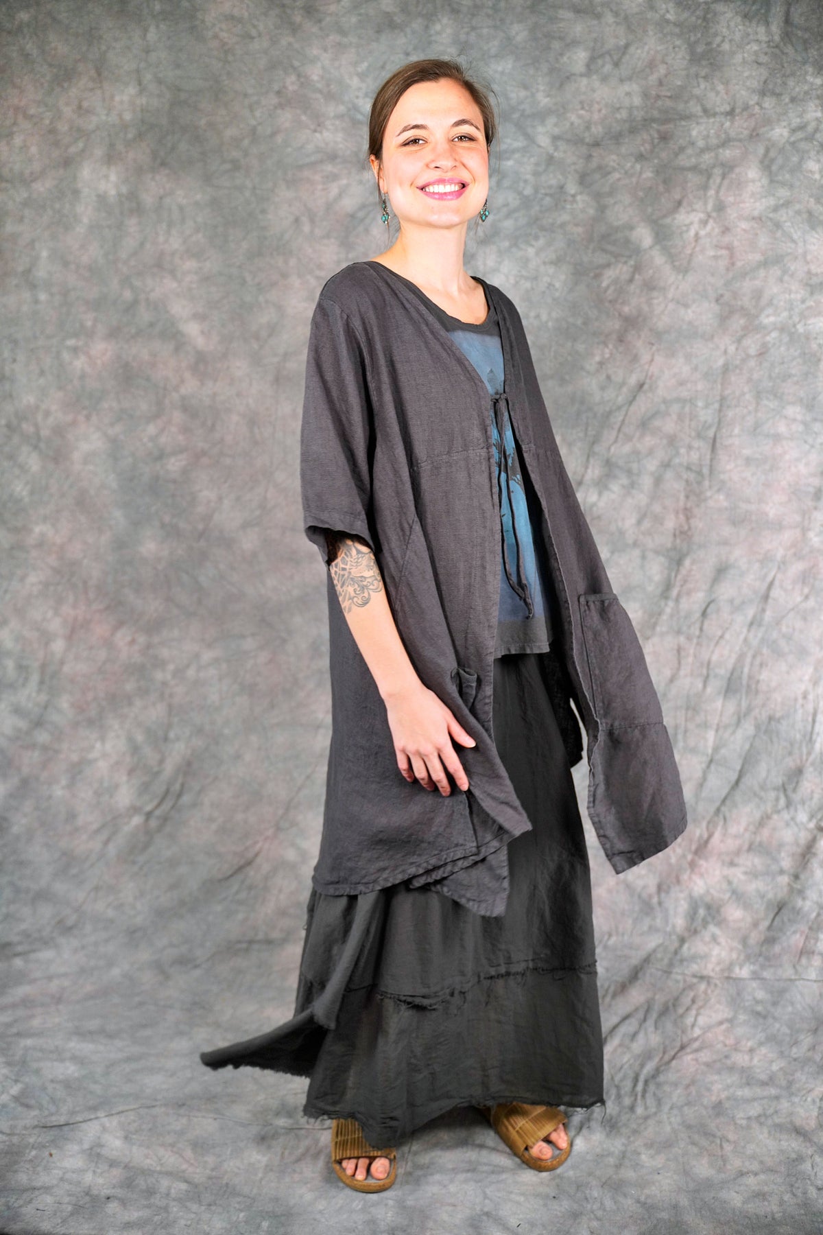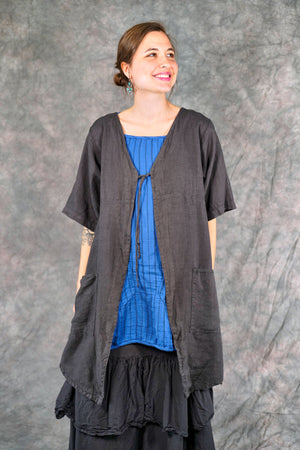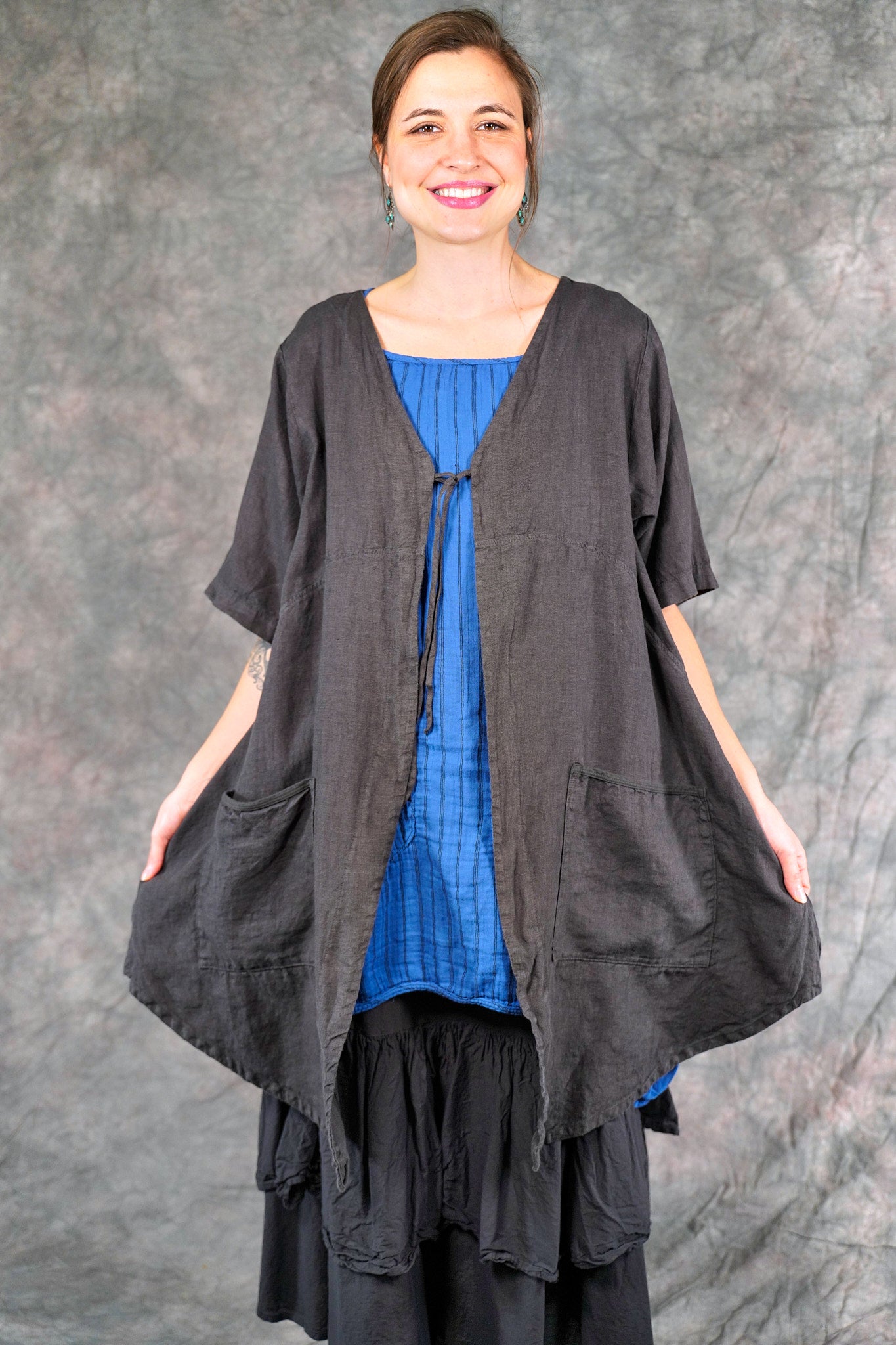 Soft 100% linen to wear open or optionally closed with a simple tie closure. Throw it on over a #1210 tank top or dress. The pockets make it a perfect for travel or a walk in the park.