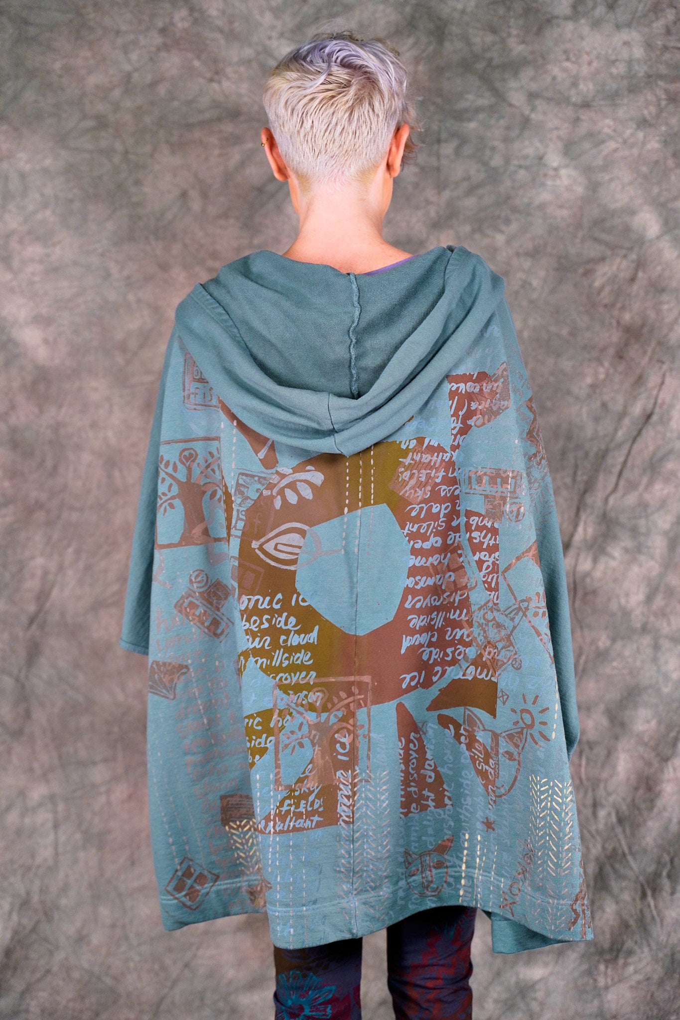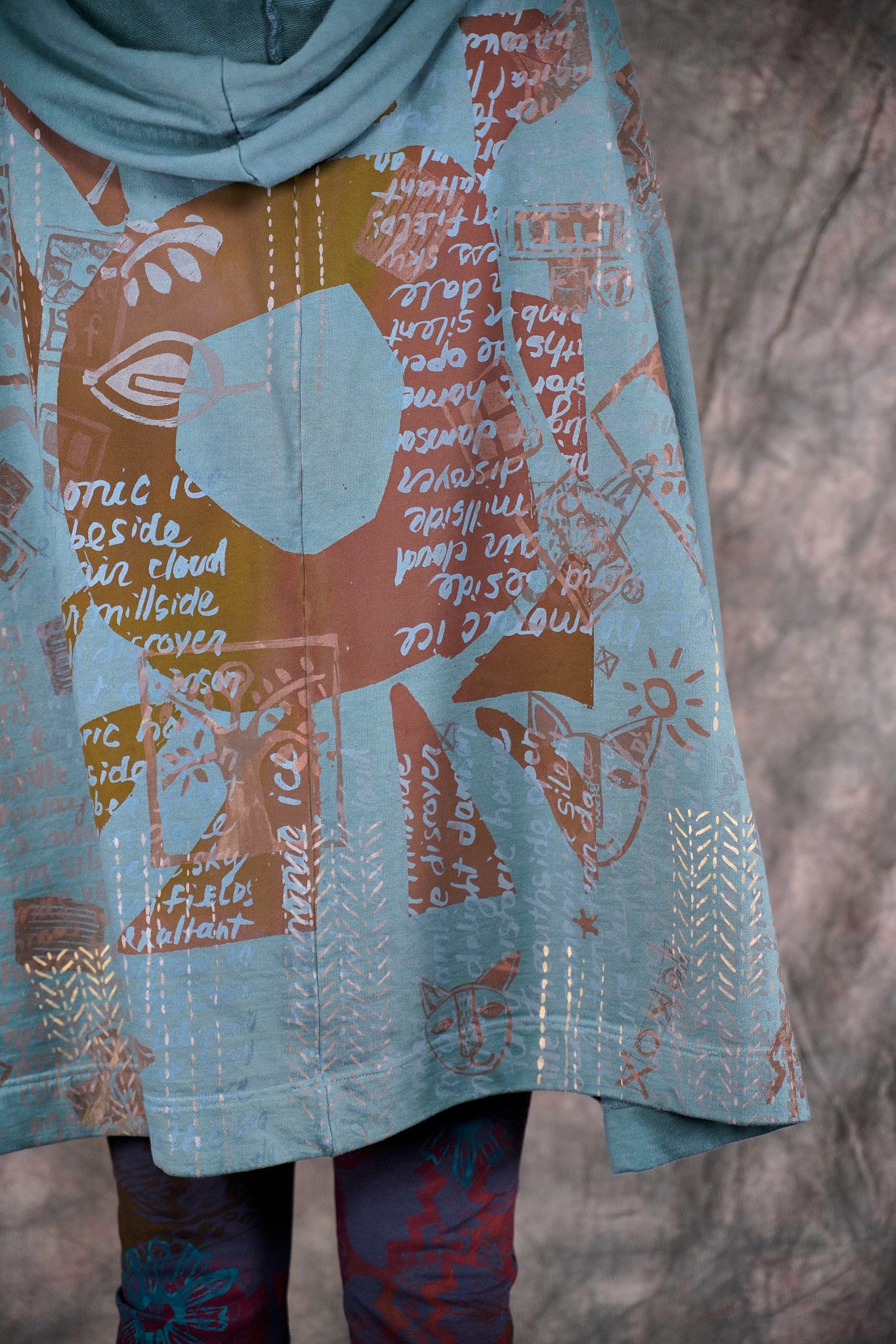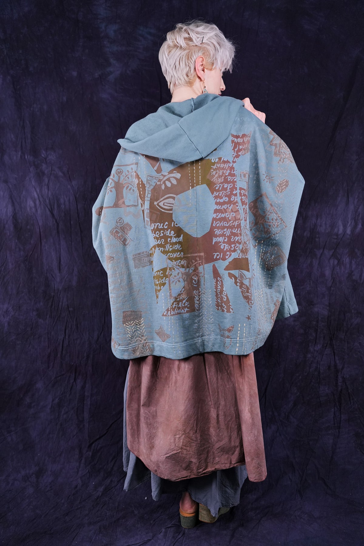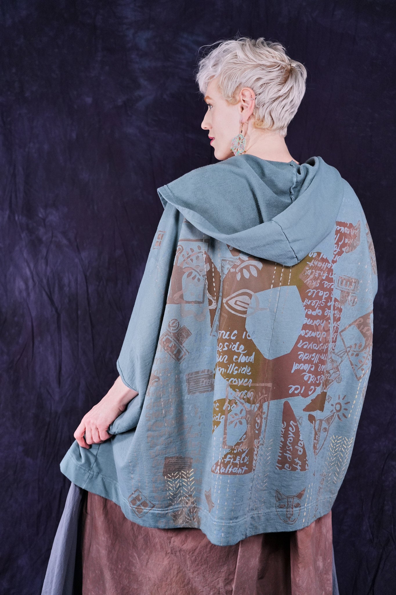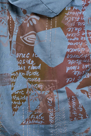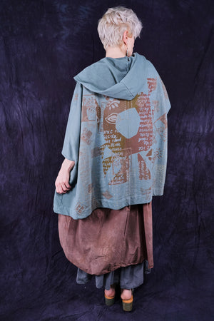look closely at this cool print- with hand-written descriptions of nature hand written by Jen and vintage Blue Fish block prints- a fun collector's item! With a hood, a zipper in front and pockets... this is an artful boxy square cut vest sweatshirt to layer over so many things! Especially nice with the color Sedona, or brown tones.
