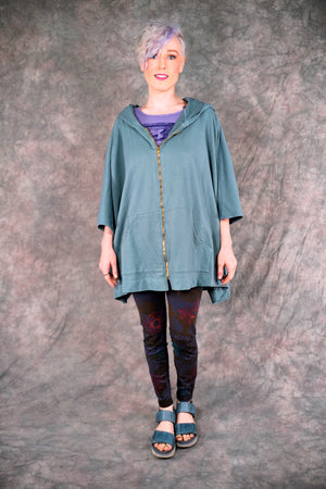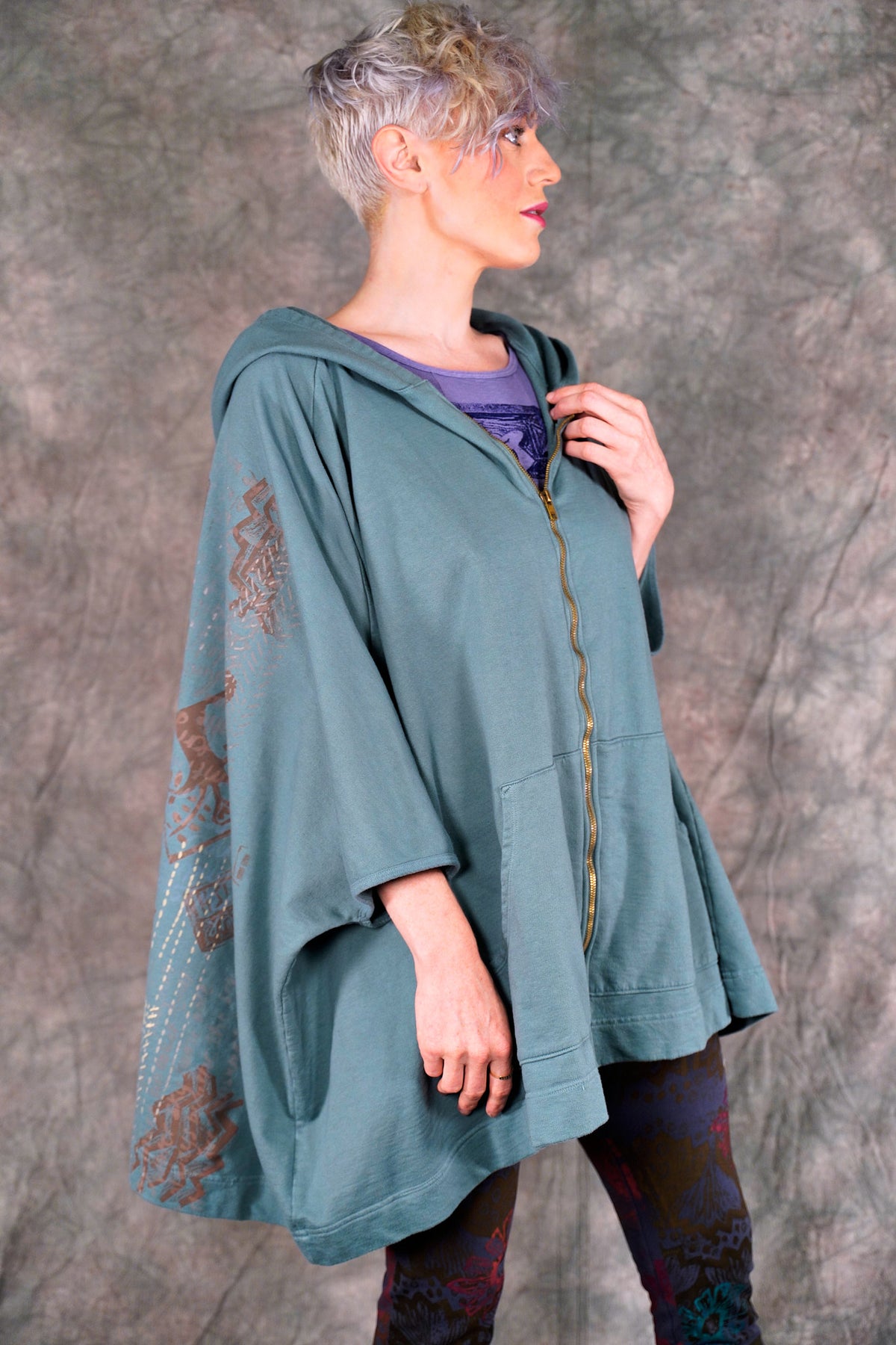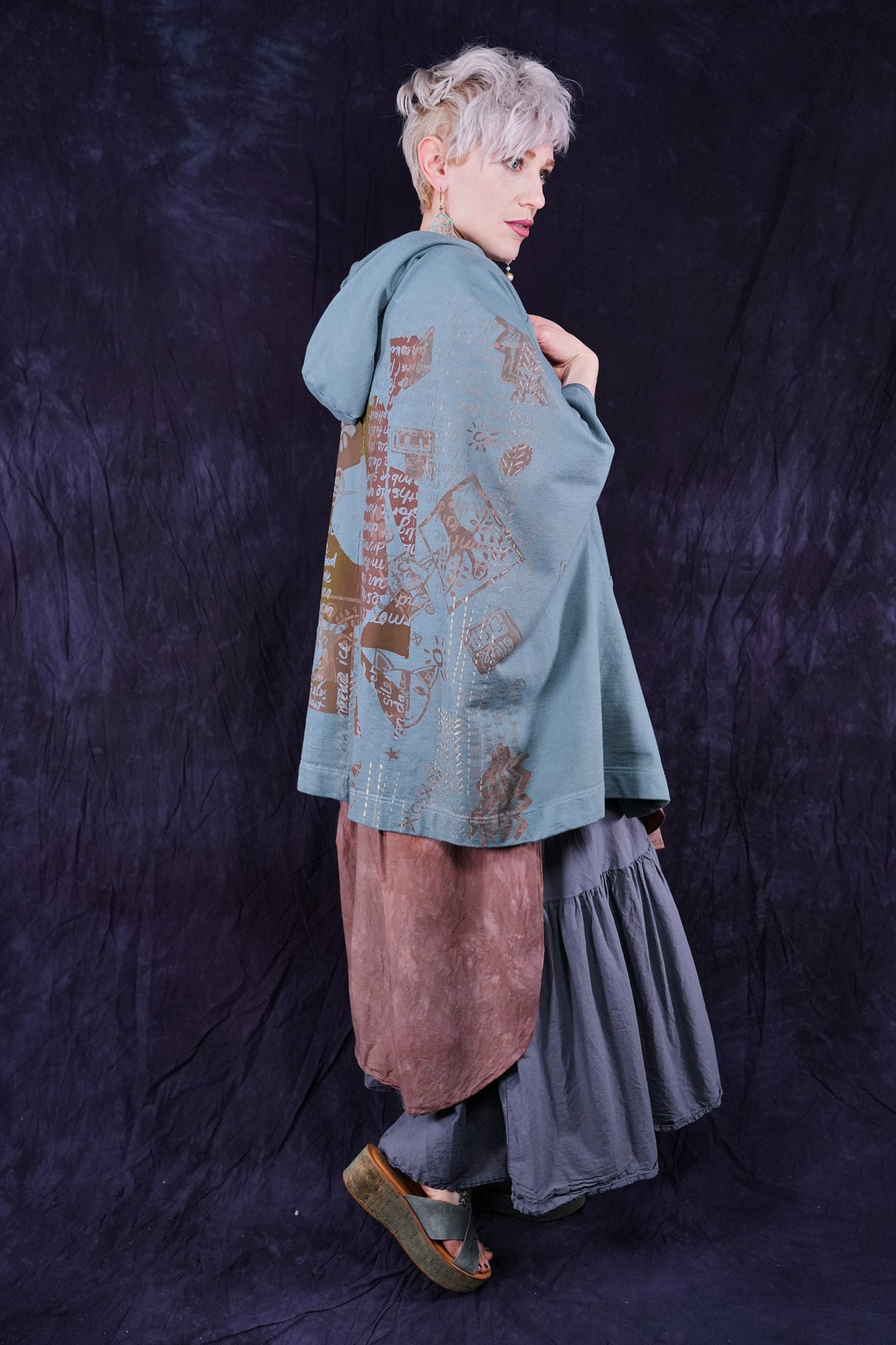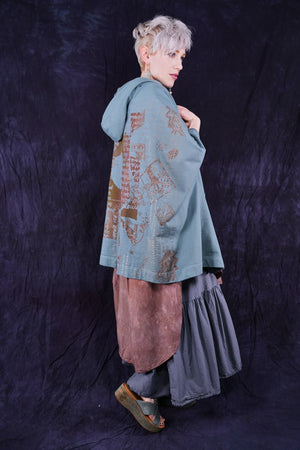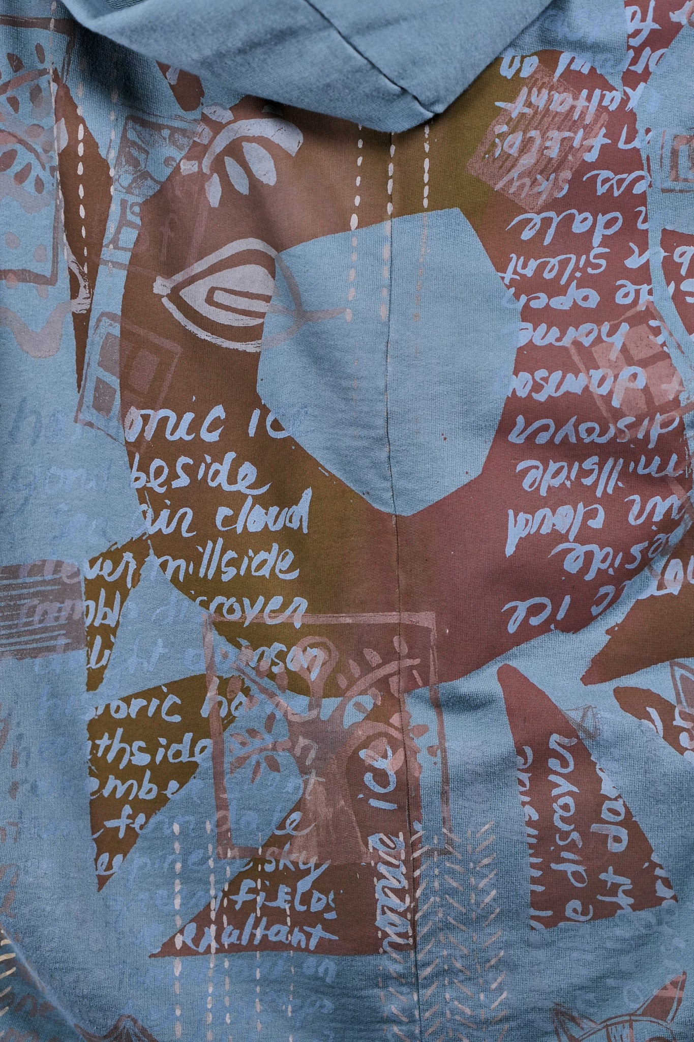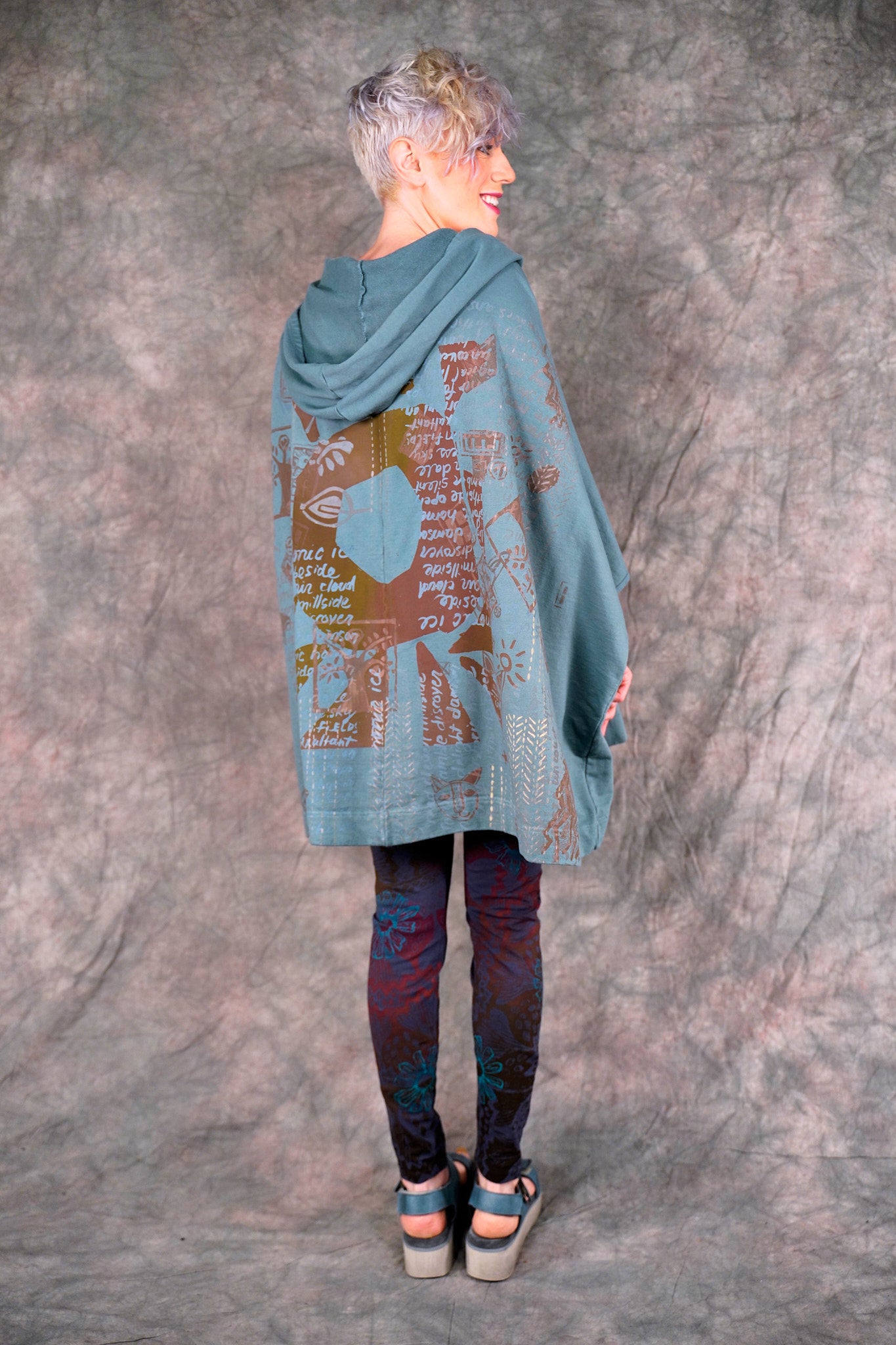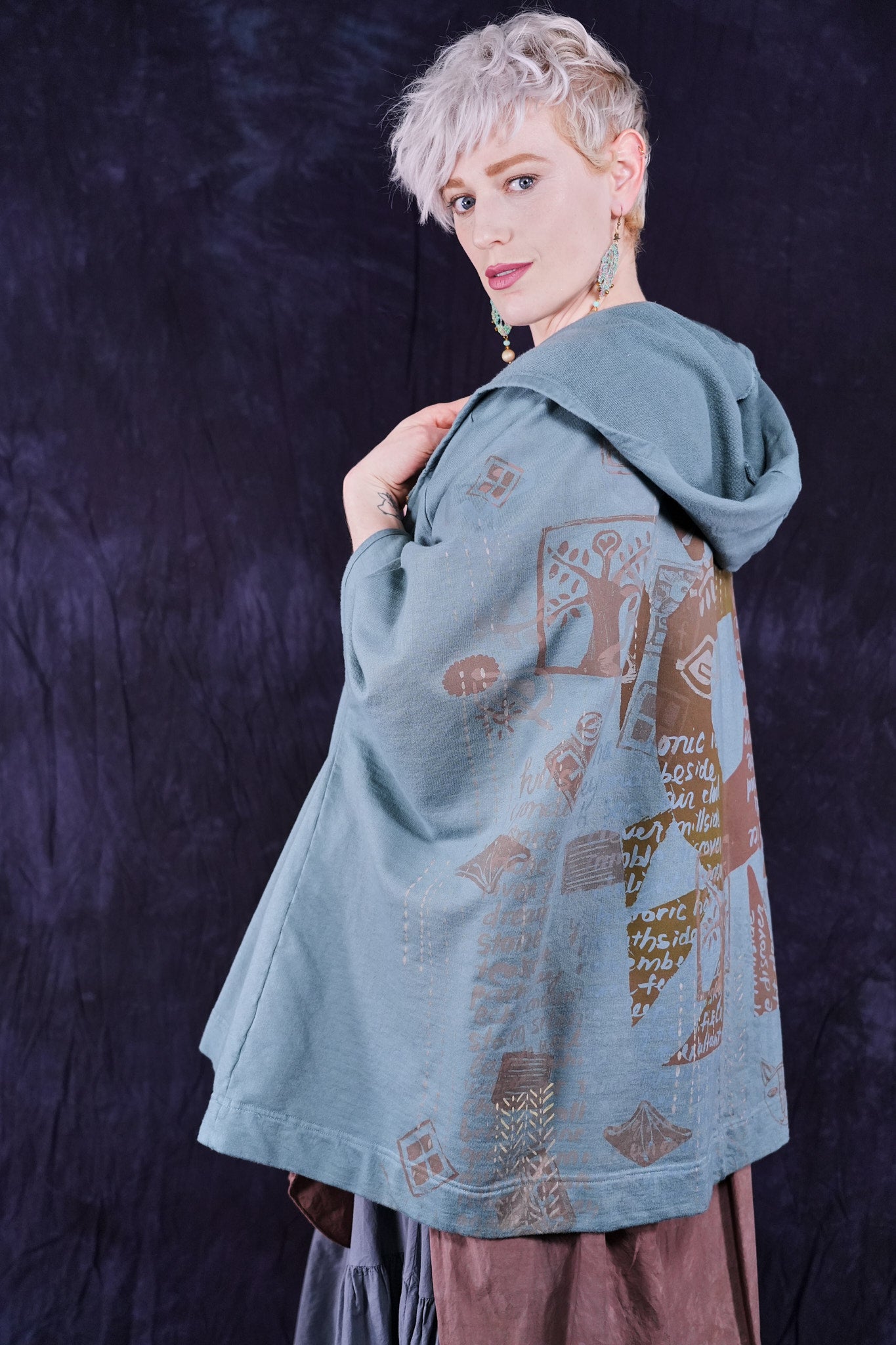 look closely at this cool print- with hand-written descriptions of nature hand written by Jen and vintage Blue Fish block prints- a fun collector's item! With a hood, a zipper in front and pockets... this is an artful boxy square cut vest sweatshirt to layer over so many things! Especially nice with the color Sedona, or brown tones.