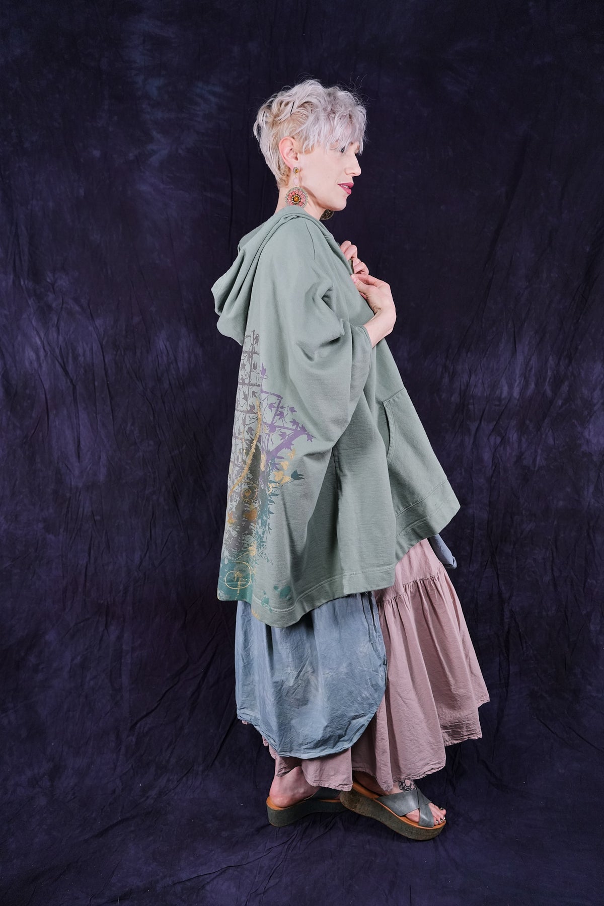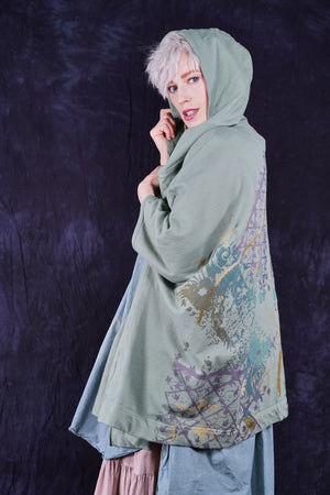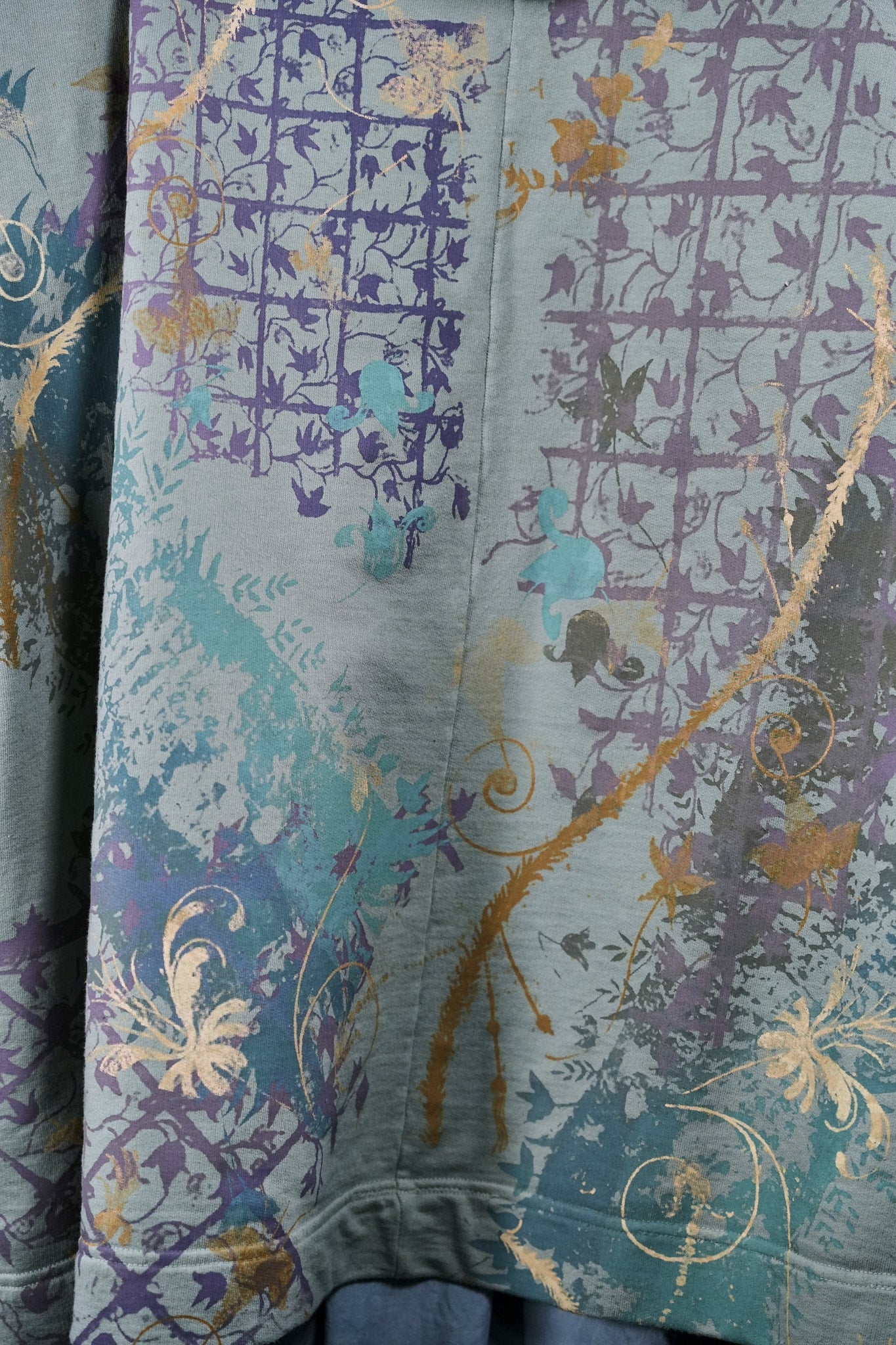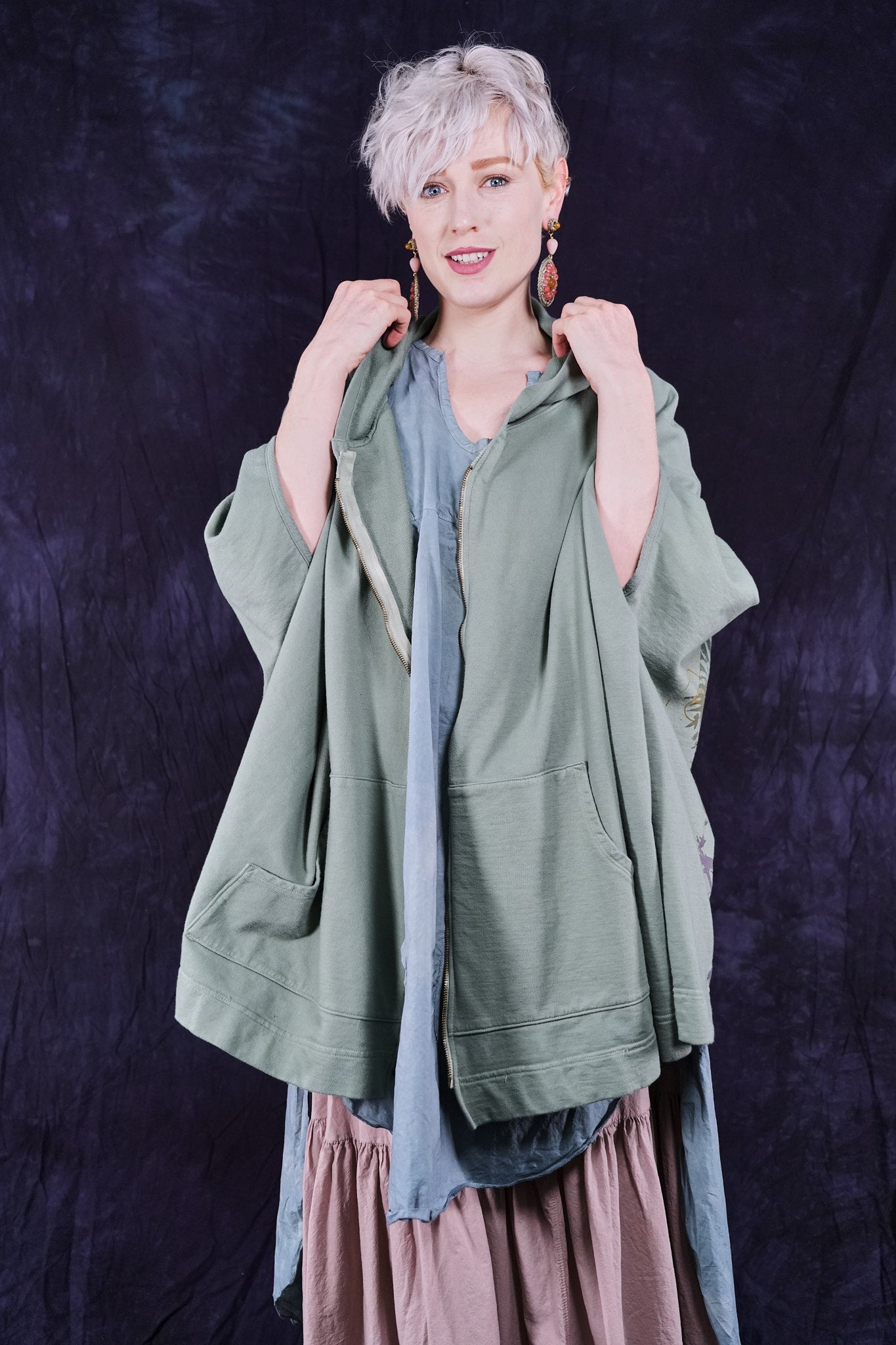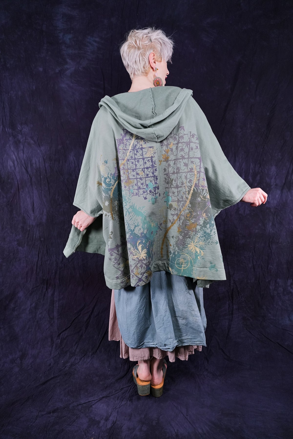 Superb hand printing all over the back of this wide square cut sweatshirt/ hoodie/ vest-with pockets and a front zipper... This piece has it ALL! LIMITED EDITION STYLE, don't miss it.