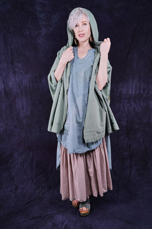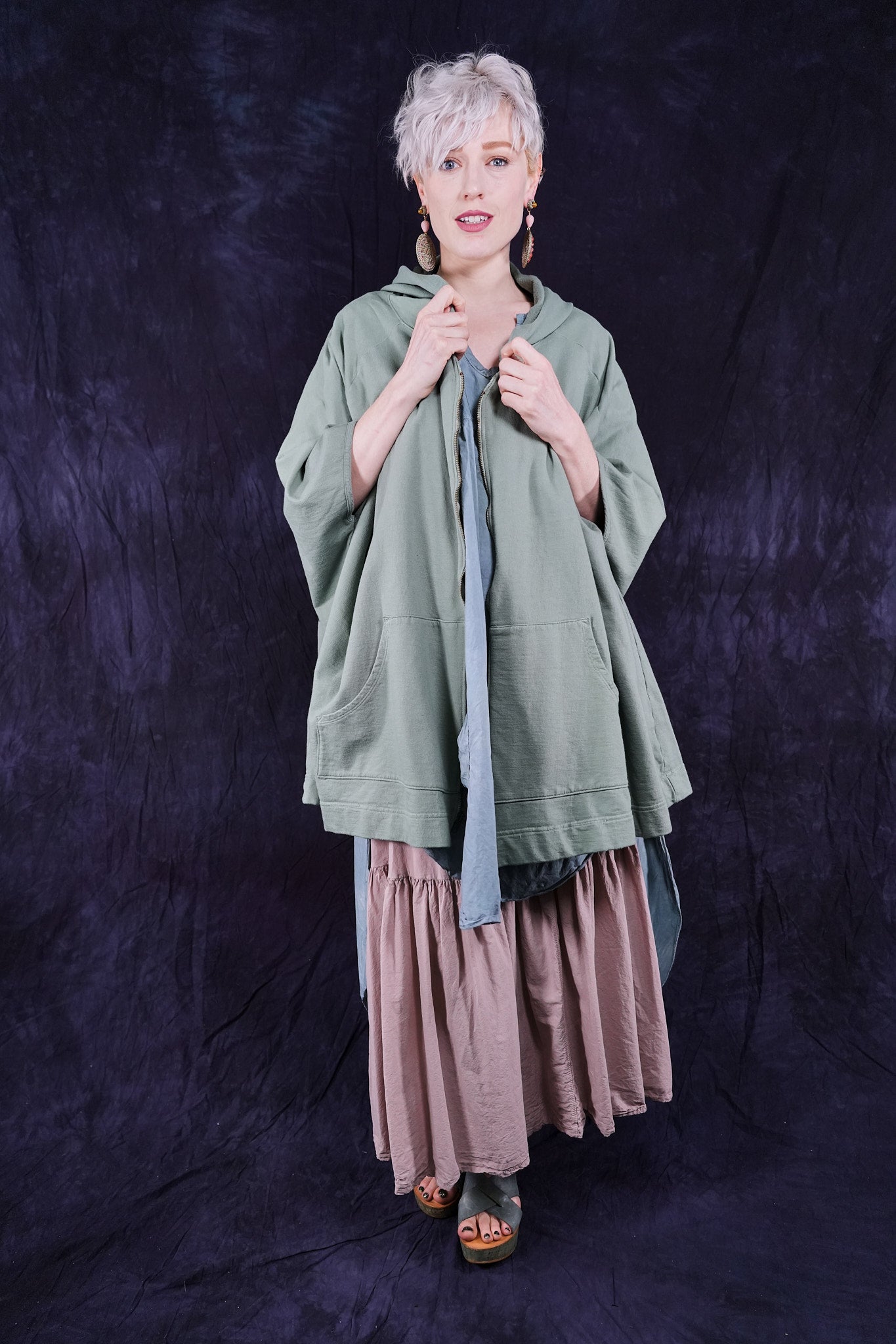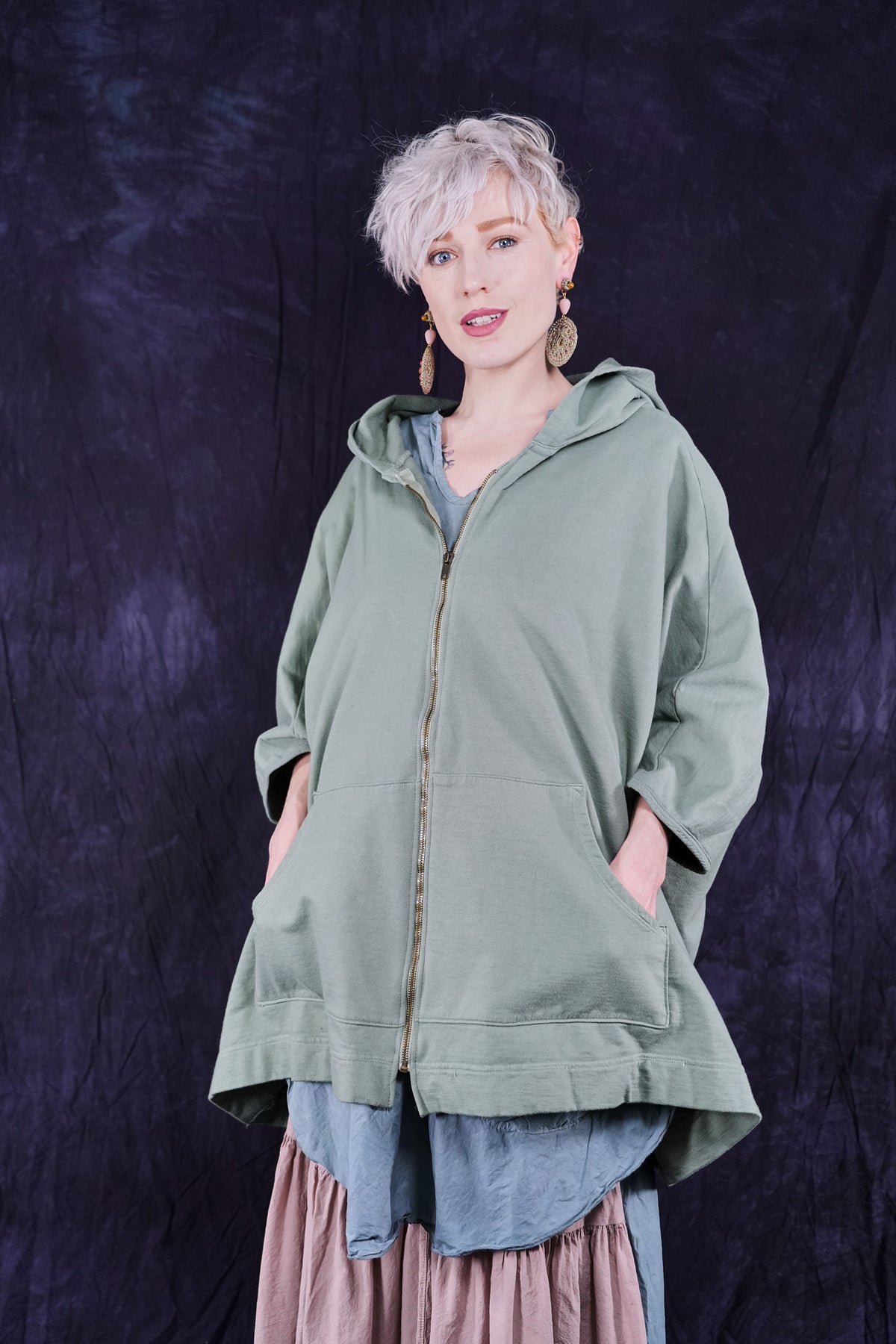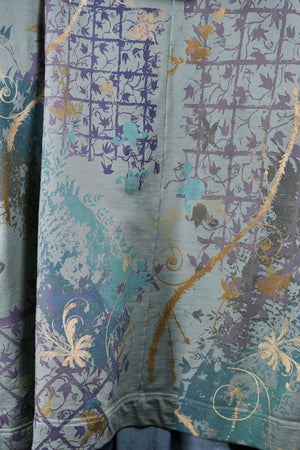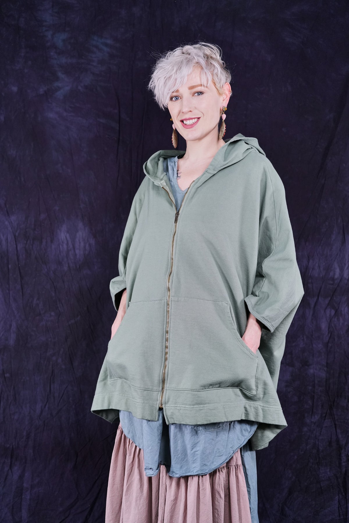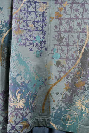 Superb hand printing all over the back of this wide square cut sweatshirt/ hoodie/ vest-with pockets and a front zipper... This piece has it ALL! LIMITED EDITION STYLE, don't miss it.