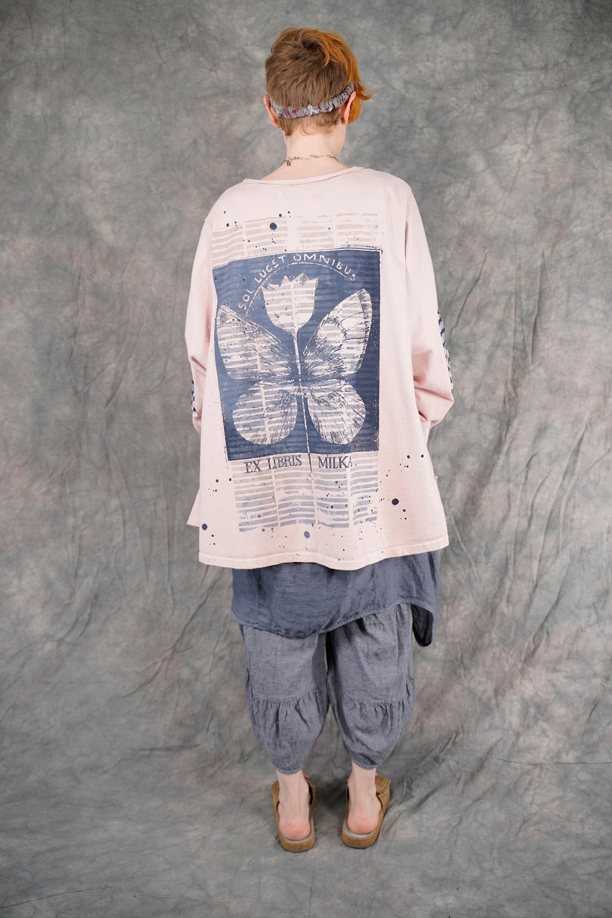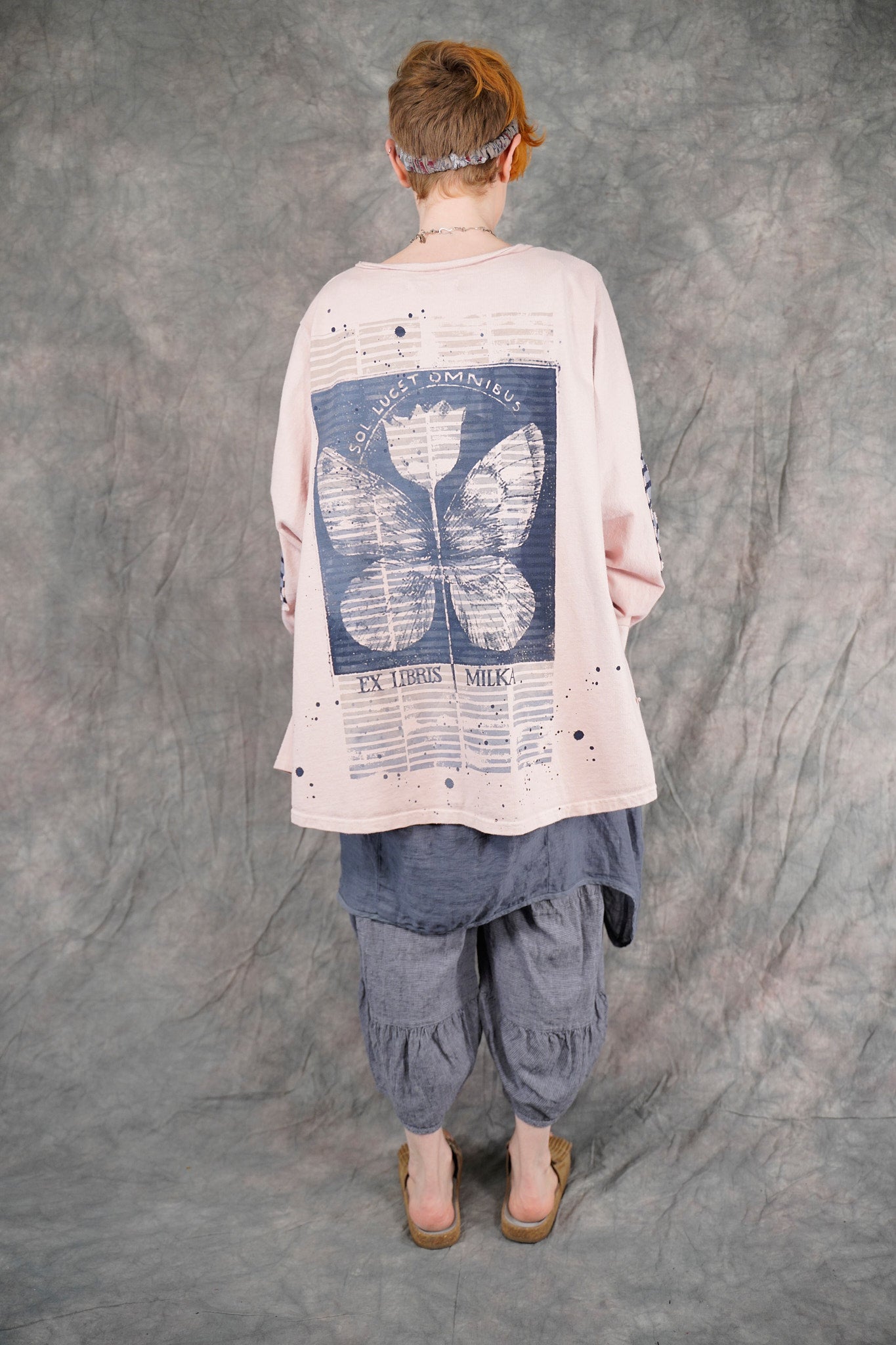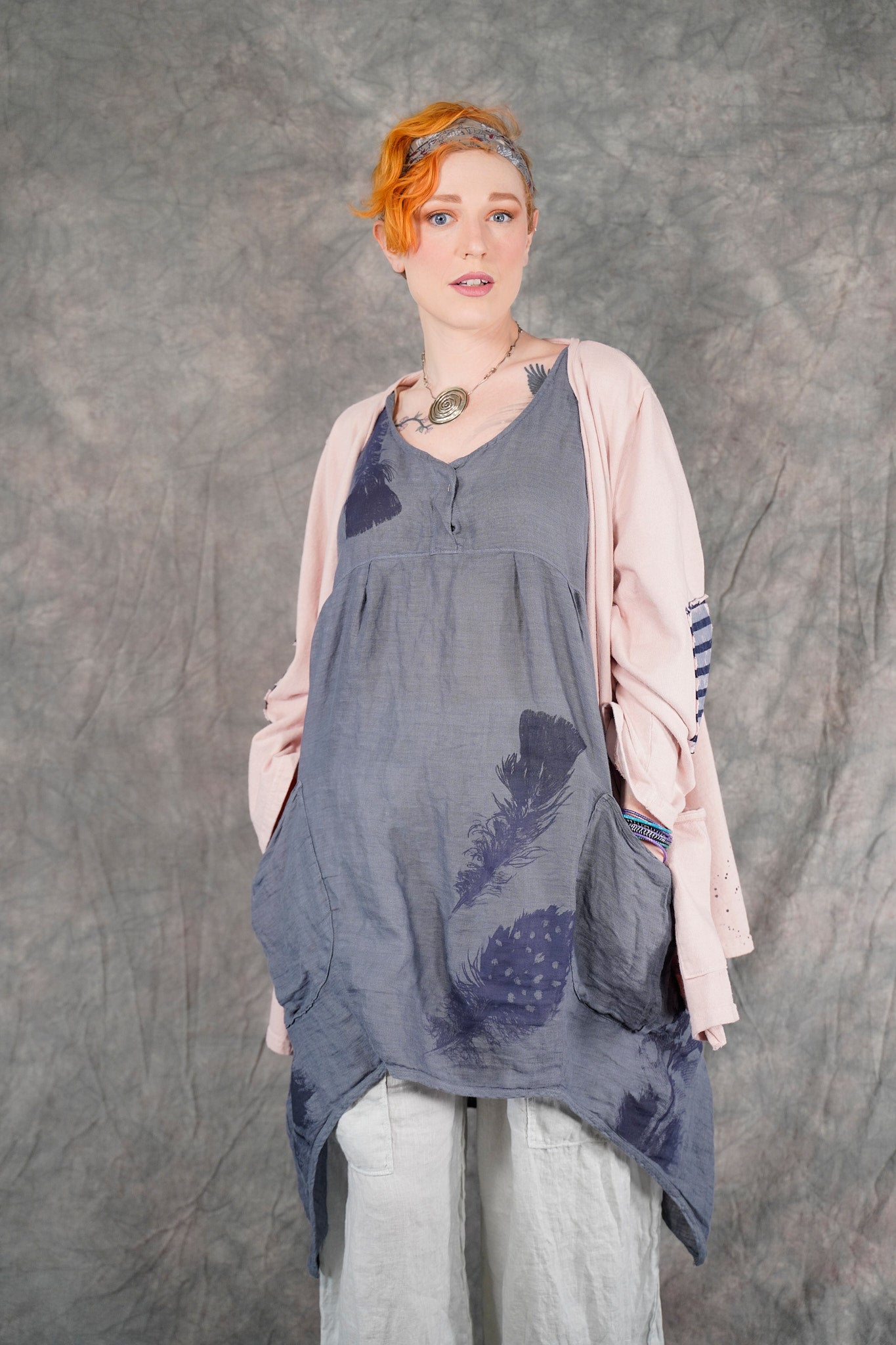 Hand printed back, patched at elbow and with a hand printed blue fish patch appliqued at front too! Great shape. Heavier reprocessed cotton perfect for springtime. Pockets, patches and prints give this soft organic reprocessed cotton cardigan. It's the perfect spring layer to take with you or cozy up in at home.