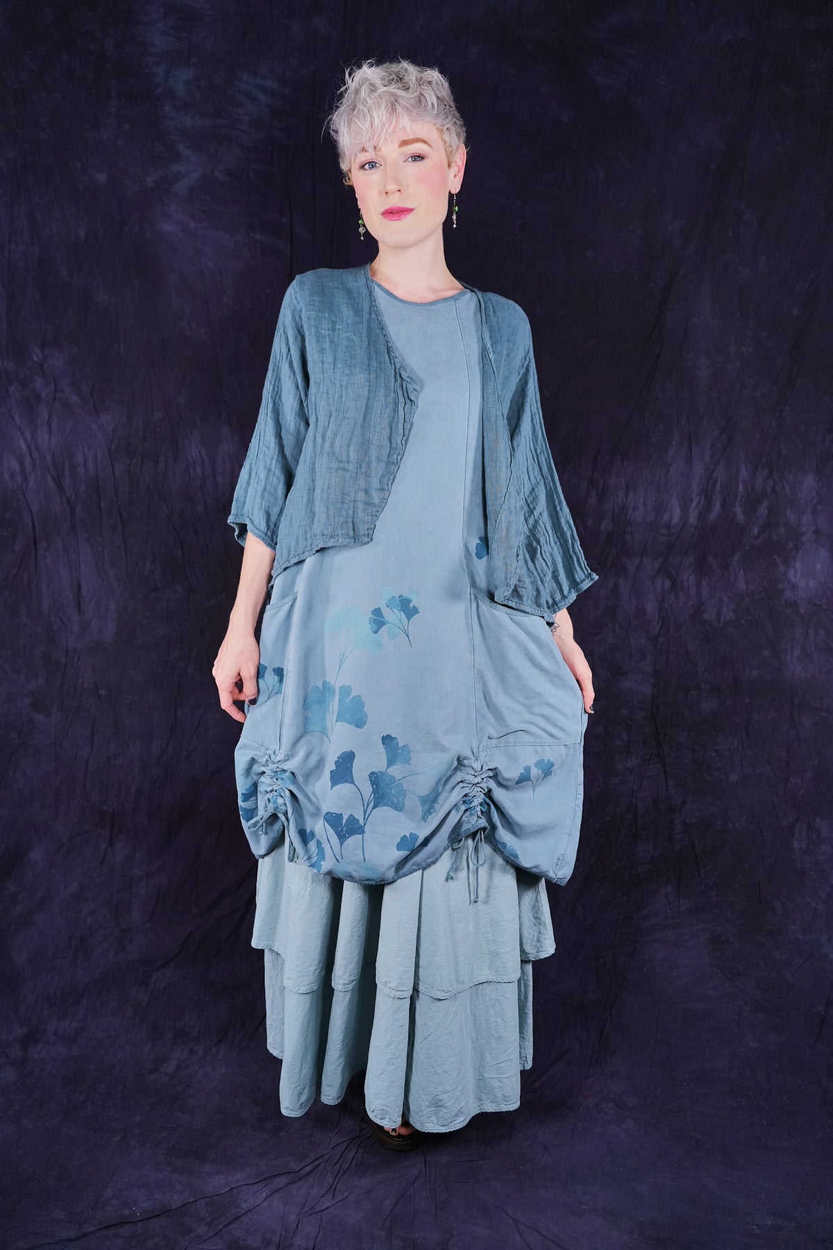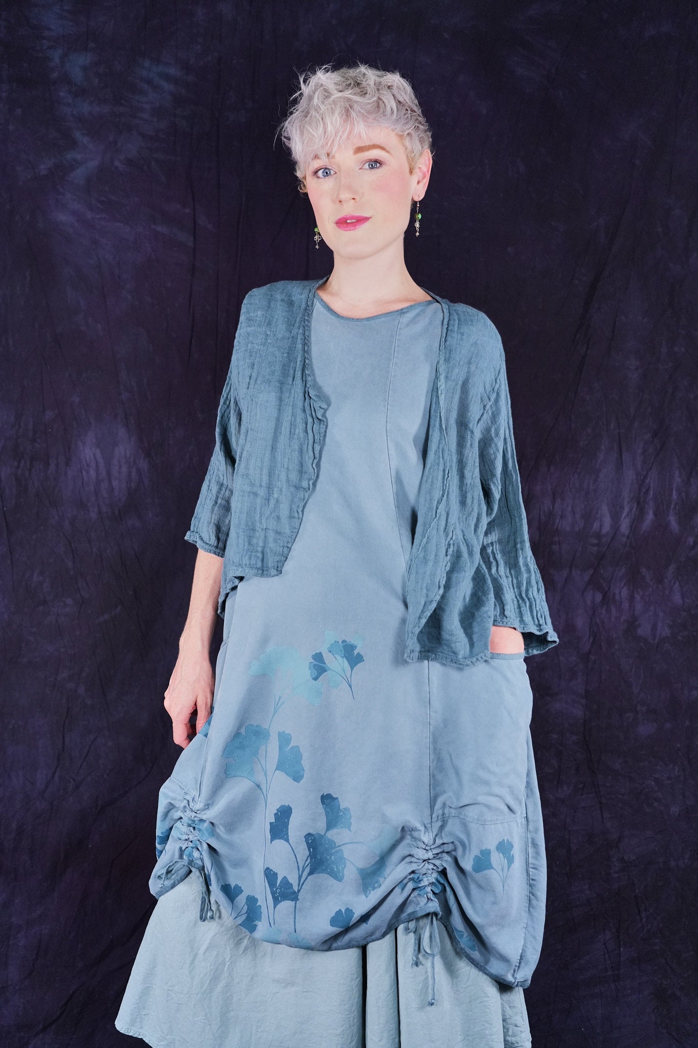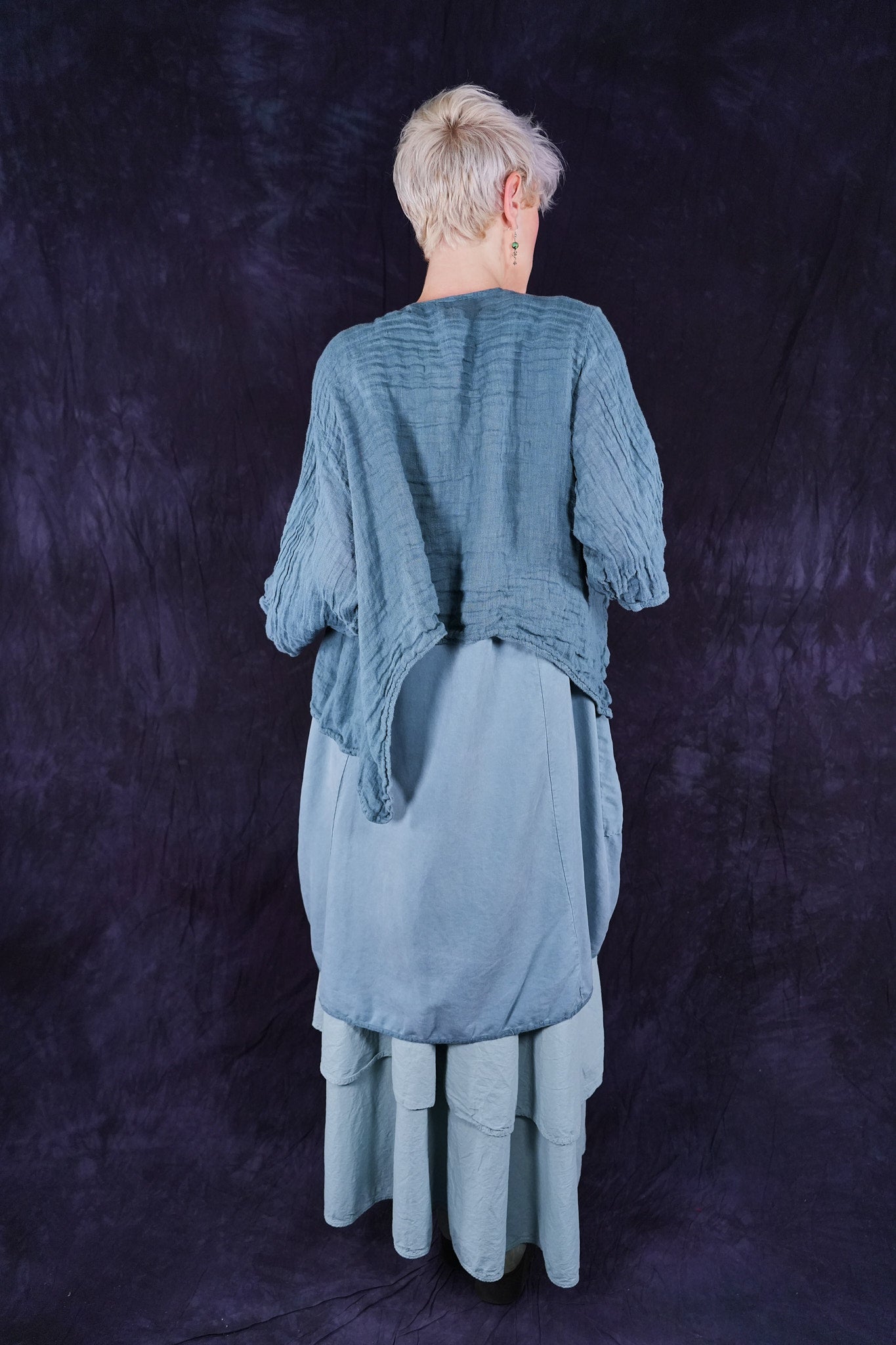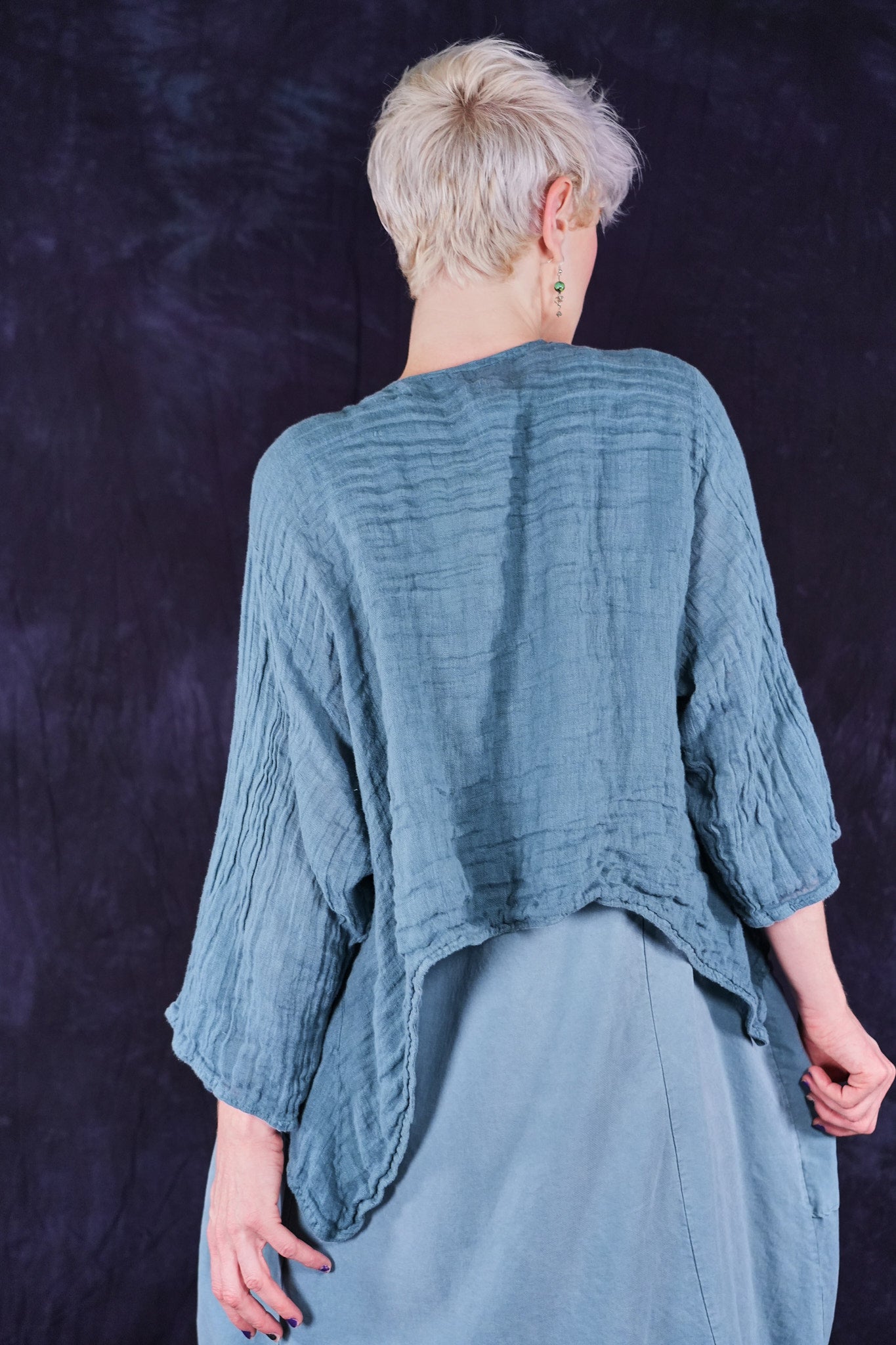 The best summer layer for those times when you just need a bit of warmth to keep out the chill. Its made to wrinkle and travel. Roll it up and carry it with you where-ever you may go! Layer over tops and sleeveless styles such as our beautiful #6228 Joyous Jumper in Sea. You won't want to leave home without it!