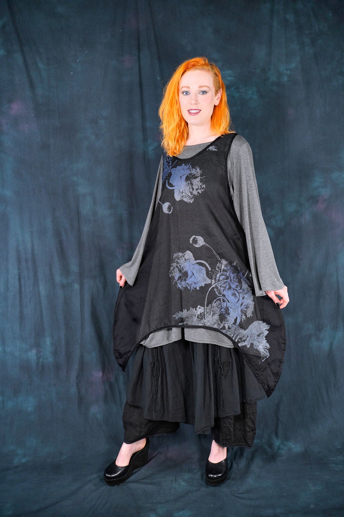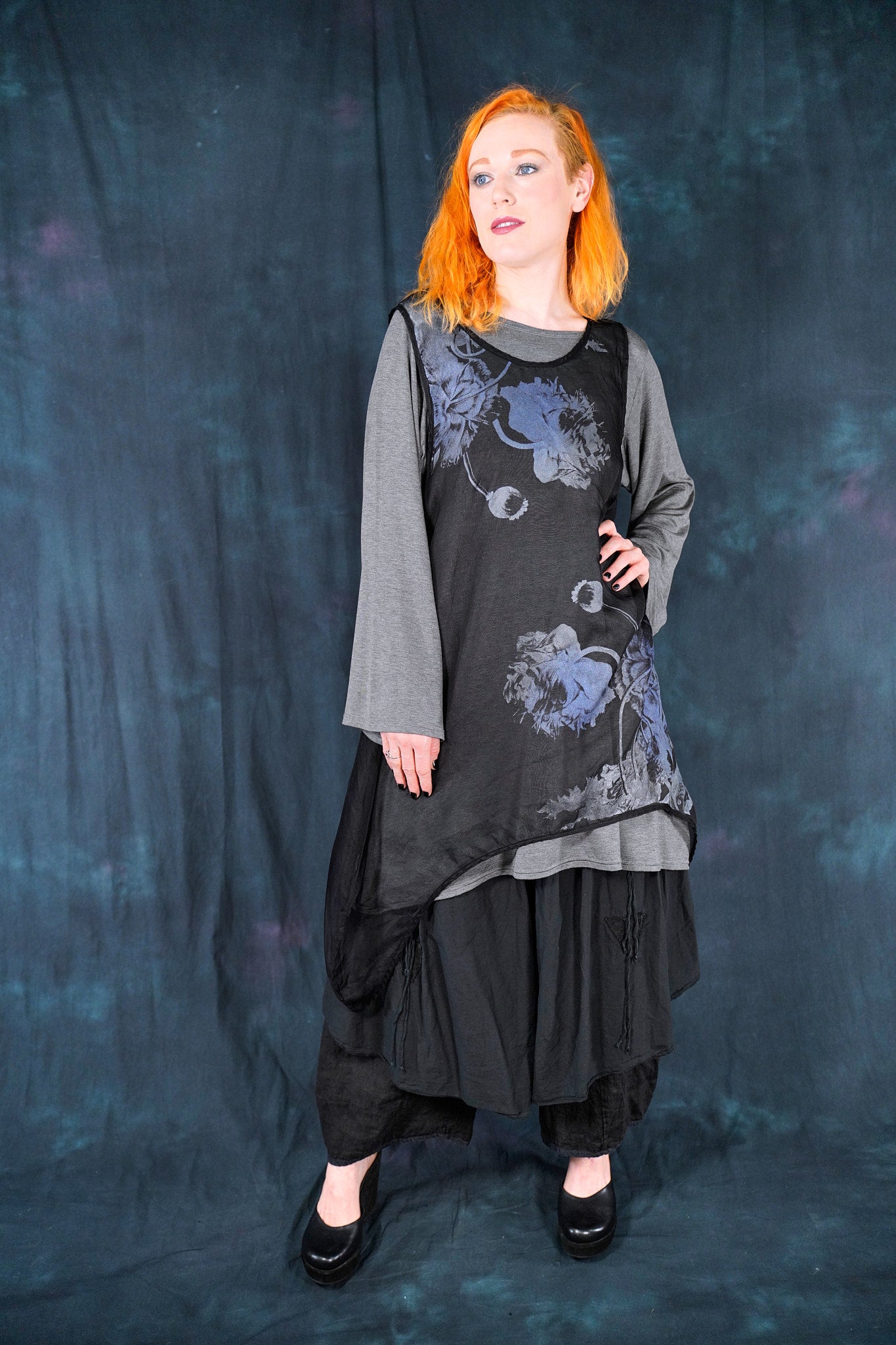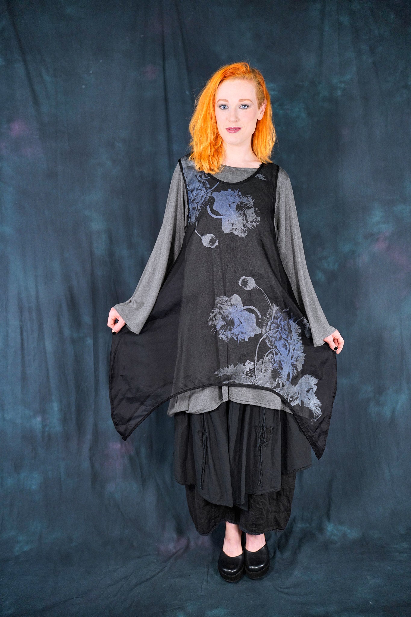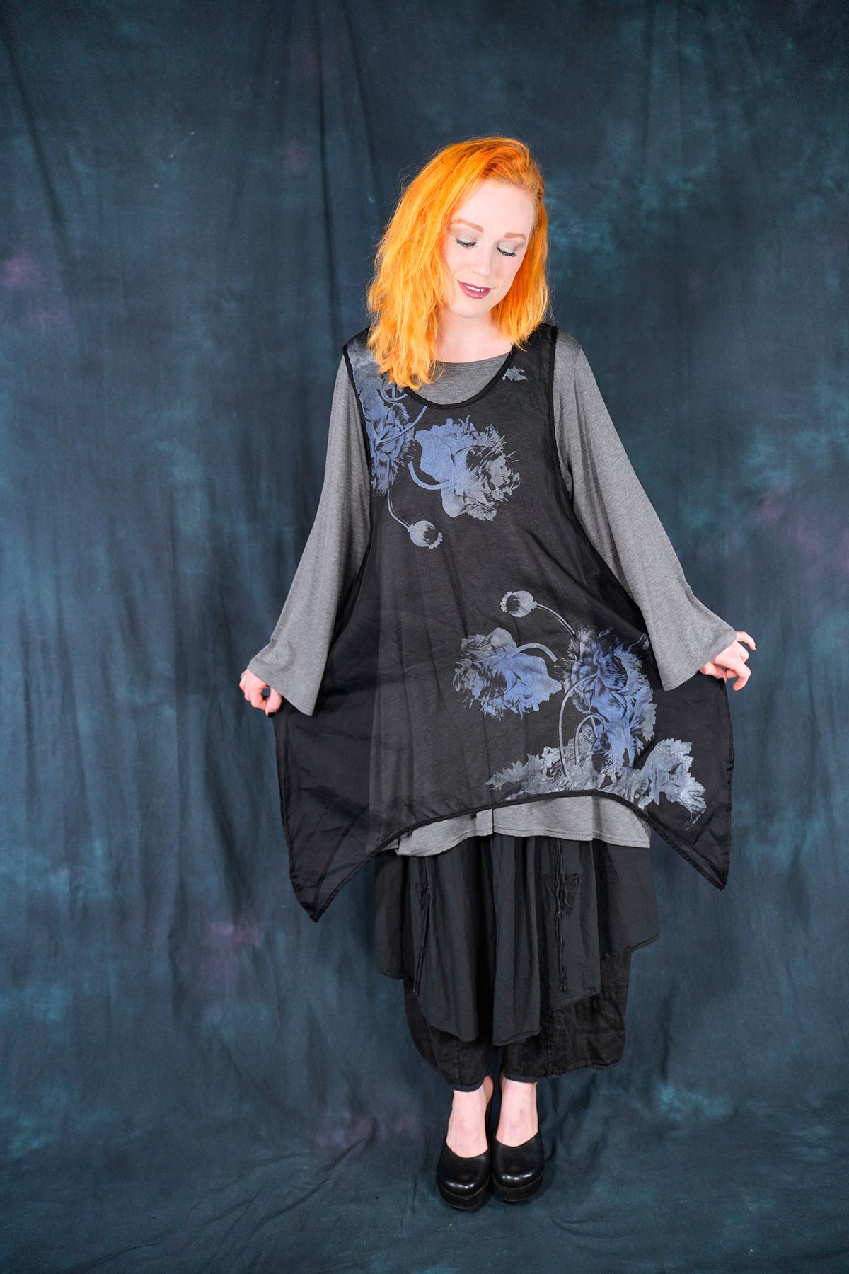 Layer this over black wide pants ( try our Klee pant or our Wide Petaloons ) and a black layer top...or any other deep earthy color that picks up the tones in the hand printing. This organza shift adds a sheer layer of elegance to a simple basic outfit, and allows you to walk into any event with confidence. Shown over #1574 rayon lycra flared sleeve tunic in black ( also in grey).