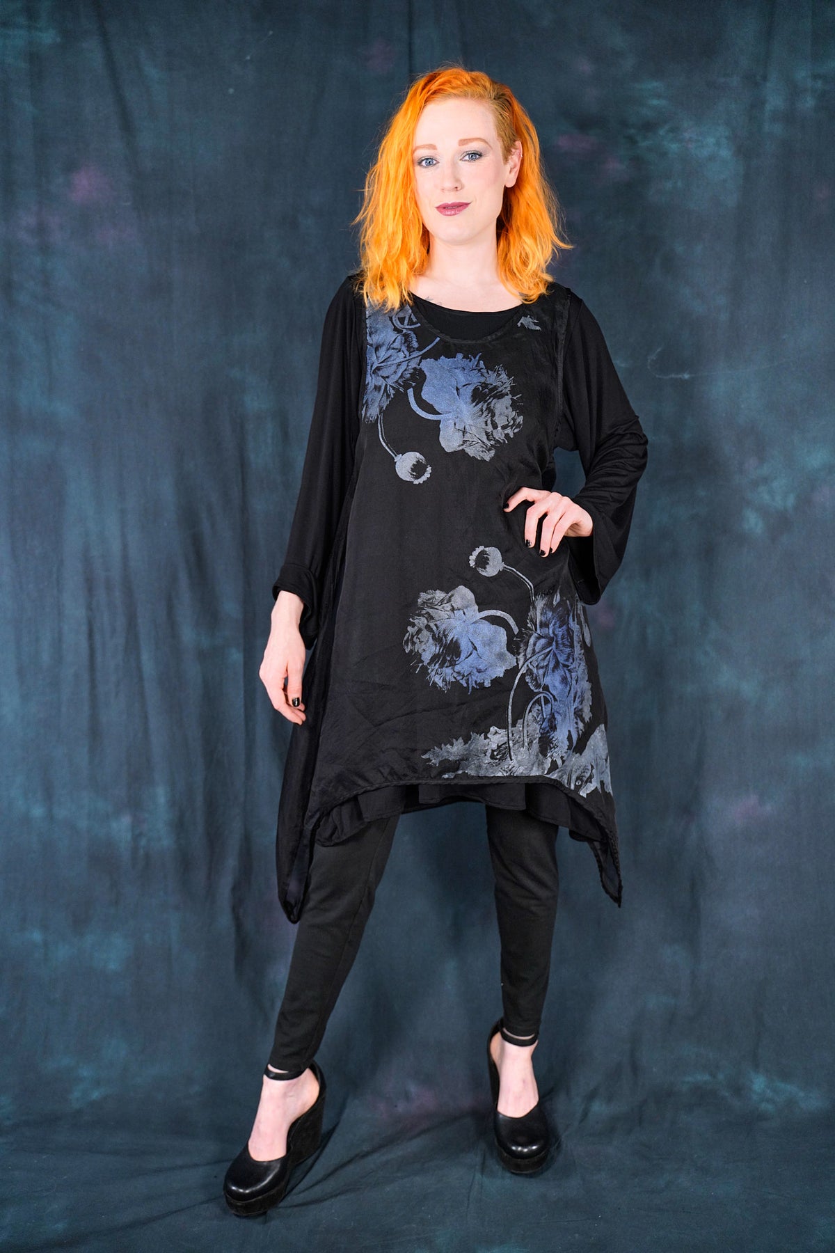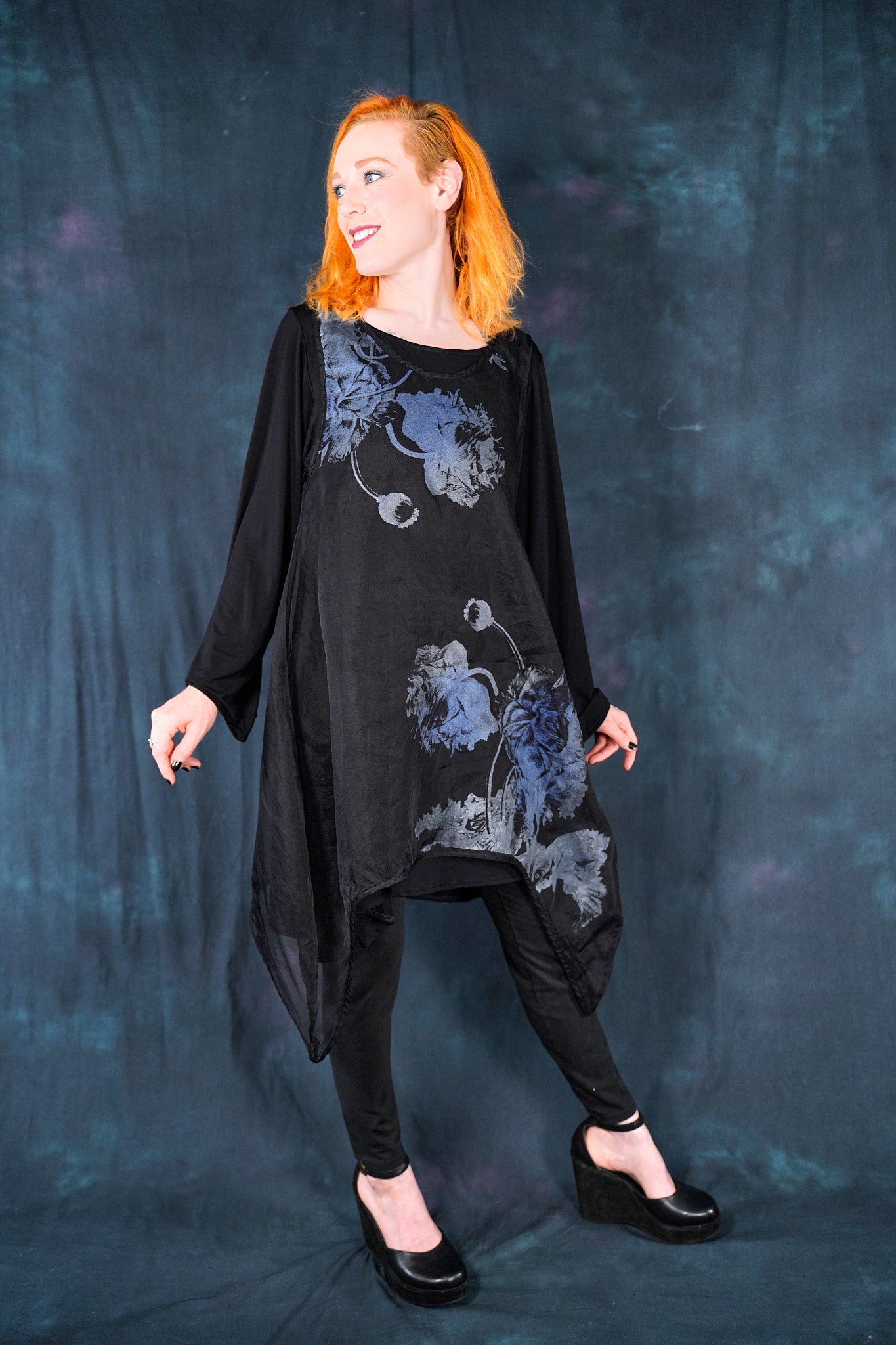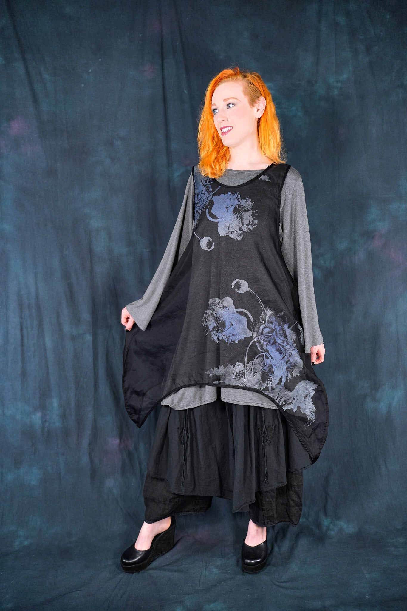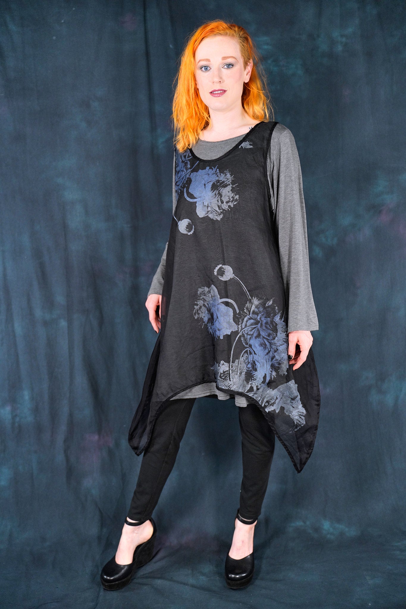 Layer this over black wide pants ( try our Klee pant or our Wide Petaloons ) and a black layer top...or any other deep earthy color that picks up the tones in the hand printing. This organza shift adds a sheer layer of elegance to a simple basic outfit, and allows you to walk into any event with confidence. Shown over #1574 rayon lycra flared sleeve tunic in black ( also in grey).