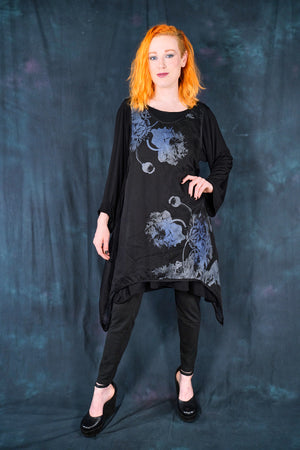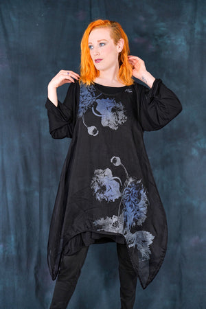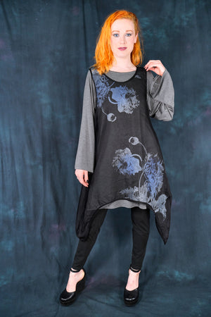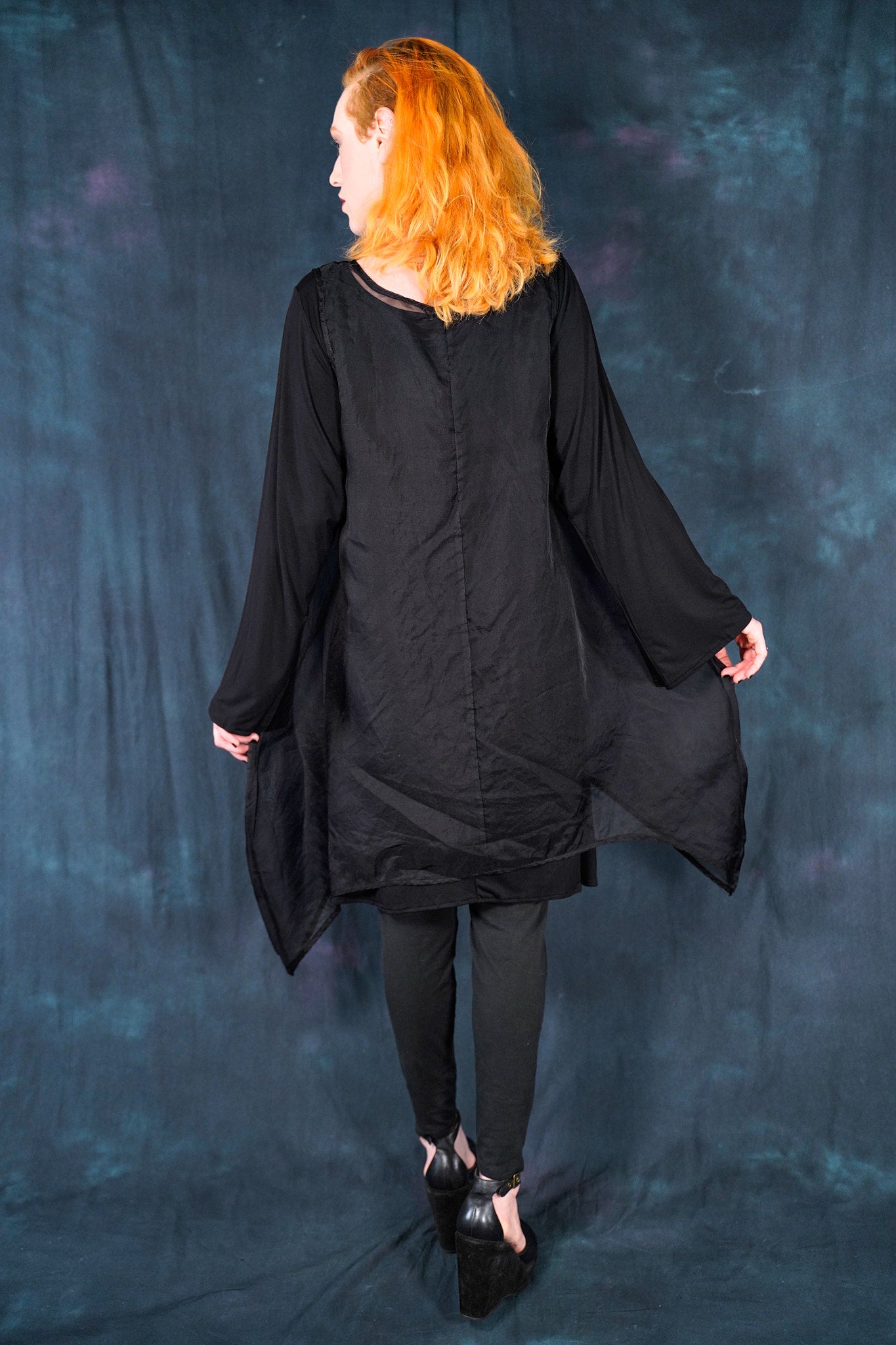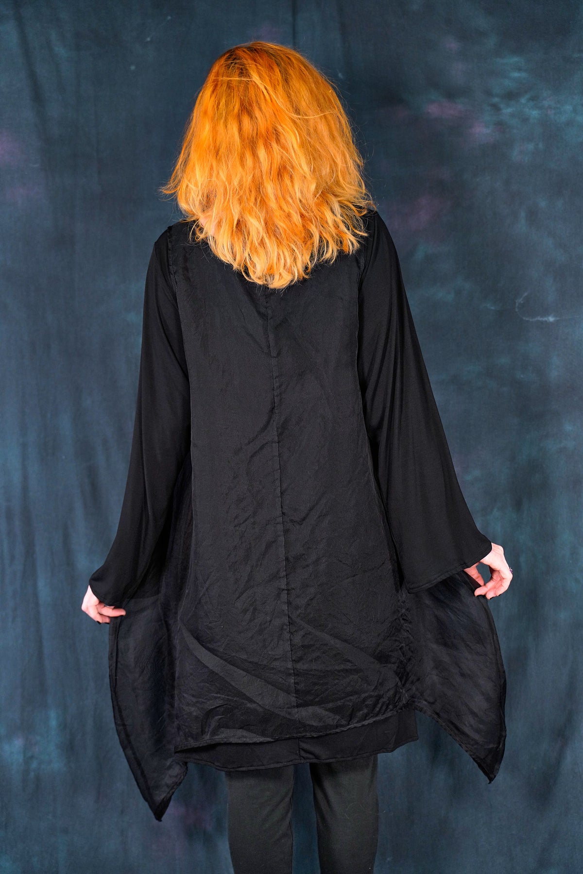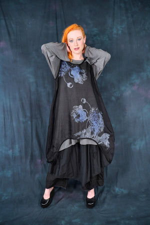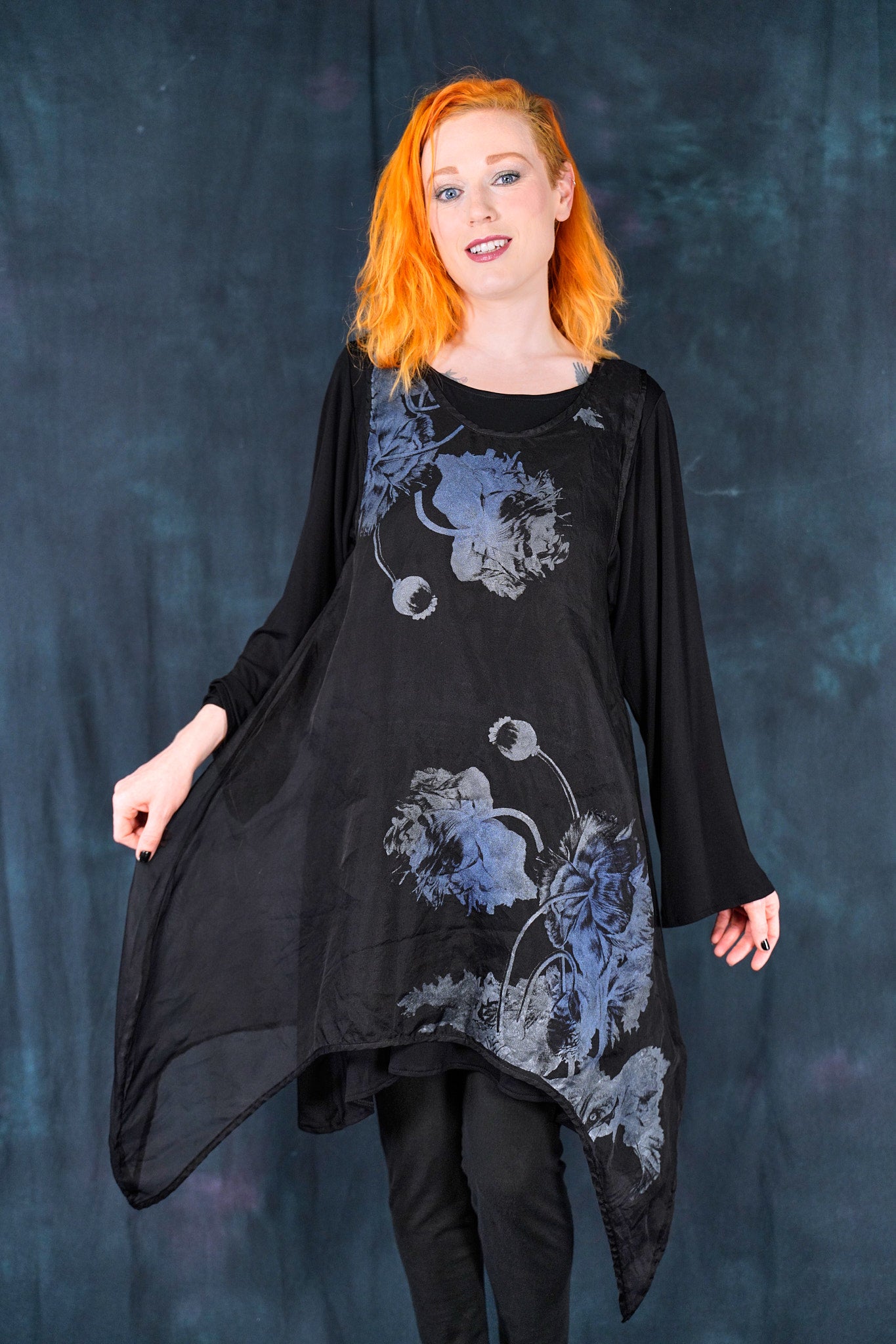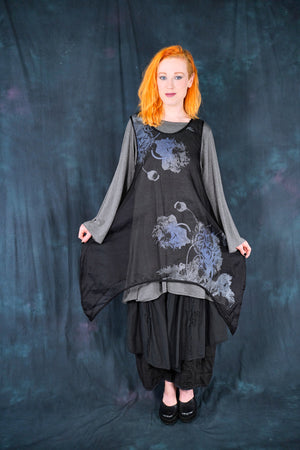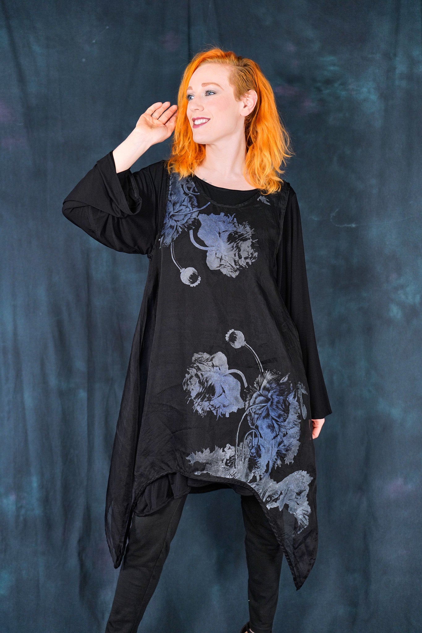 Layer this over black wide pants ( try our Klee pant or our Wide Petaloons ) and a black layer top...or any other deep earthy color that picks up the tones in the hand printing. This organza shift adds a sheer layer of elegance to a simple basic outfit, and allows you to walk into any event with confidence. Shown over #1574 rayon lycra flared sleeve tunic in black ( also in grey).