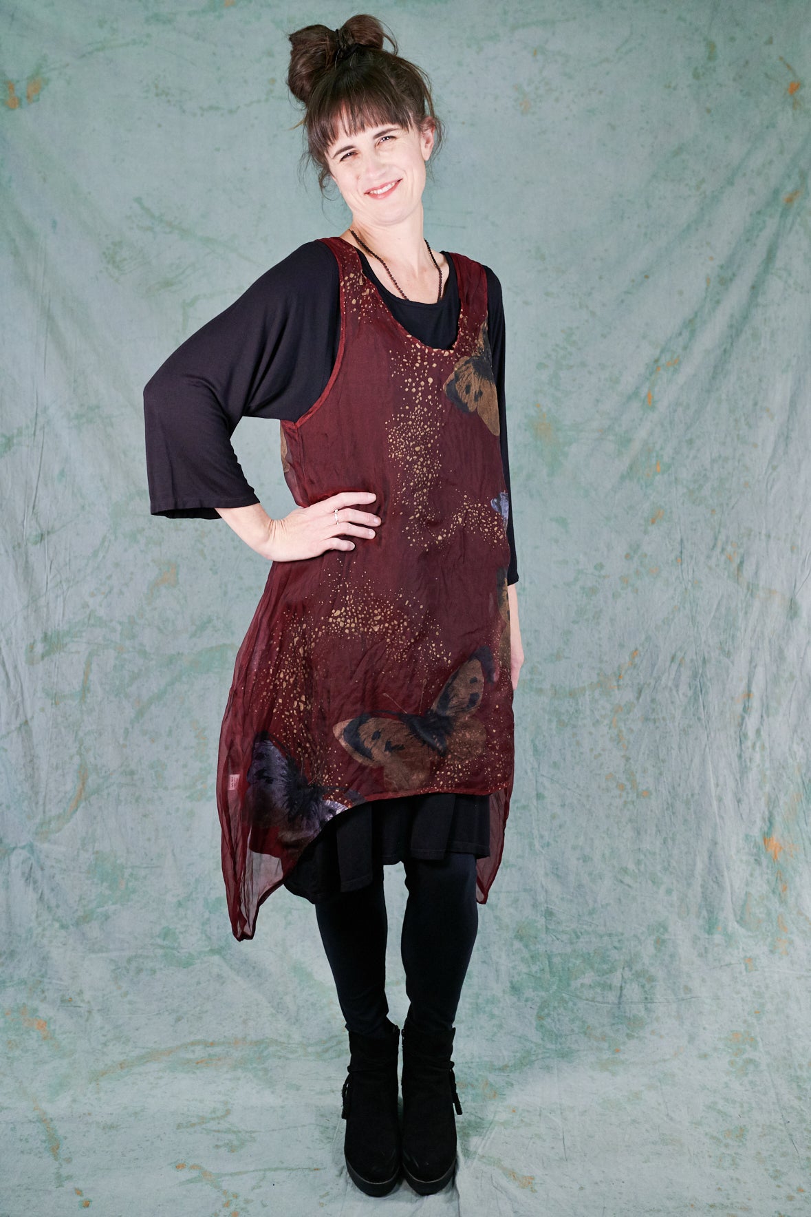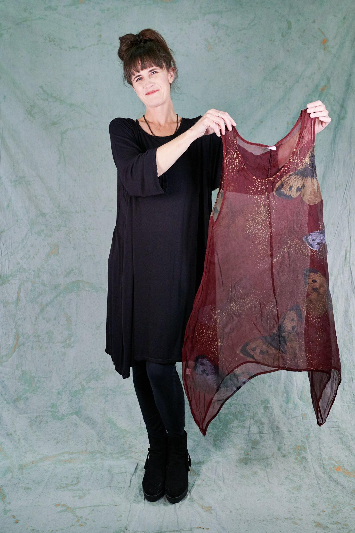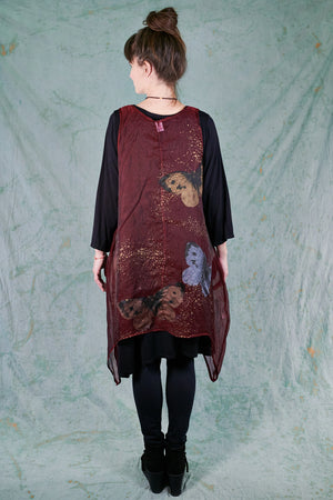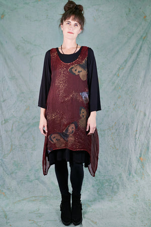 Layer this over black wide pants ( try our Klee pant or our Wide Petaloons ) and a black layer top...or any other deep earthy color that picks up the tones in the hand printing. This organza shift adds a sheer layer of elegance to a simple basic outfit, and allows you to walk into any event with confidence.