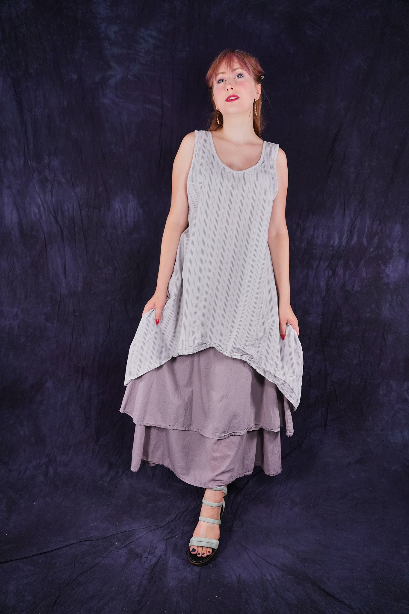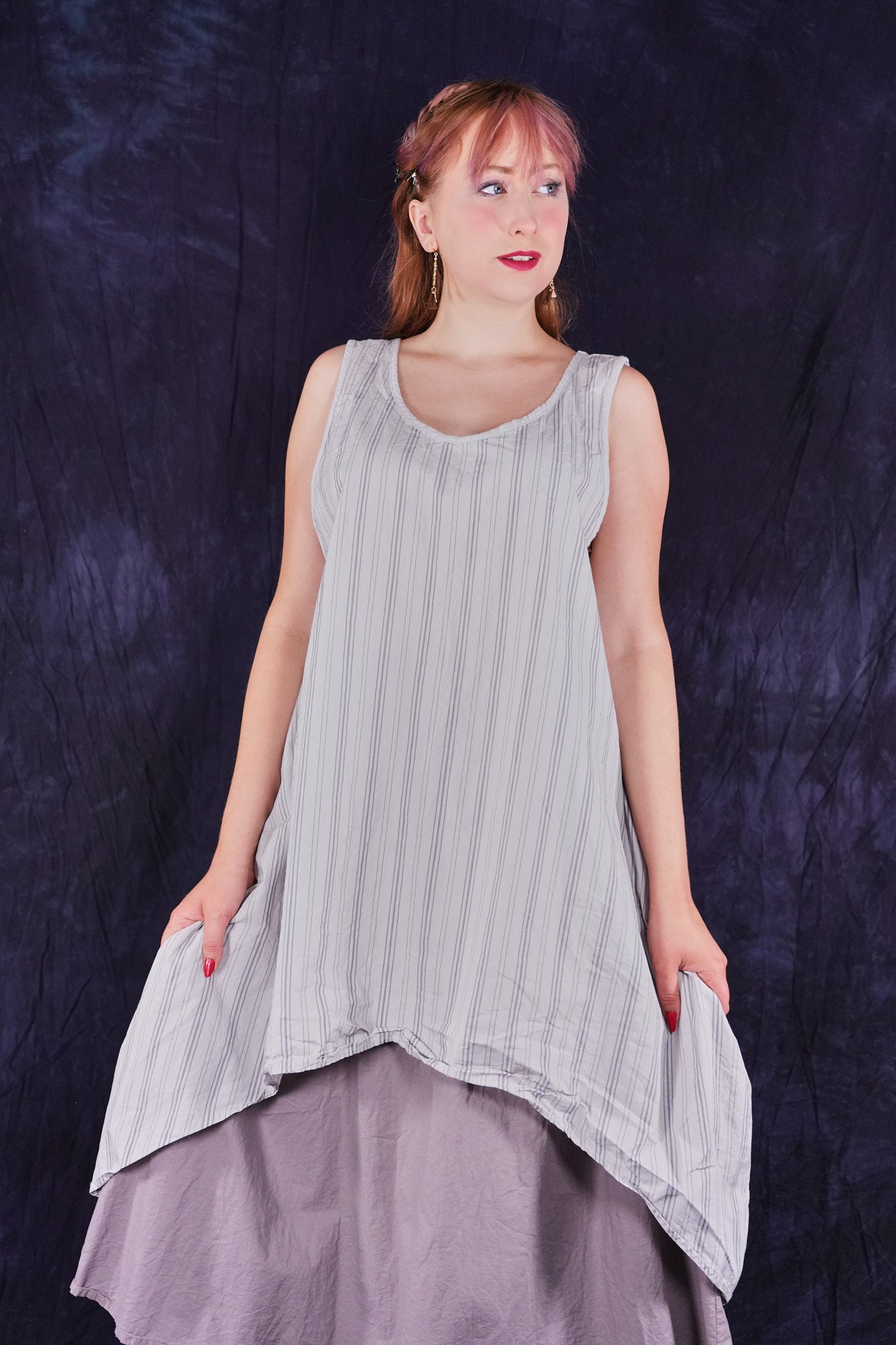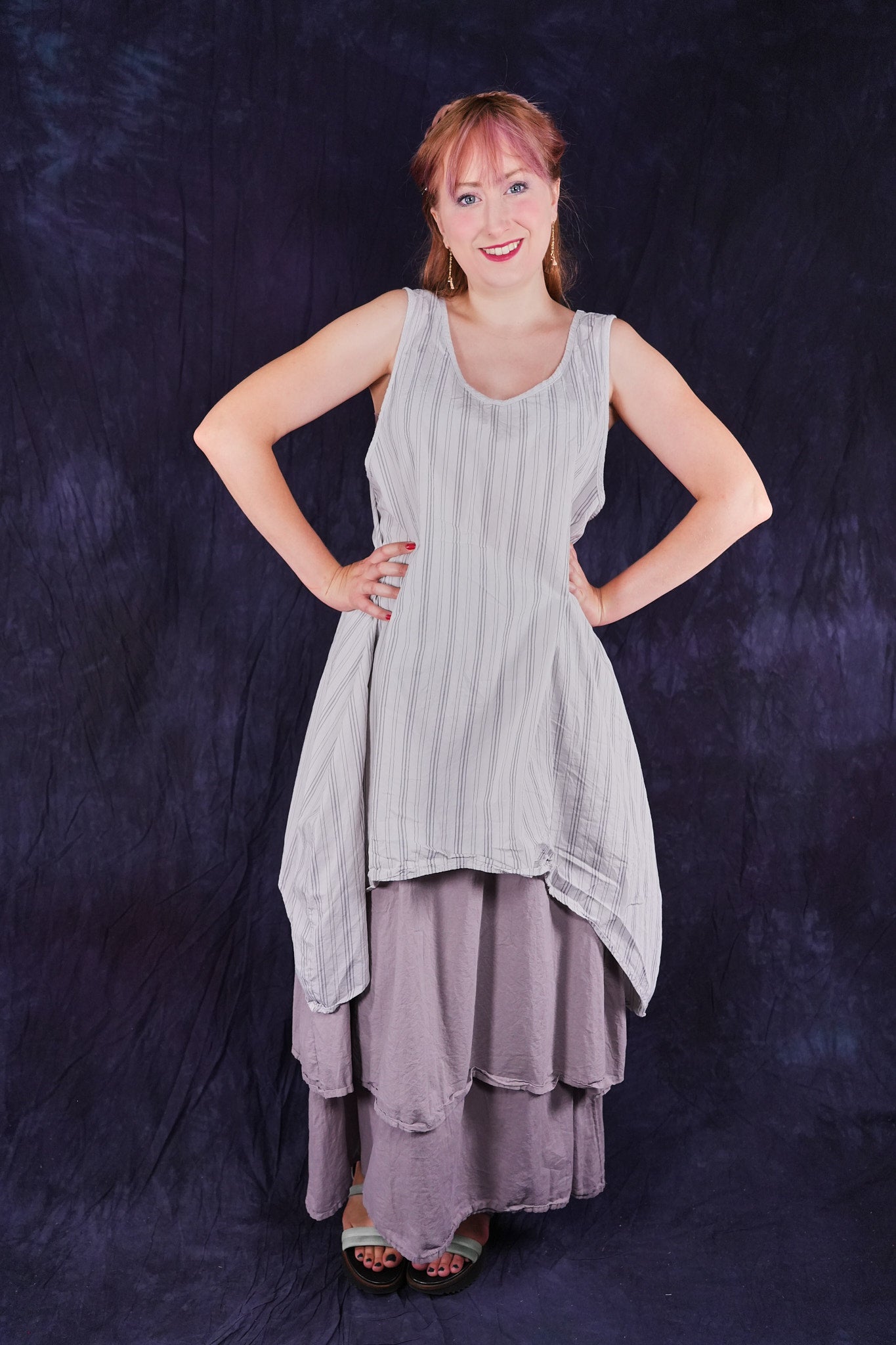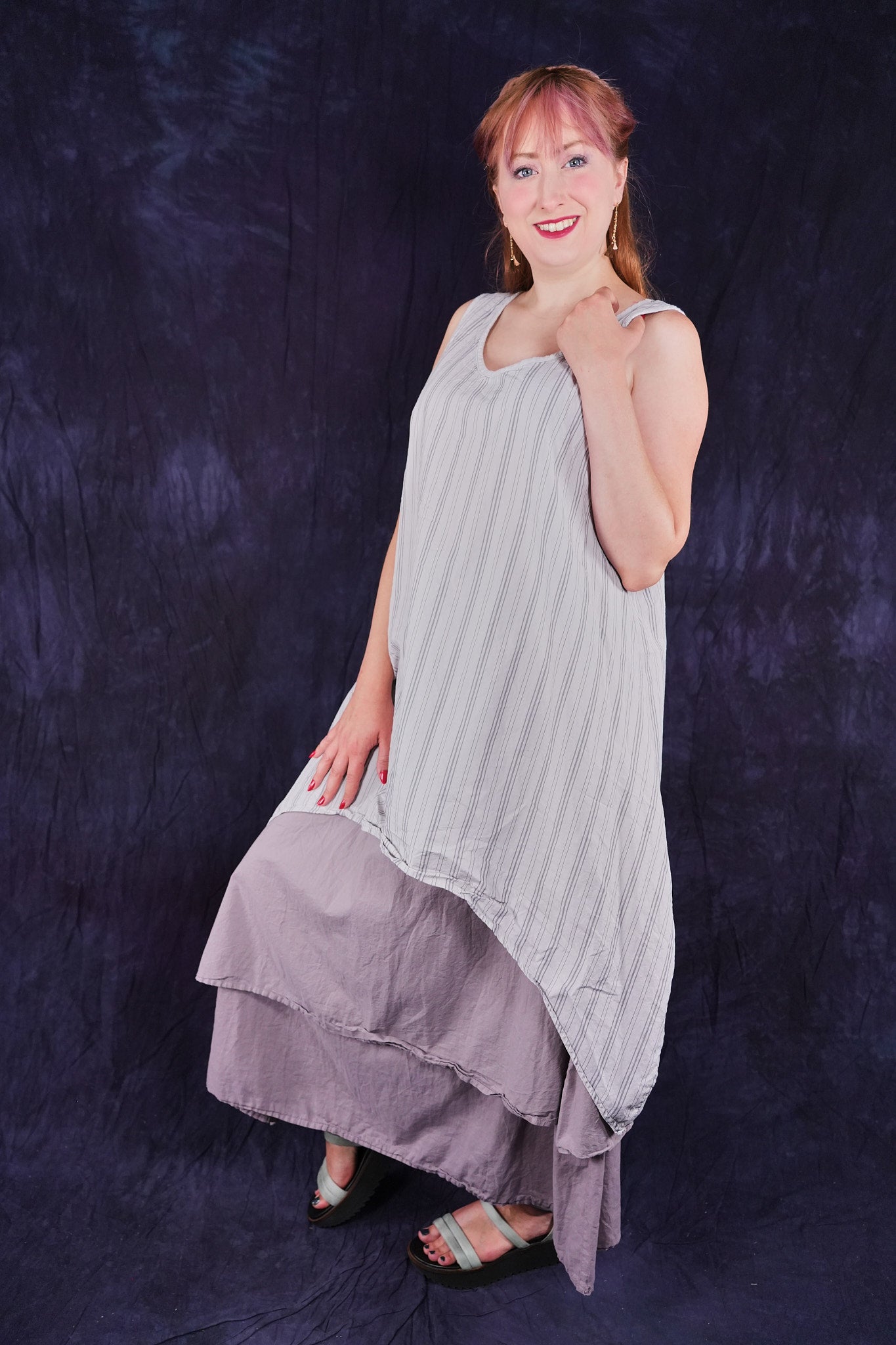 Beautiful, light-weight mid-layer with a stripe. Will keep you cool all season long. Wear alone or layer with ANYTHING! A tee, linen dress, tunic or a cardigan or sweatshirt. Looks great over pants or skirts. Try over the 4190 Double Layer Skirt or 3287 Cha Cha Pant.
