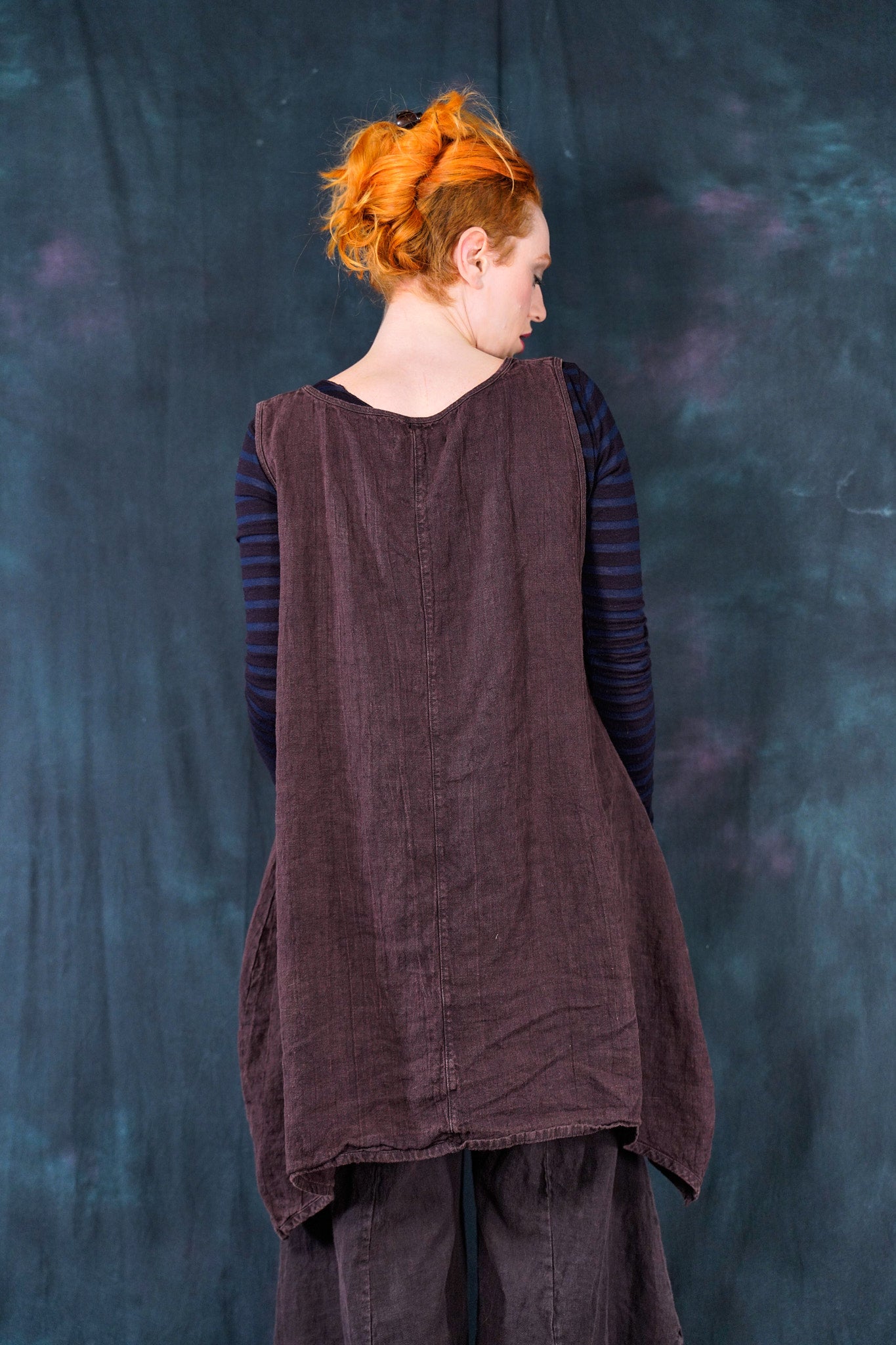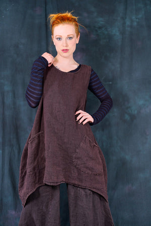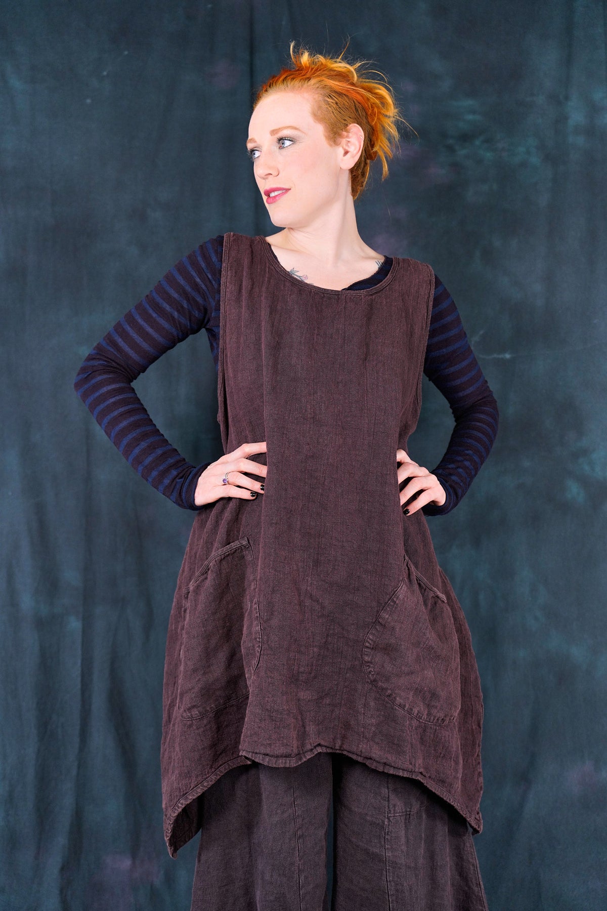 This is lagenlook at its best--a sleeveless midlayer shift that you can wear alone, over, or under all of your other pieces. This linen is breathable and a perfect weight for multi-season wear. Two large angled pockets on the front.
