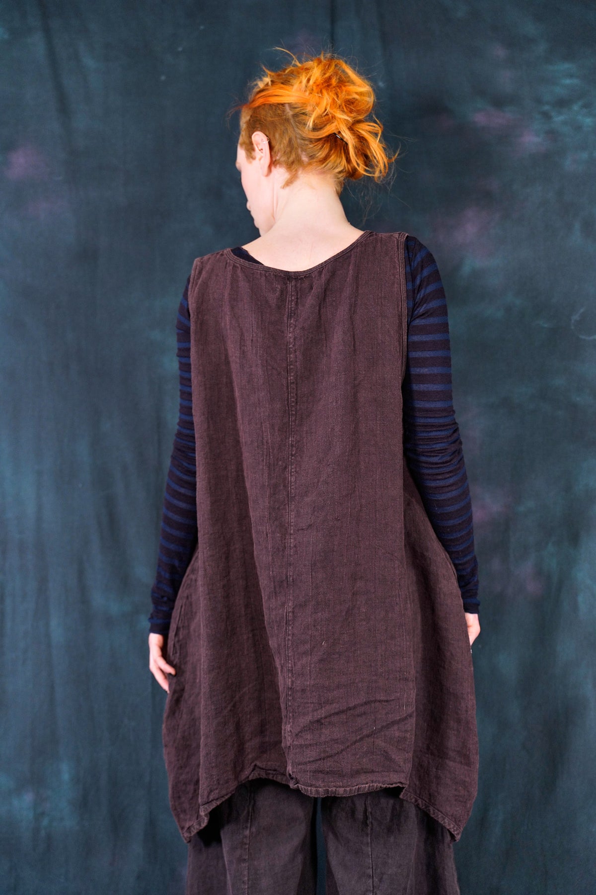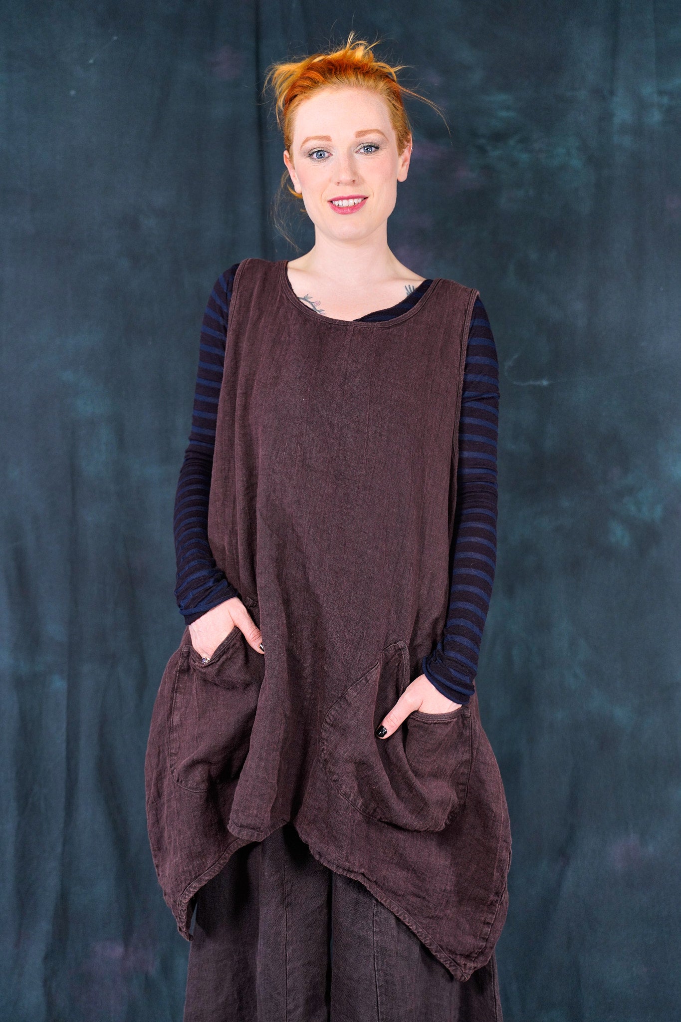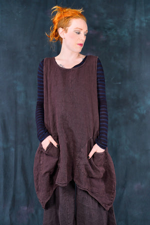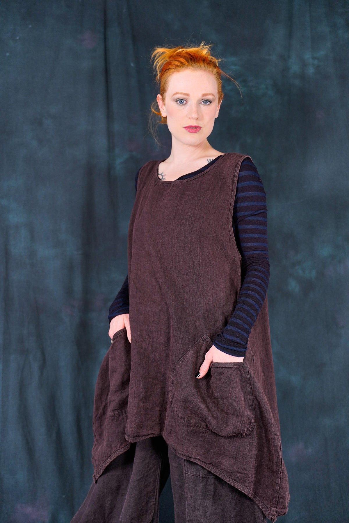 This is lagenlook at its best--a sleeveless midlayer shift that you can wear alone, over, or under all of your other pieces. This linen is breathable and a perfect weight for multi-season wear. Two large angled pockets on the front.