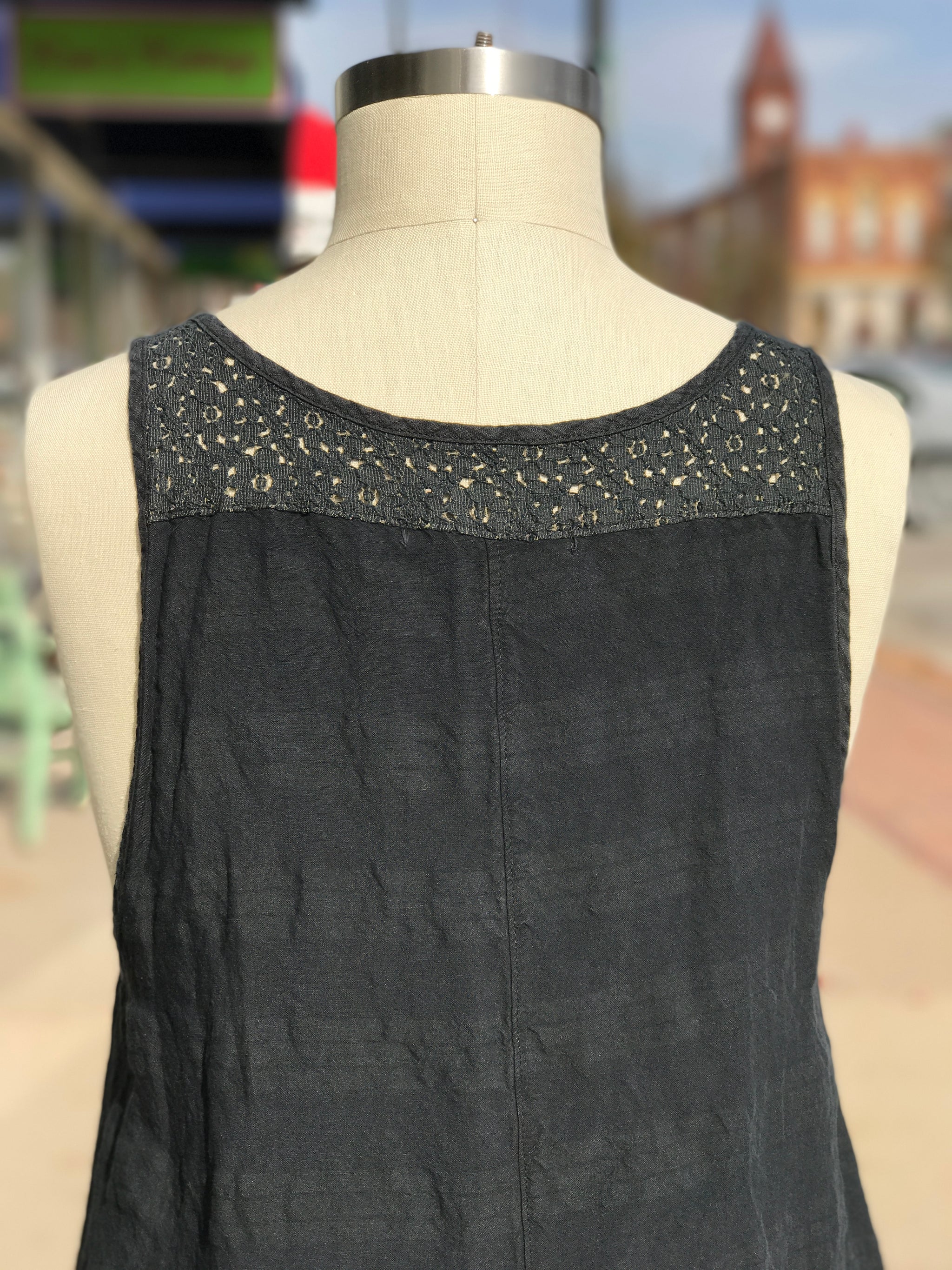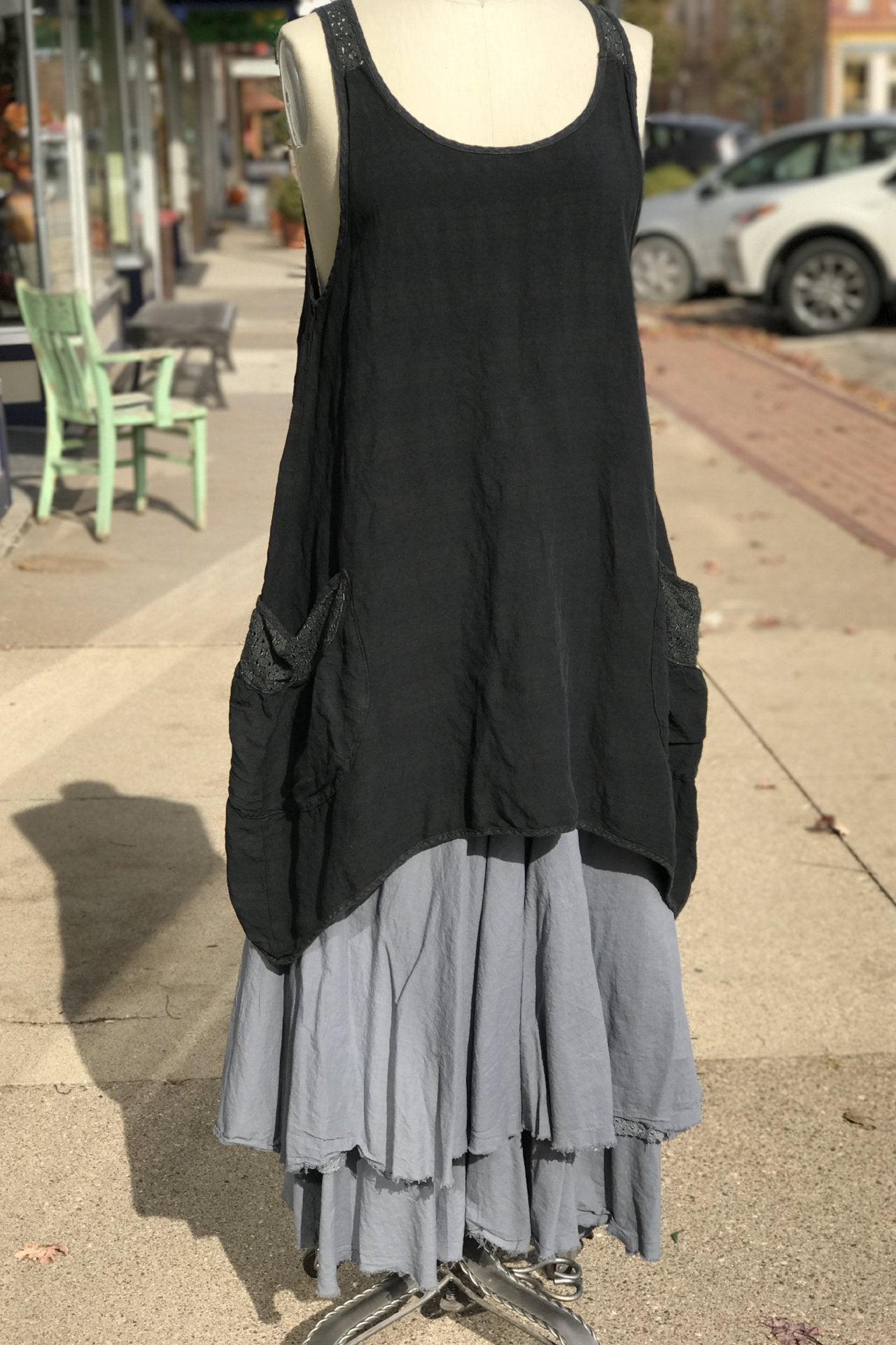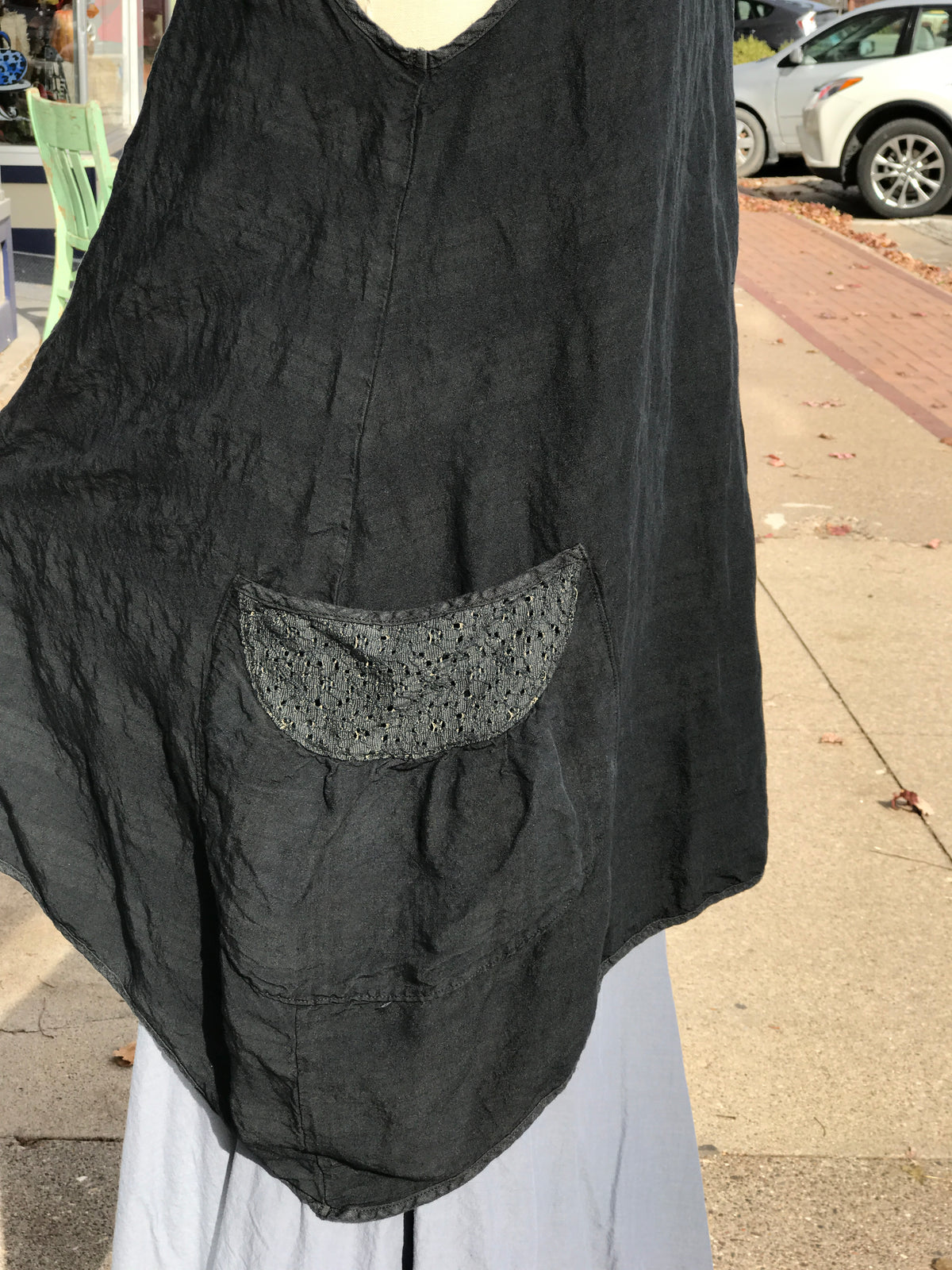 One of our favorite mid layers, this lace trimmed shift has an edge of elegance in it's shapely curves and comfortable and relaxed look. Wedges of lace trim both deep pockets. A section of lace adorns the area on the shoulder strap and across the top of the back. Very subtle, overdyed in subtle tones.