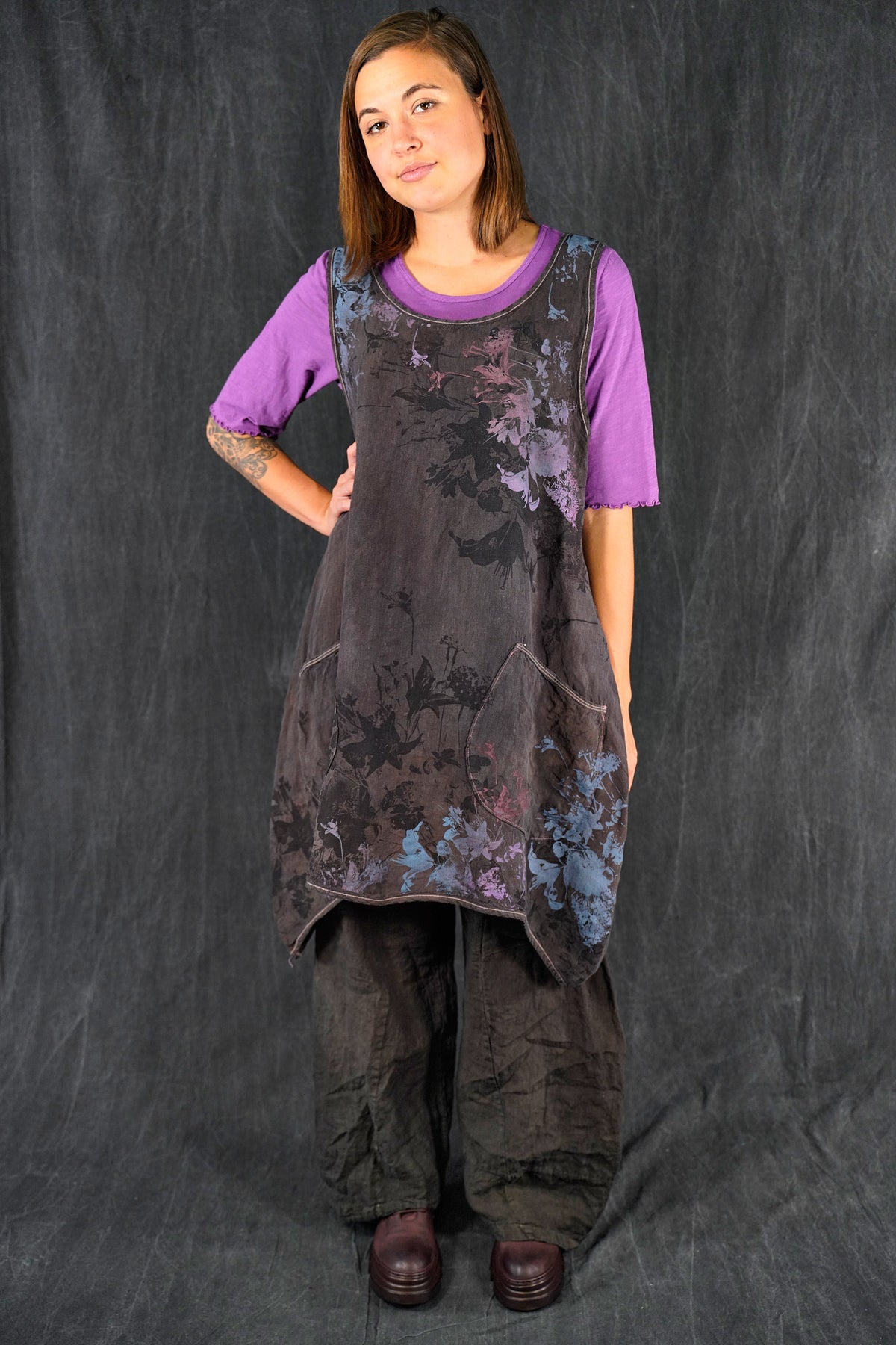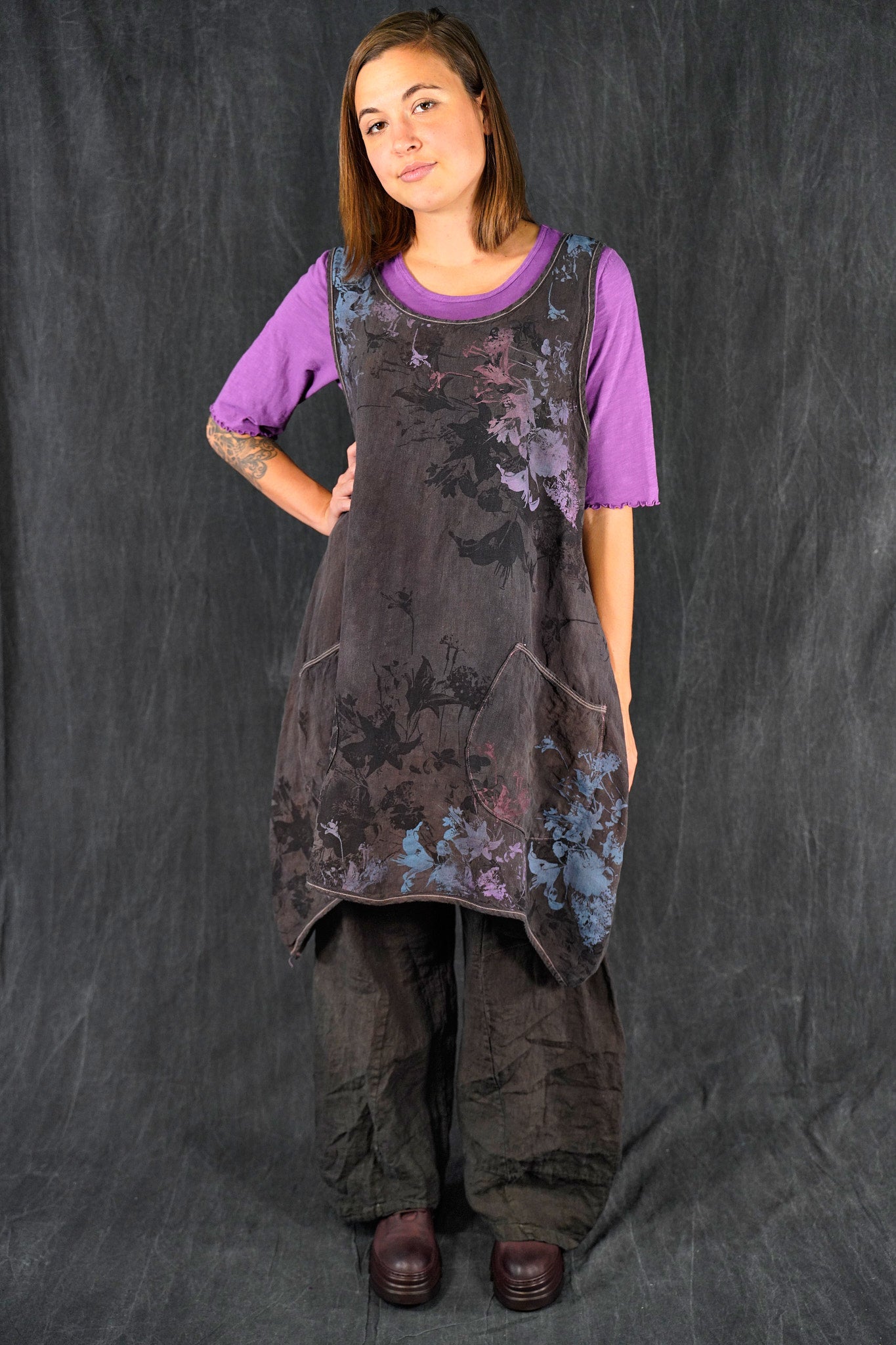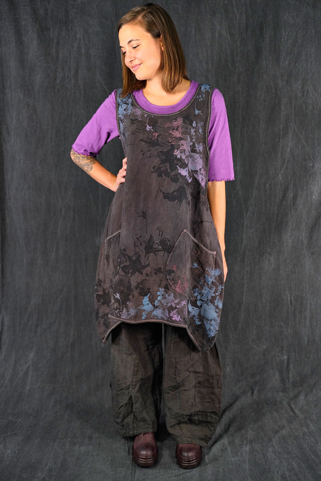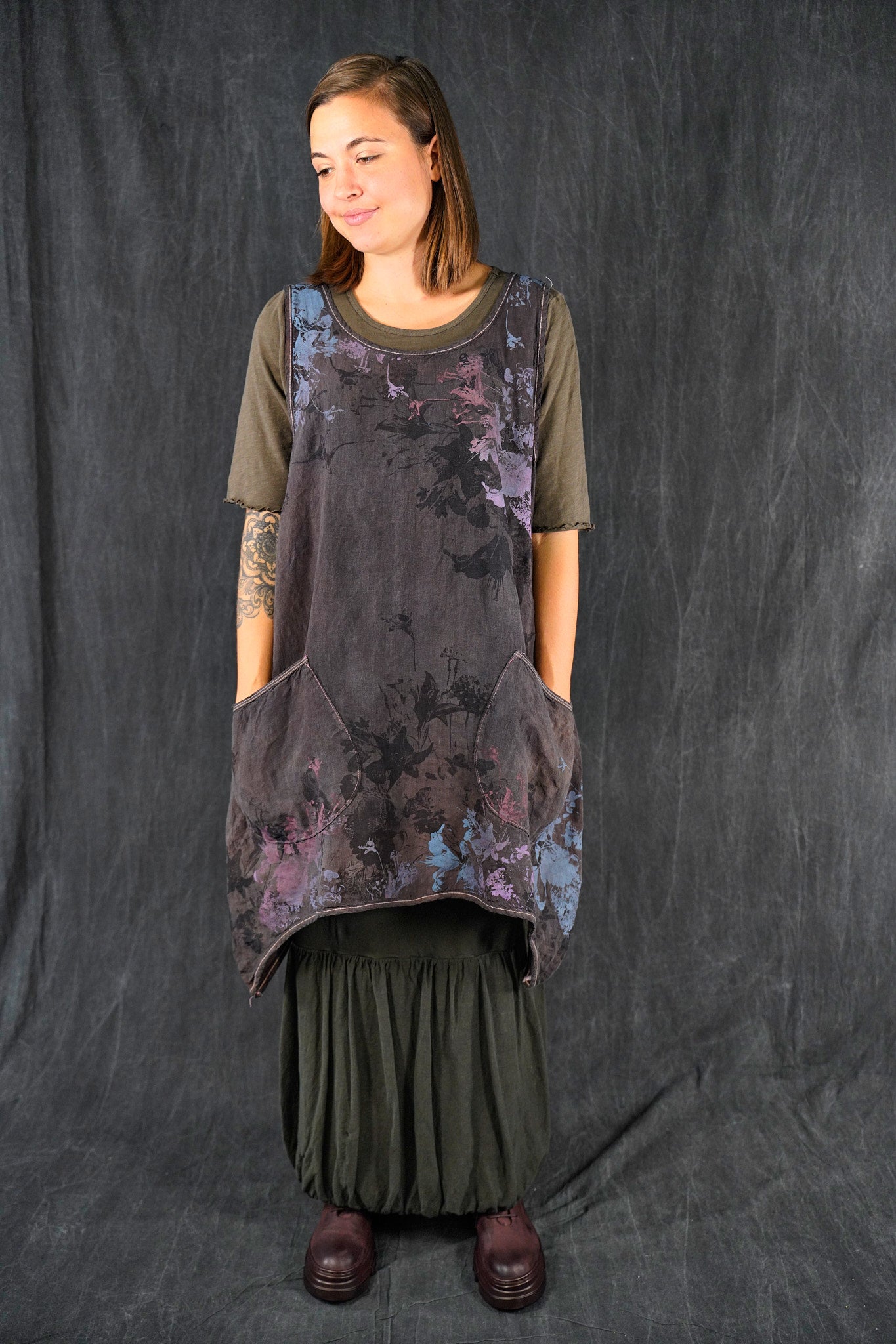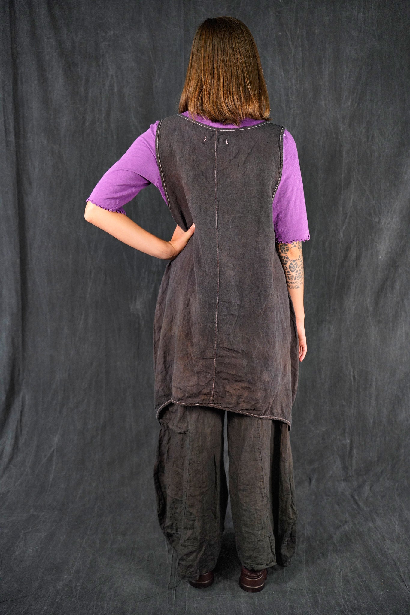 This is lagenlook at its best--a hand dyed sleeveless midlayer shift that you can wear alone, over, or under all of your other pieces. This linen is breathable and a perfect weight for multi-season wear. Two large angled pockets on the front.