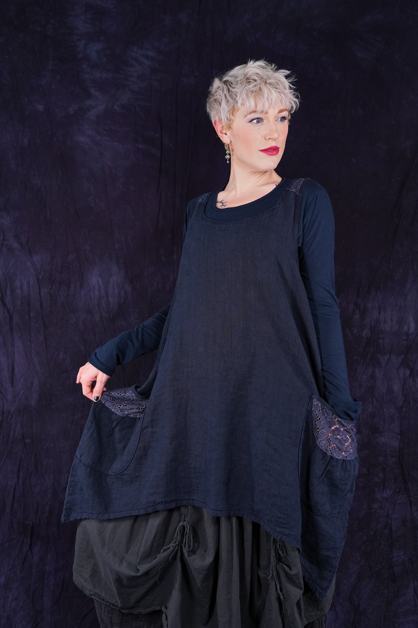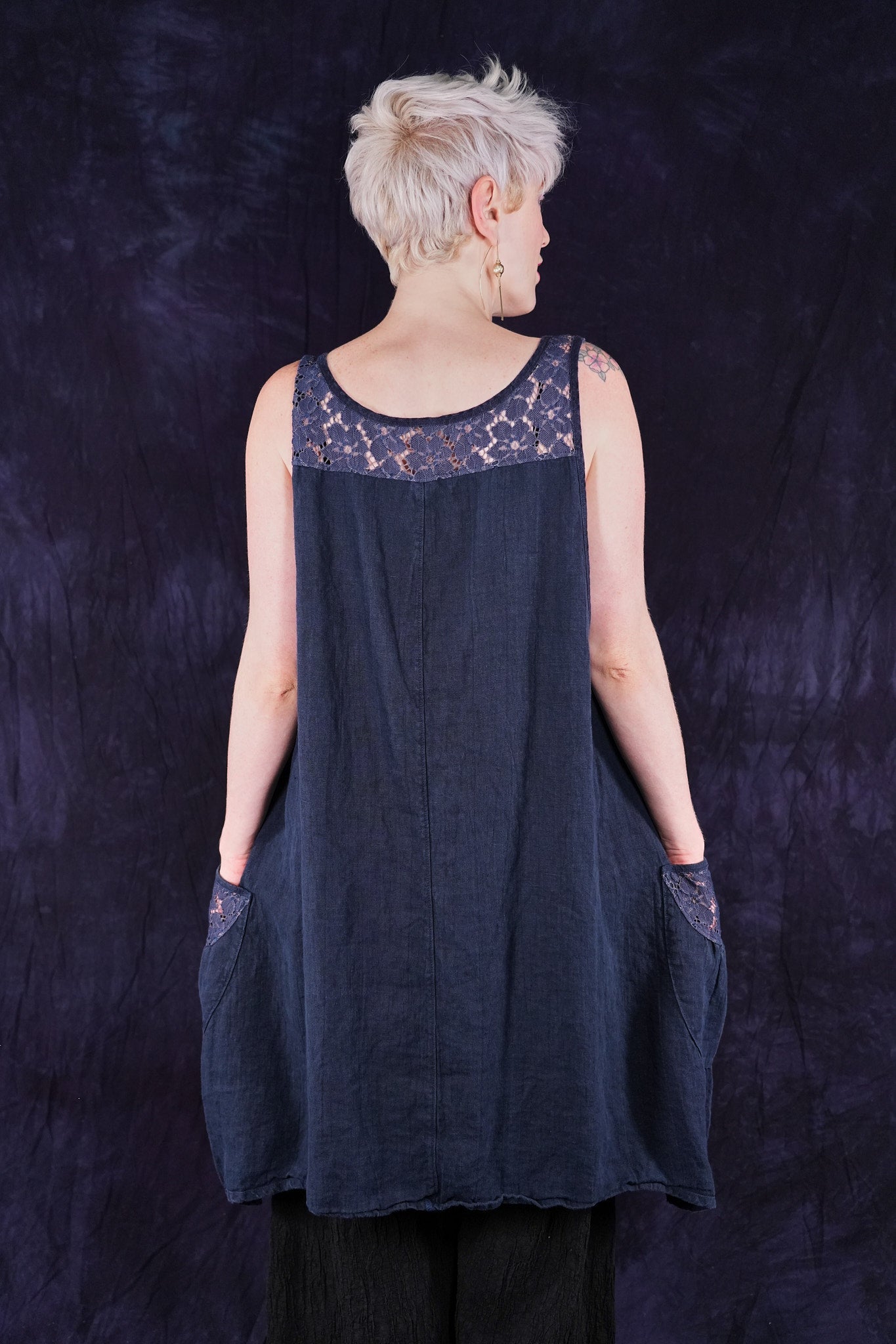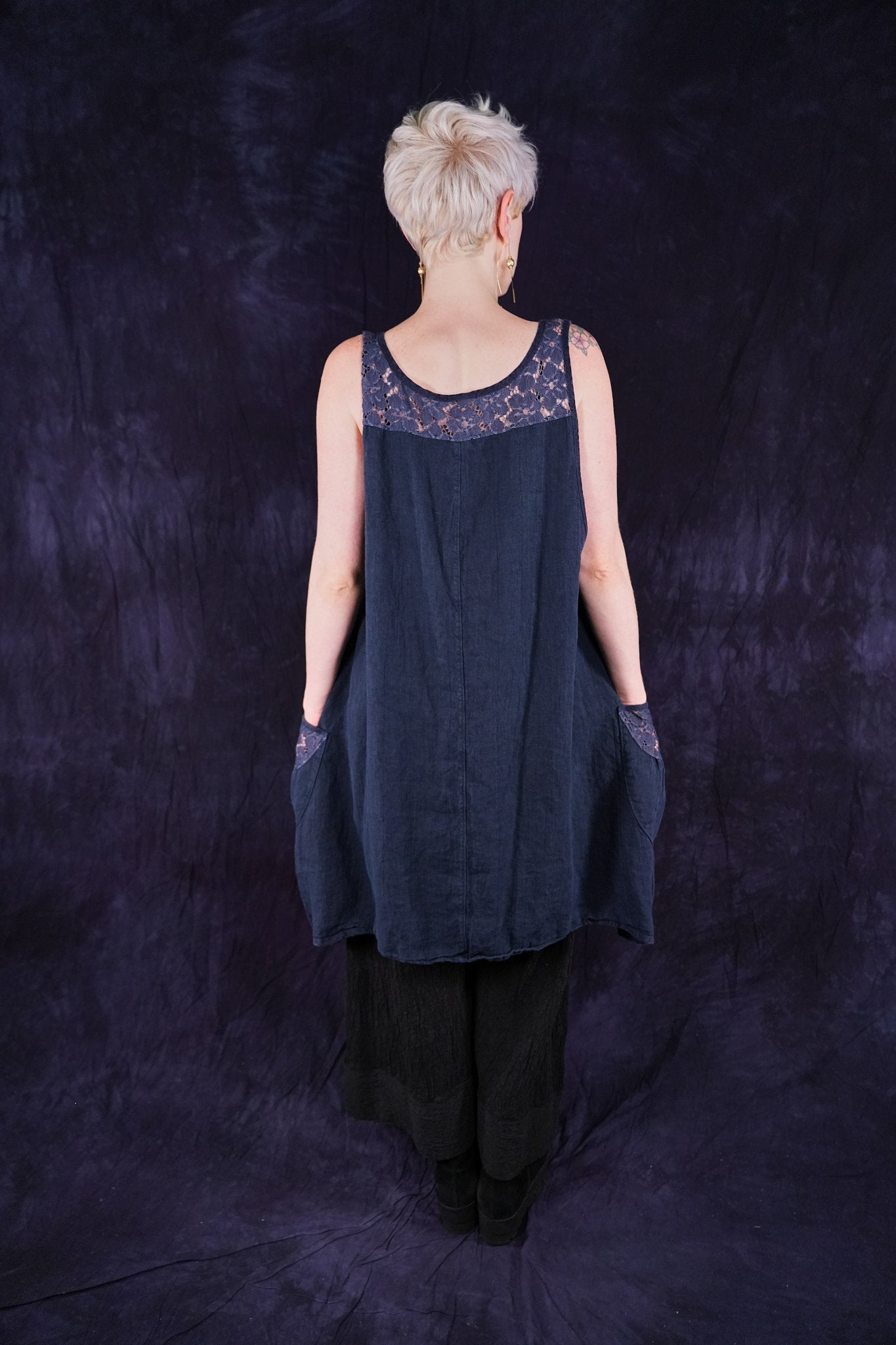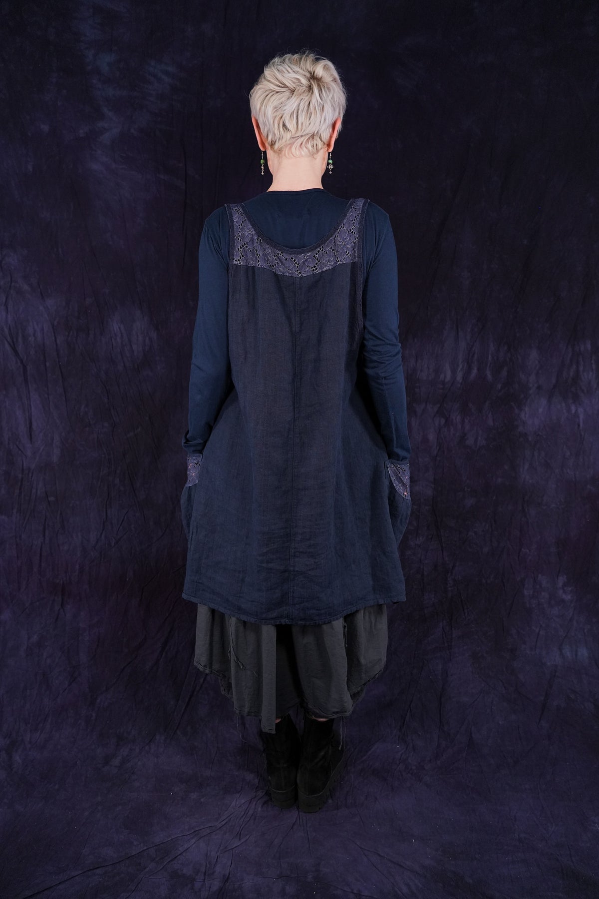 Layer over a long sleeved top or wear alone...A beautiful TIMELESS PIECE IN A CLASSIC COLOR. One of our favorite mid layers, this lace trimmed shift has an edge of elegance in it's shapely curves and comfortable and relaxed look. Wedges of lace trim both deep pockets as well as the upper area of the back.