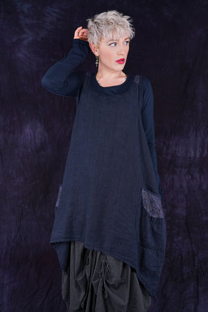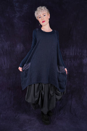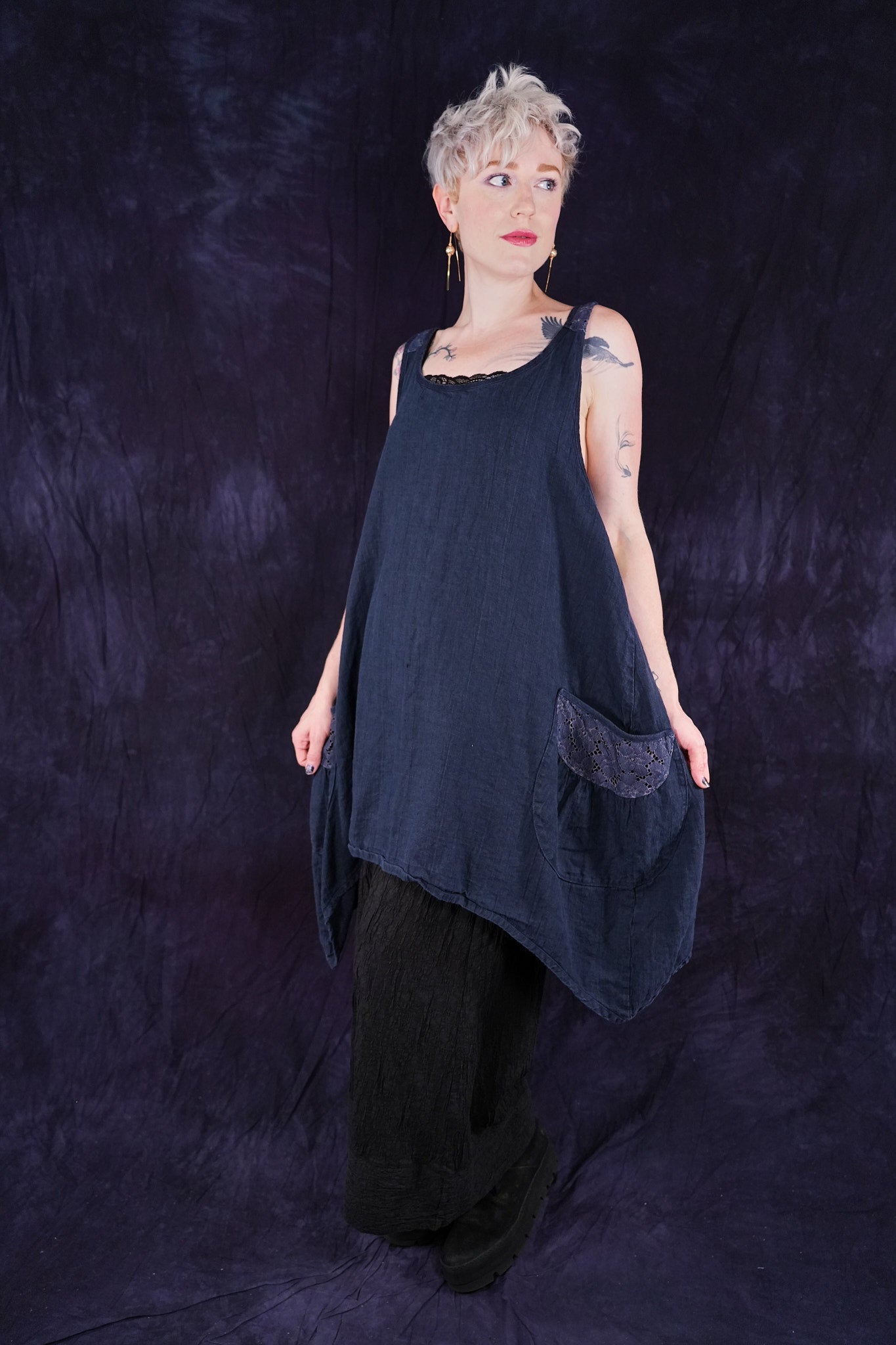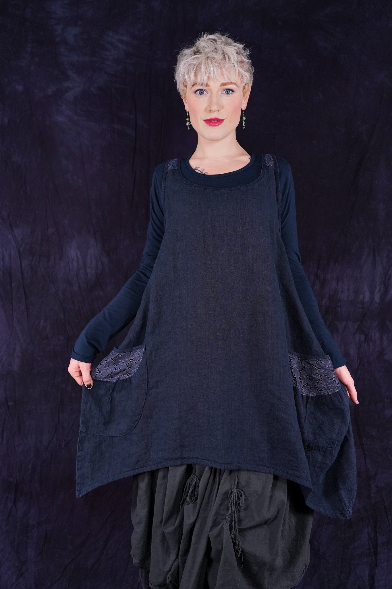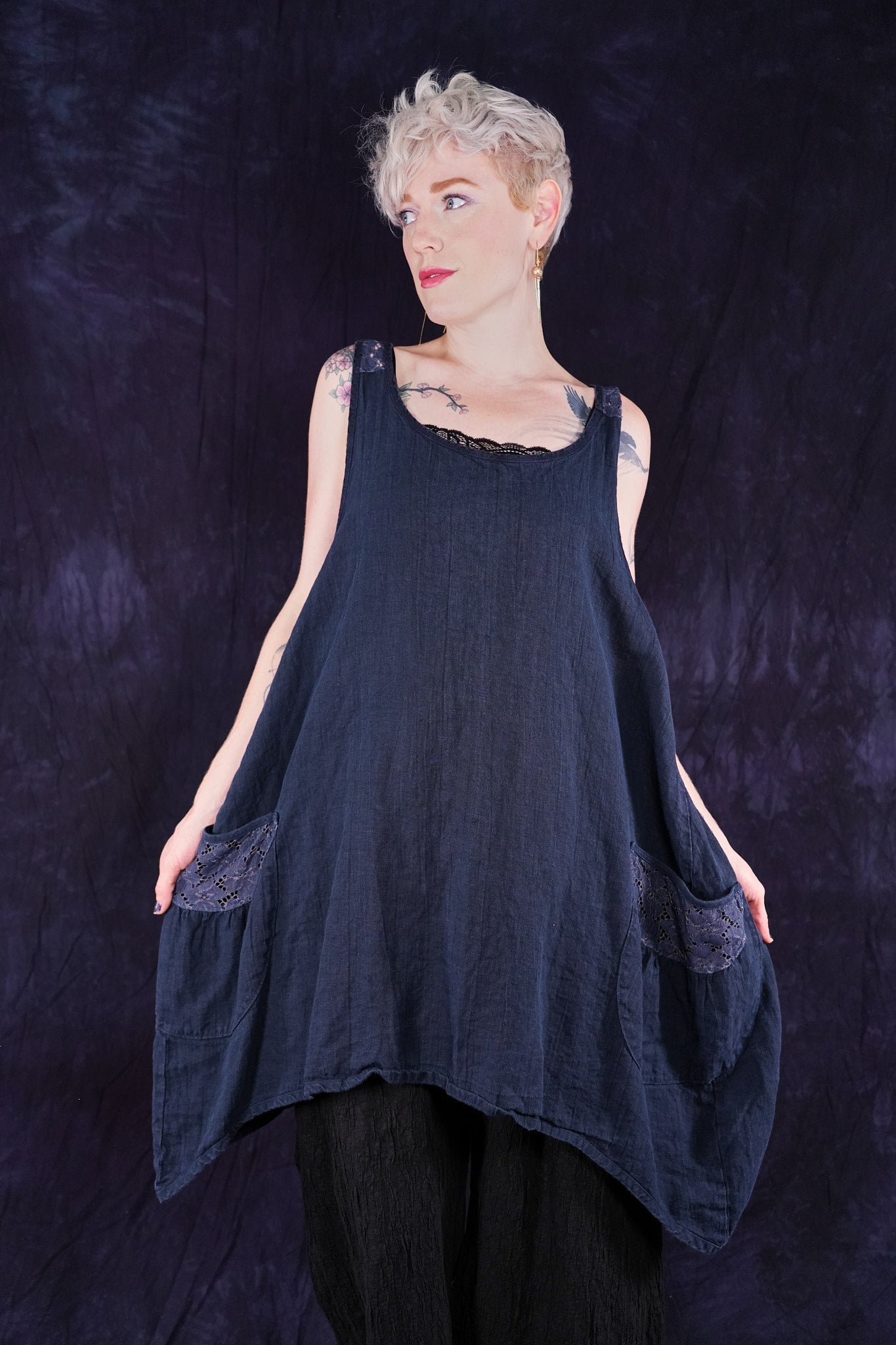 Layer over a long sleeved top or wear alone...A beautiful TIMELESS PIECE IN A CLASSIC COLOR. One of our favorite mid layers, this lace trimmed shift has an edge of elegance in it's shapely curves and comfortable and relaxed look. Wedges of lace trim both deep pockets as well as the upper area of the back.