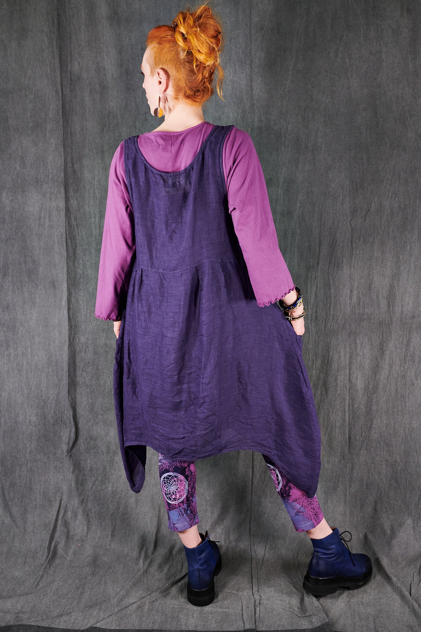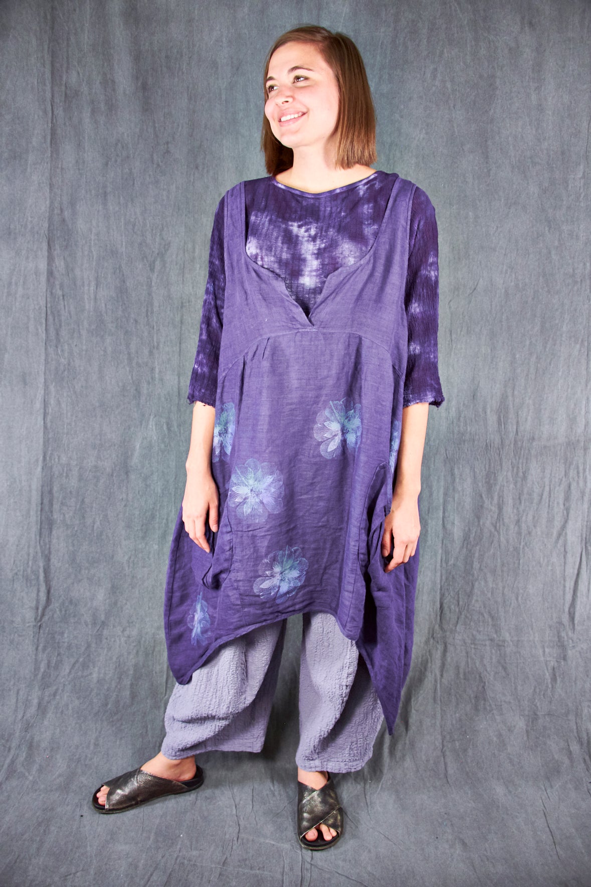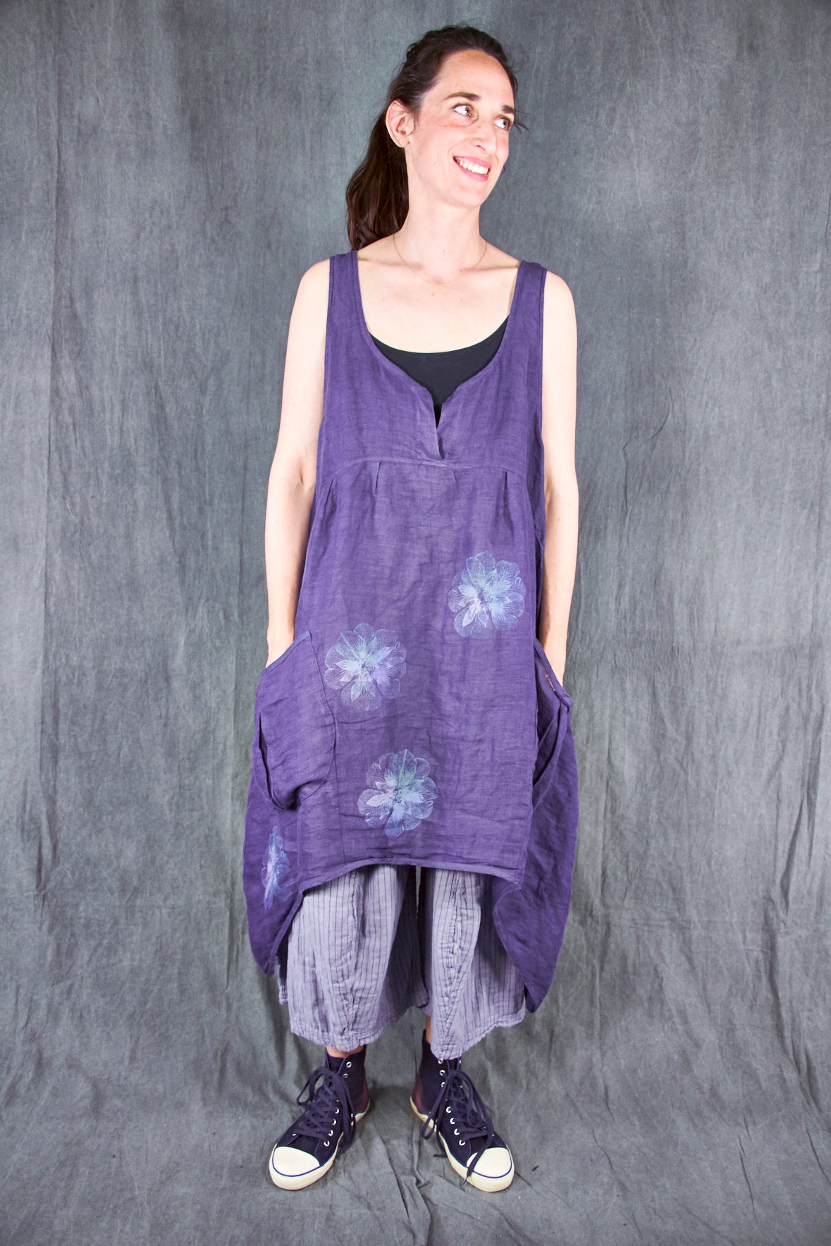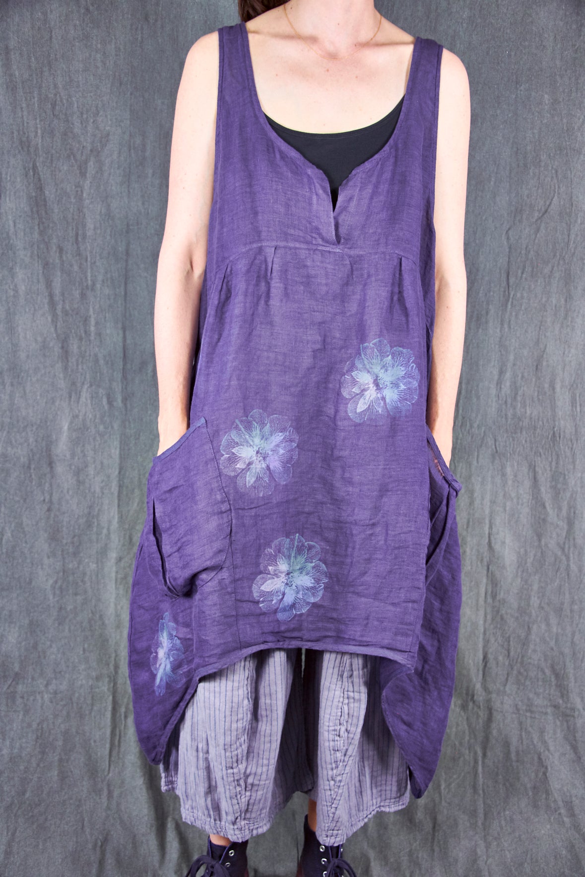 A gorgeous light-as-air shift featuring an open neckline with our favorite over-sized pockets, perhaps for stowing away seashells collected on a stroll by the beach. This shift transforms from a day at the beach, to an evening out as elegantly as you can imagine. Dress it up with a pair of heels, a beautiful necklace, and a shawl. Paired here with #3258 Double Gauze Striped Mojo Pants.